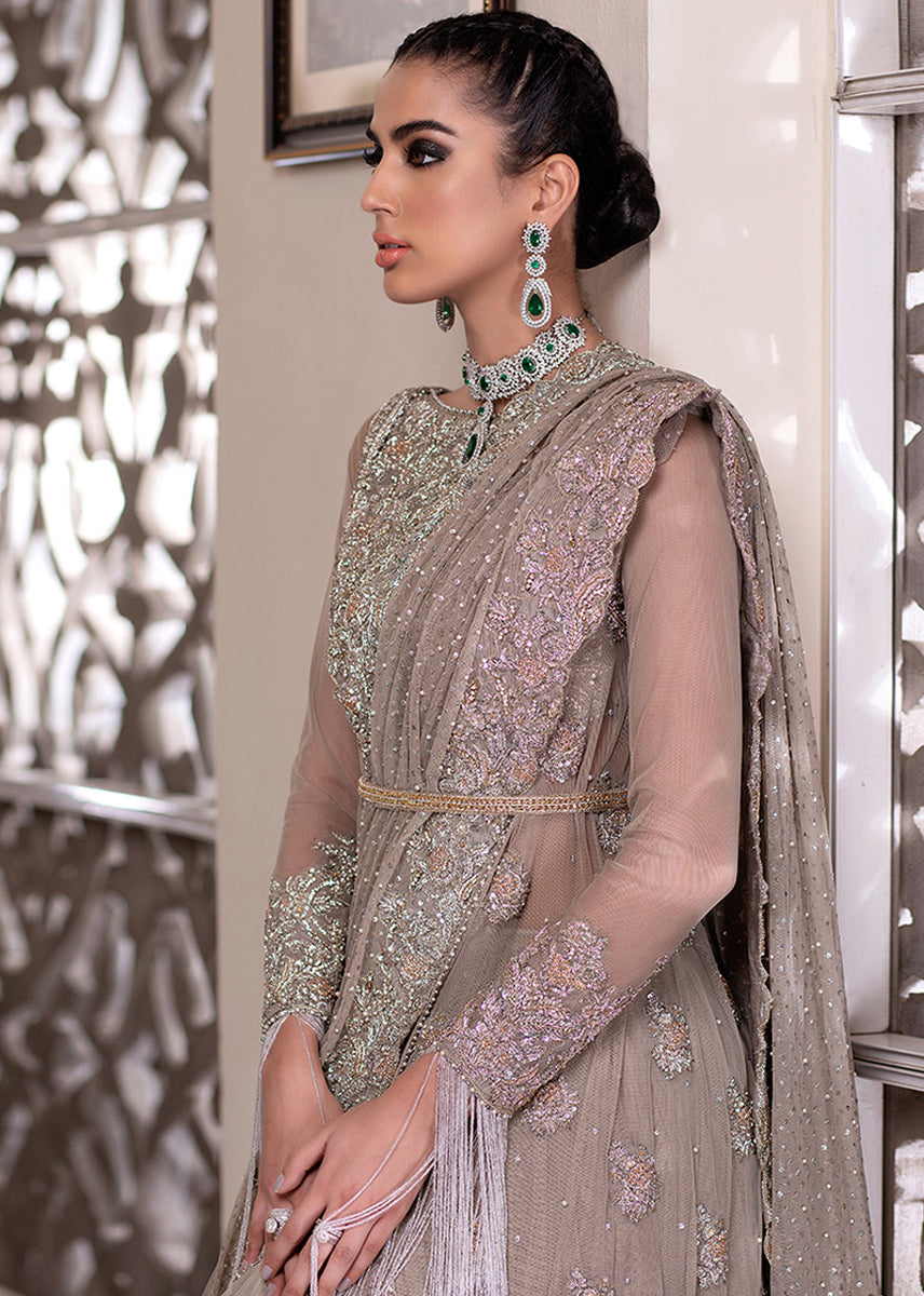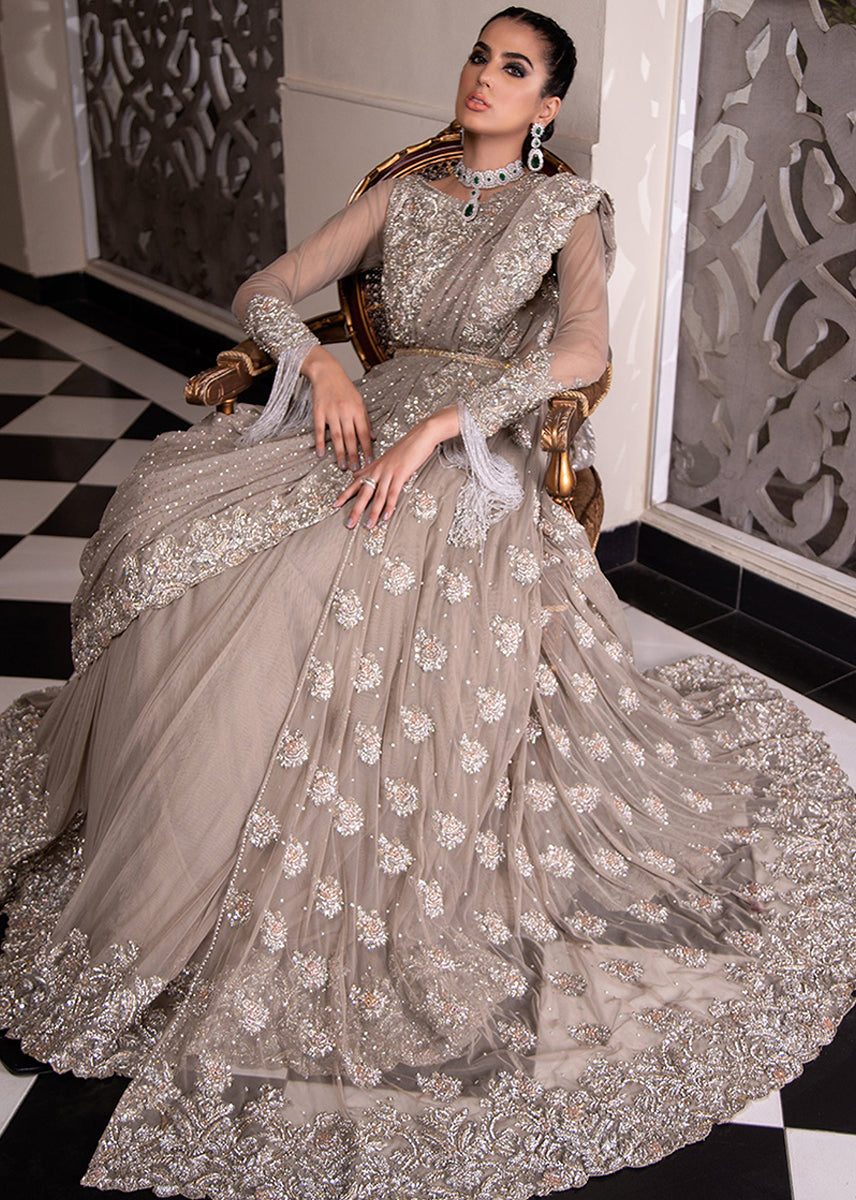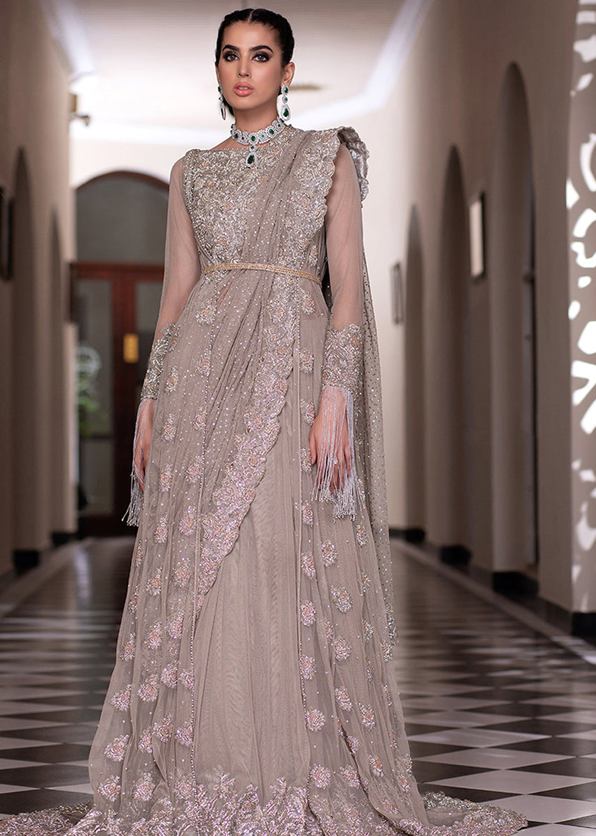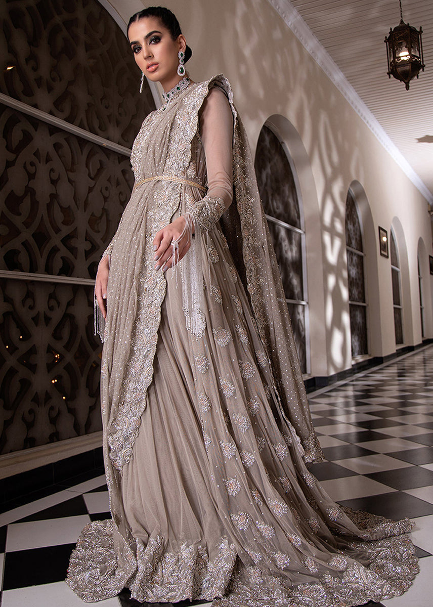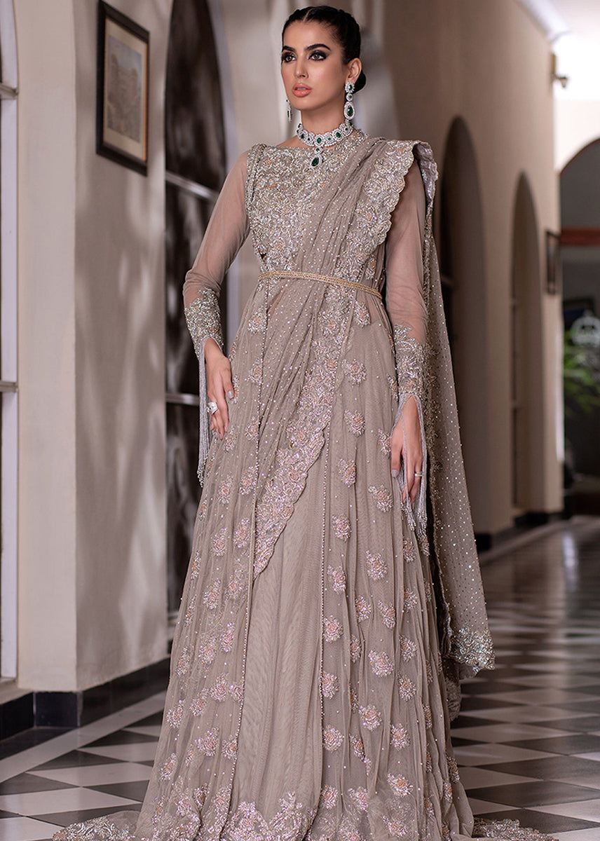This beautiful dusky beige Outfit is redefining the traditional wear with the modern touch of Front open Floor Length Gown.