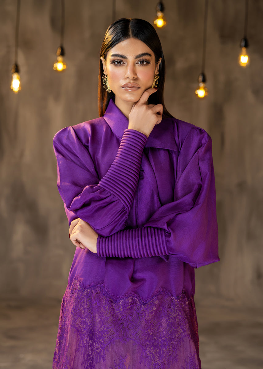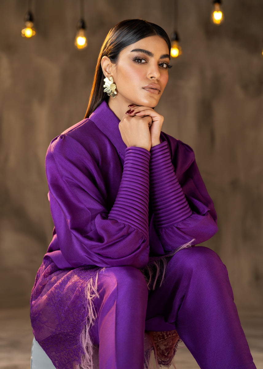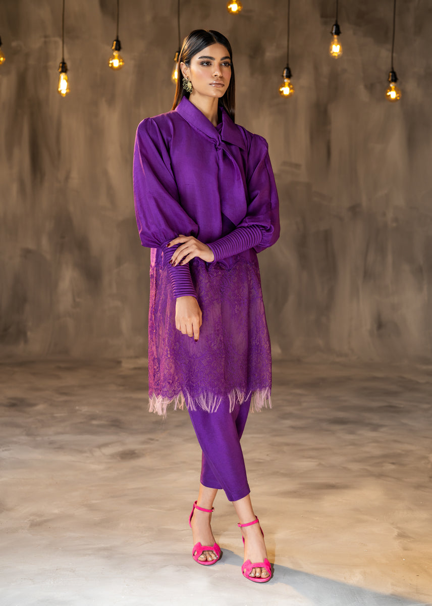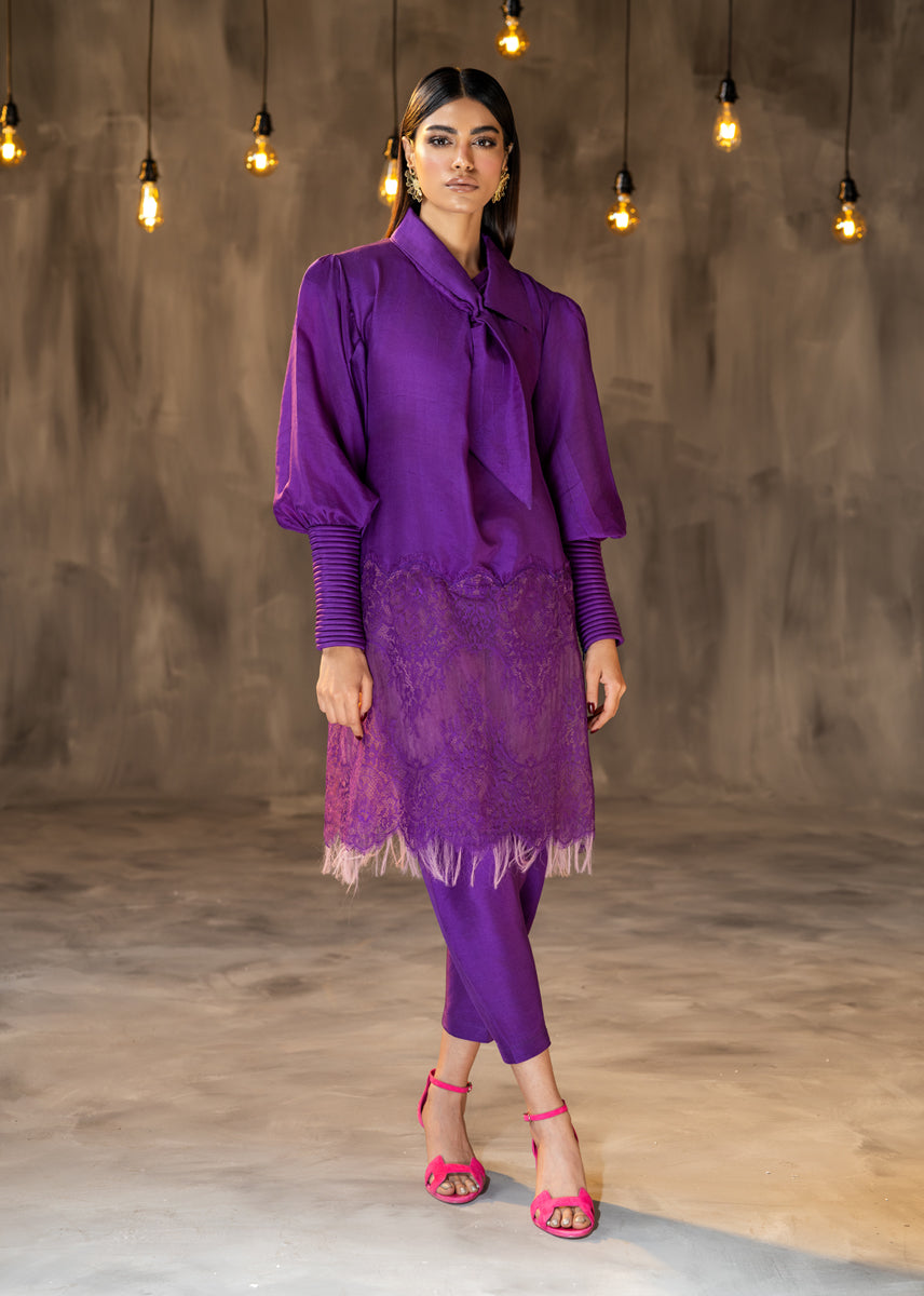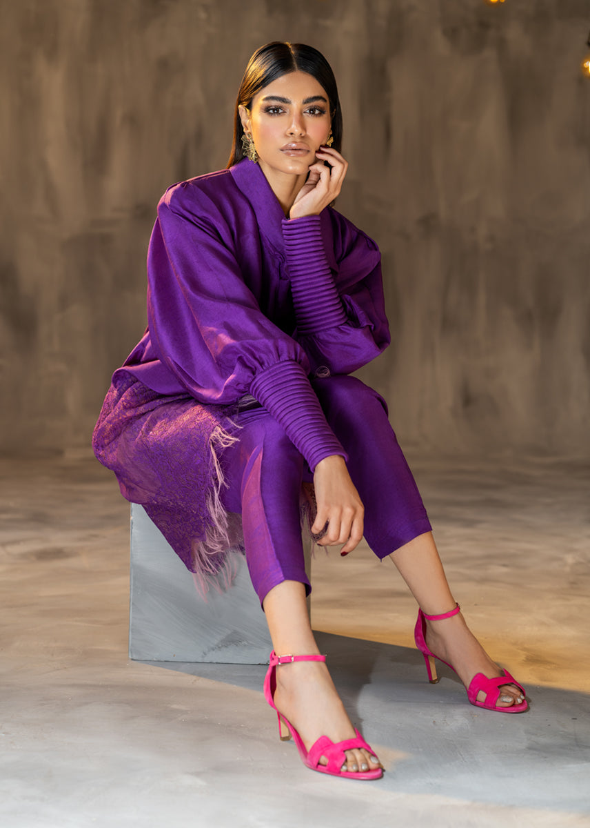Be bang on trend with this aesthetically curated deep purple two piece ensemble, a hue perfect for this summer season. The pure raw silk short shirt styled with bubble cuff sleeves and a unique collared neckline add to the omph and zest of the silhouette. The daaman of the shirt is lined with chantilly lace and finished with blush organza fringes tailored to perfection. It comes with a structured pant shalwar to complete the look.