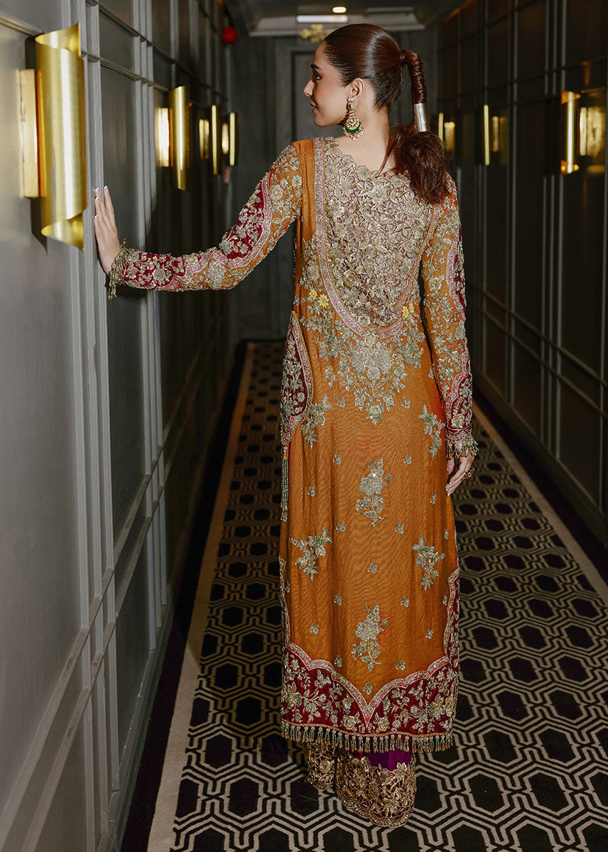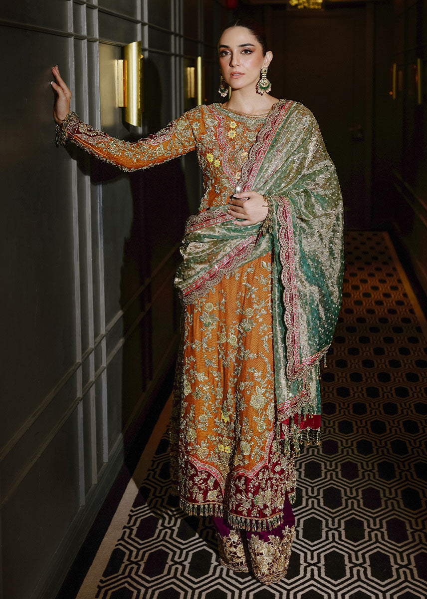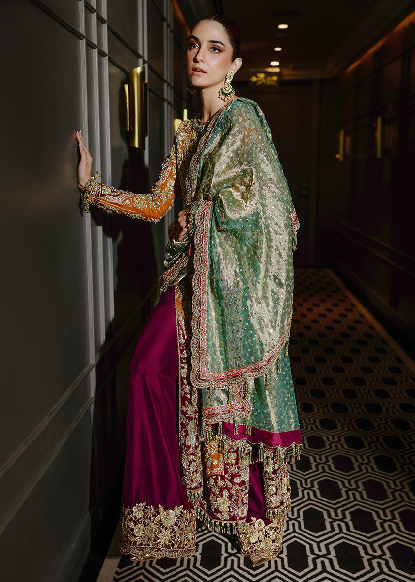 The Bahisht Gul outfit is an exquisite choice for those who seek a blend of tradition and modernity. Its vibrant yet balanced design radiates grace, making it a standout piece for any festive or formal occasion.