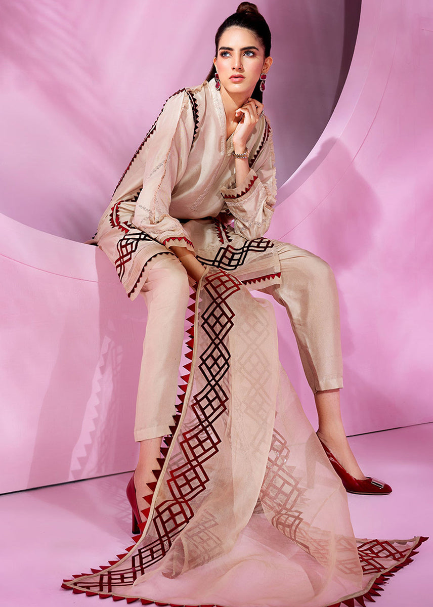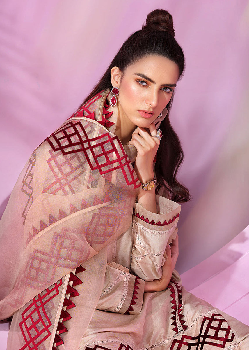 Pure raw silk with deep maroon cut work borders and scallops accentuated by organza trims.