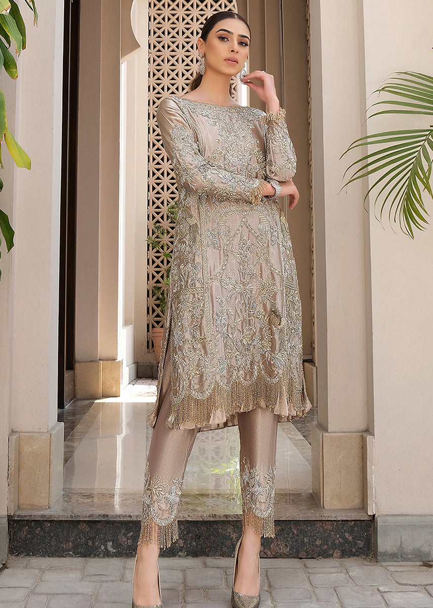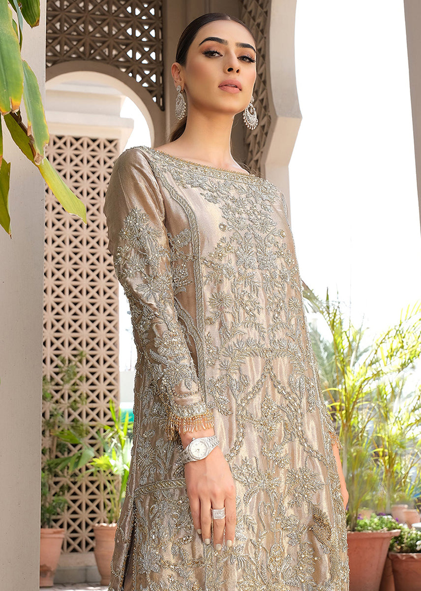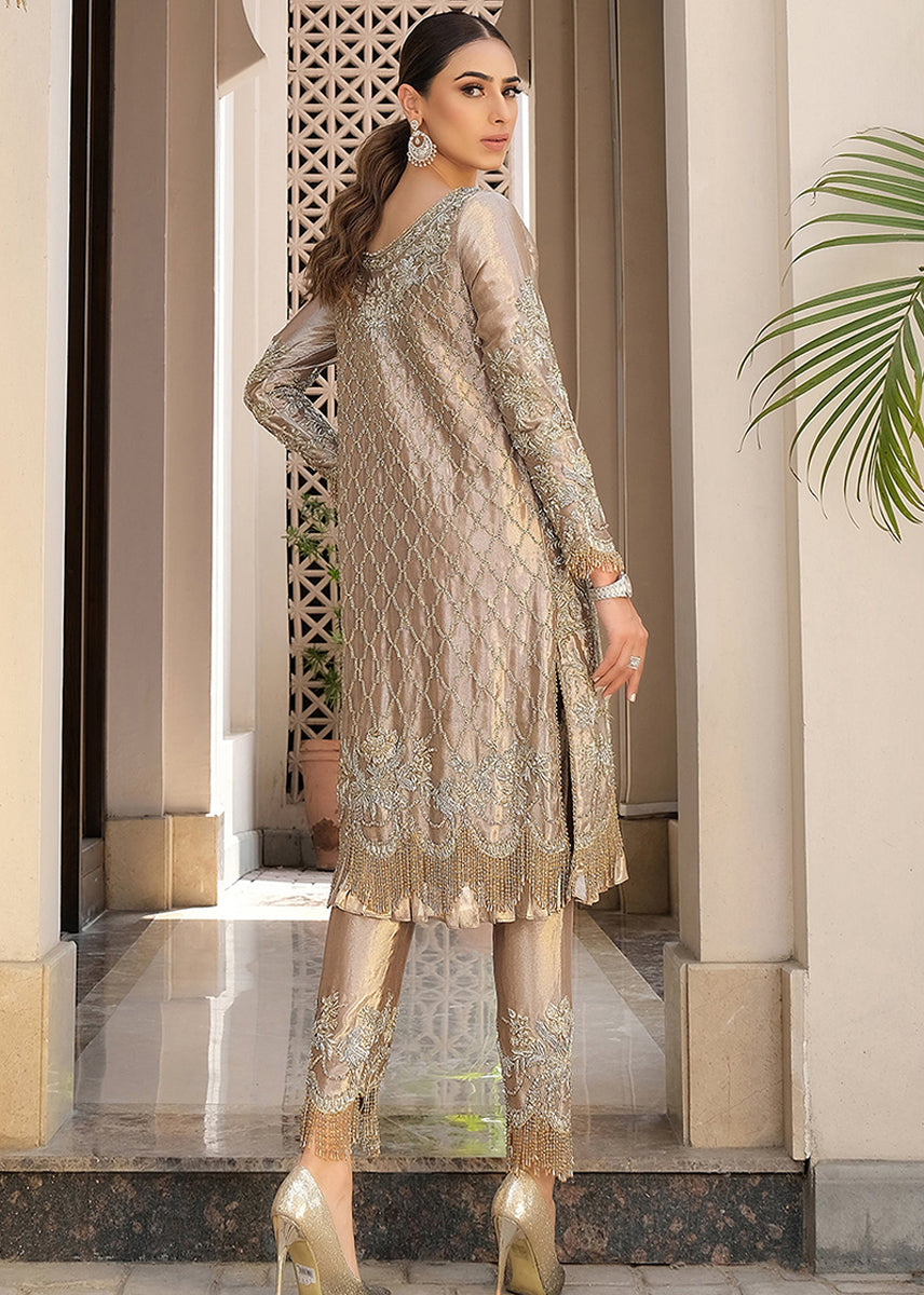 Evoking a new sleek look this season with subtle stylish cuts, Champagne gold shirt paired with equally embellished pants.