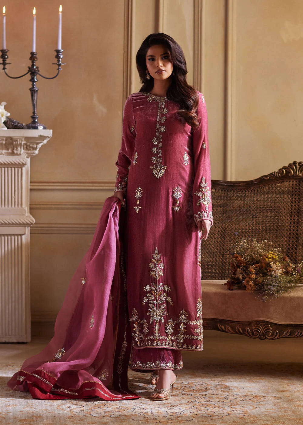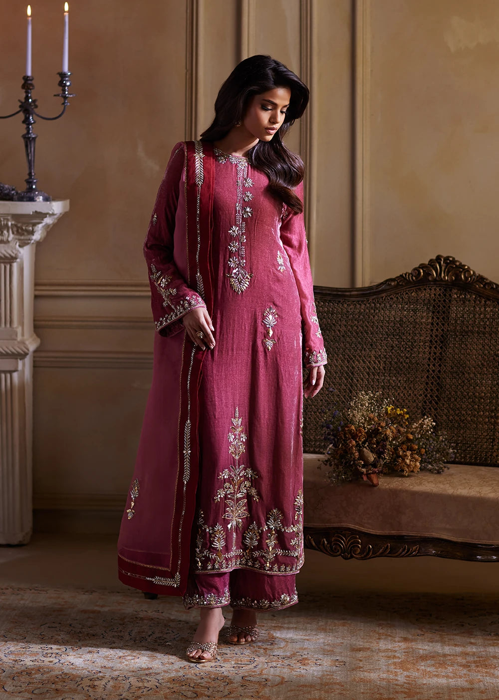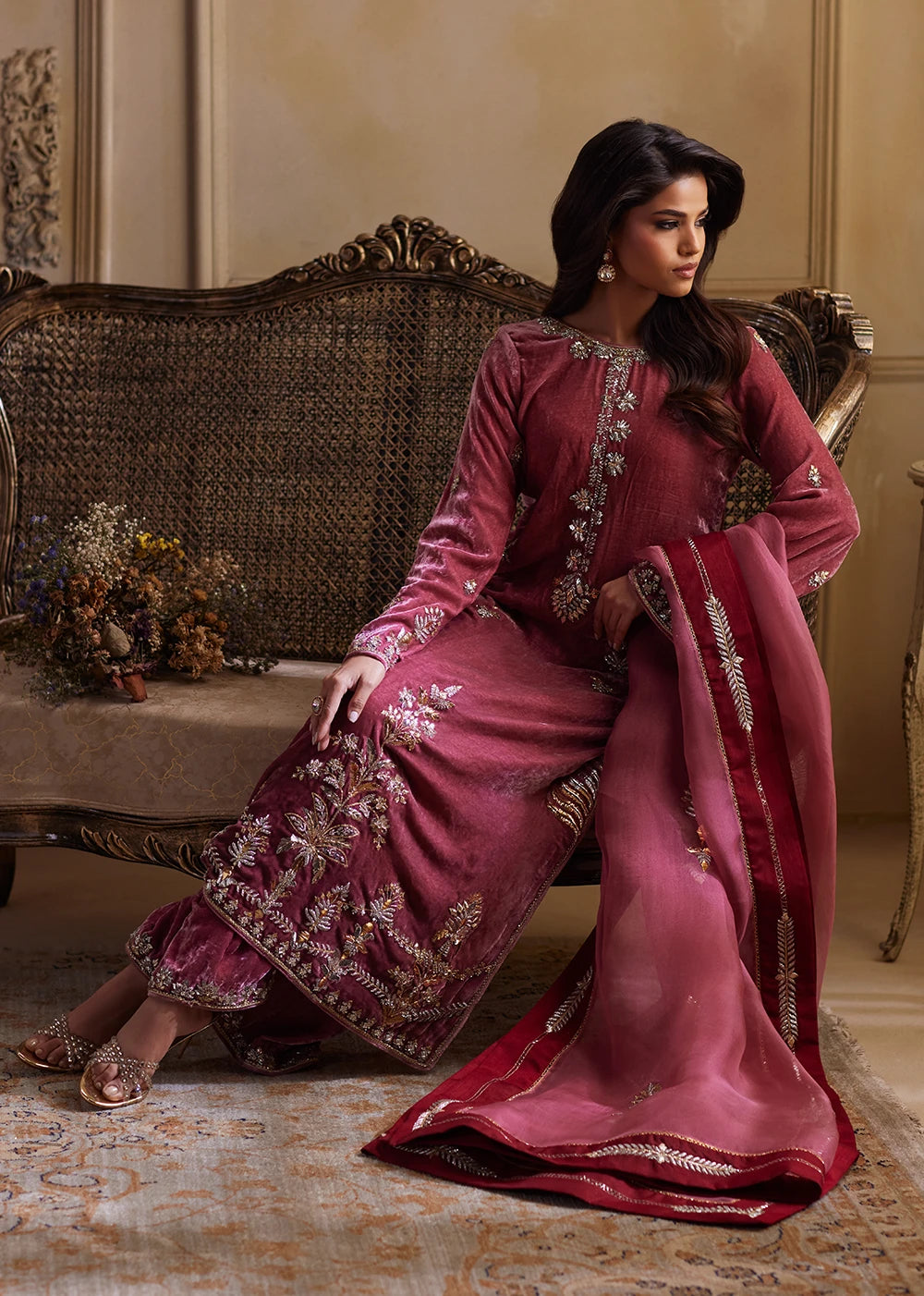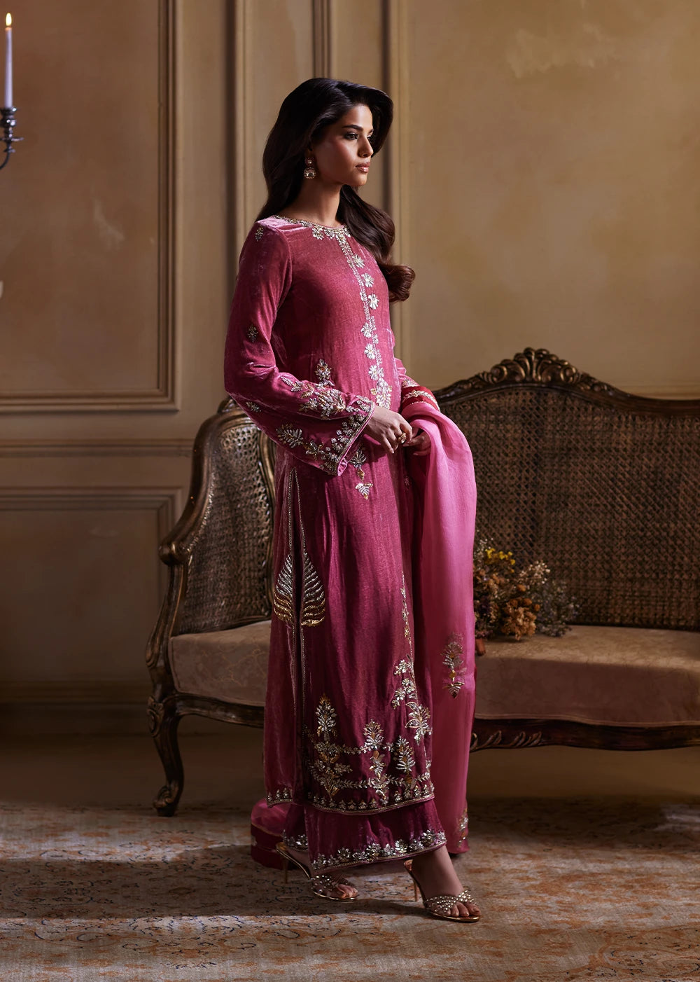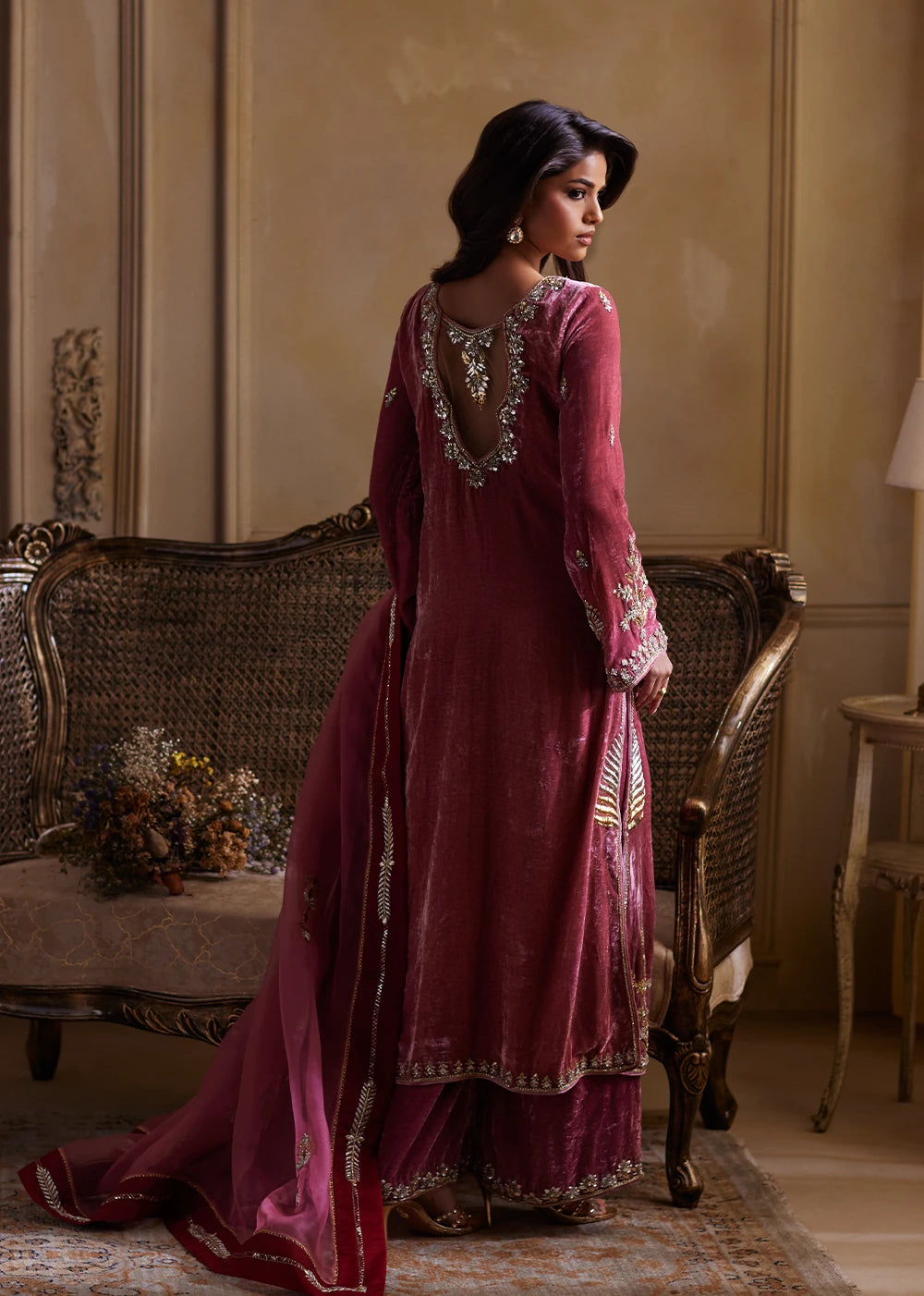 Bodega Rosé reveals itself with the quiet certainty of heritage, a meeting point between ancestral craft and modern poise. The salmon-pink shirt holds a warm, luminous base, with every inch of the velvet kissed with intricate Mukesh work in kilim-inspired motifs. Each angular form feels deliberate, echoing the language of centuries old craftsmanship.