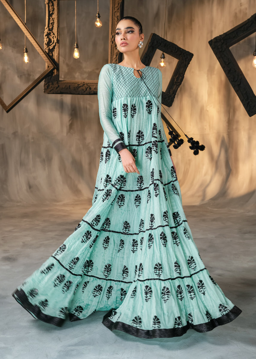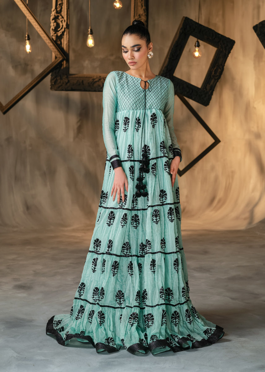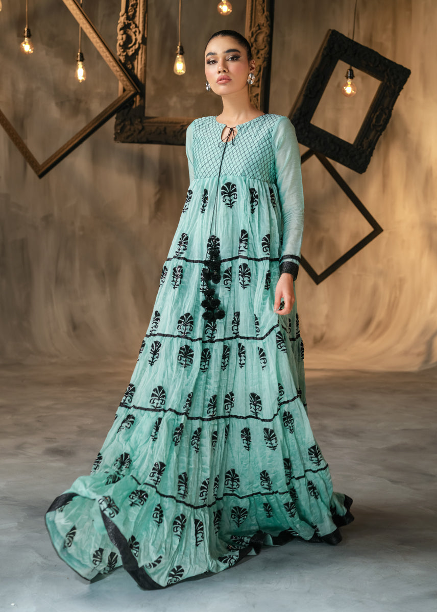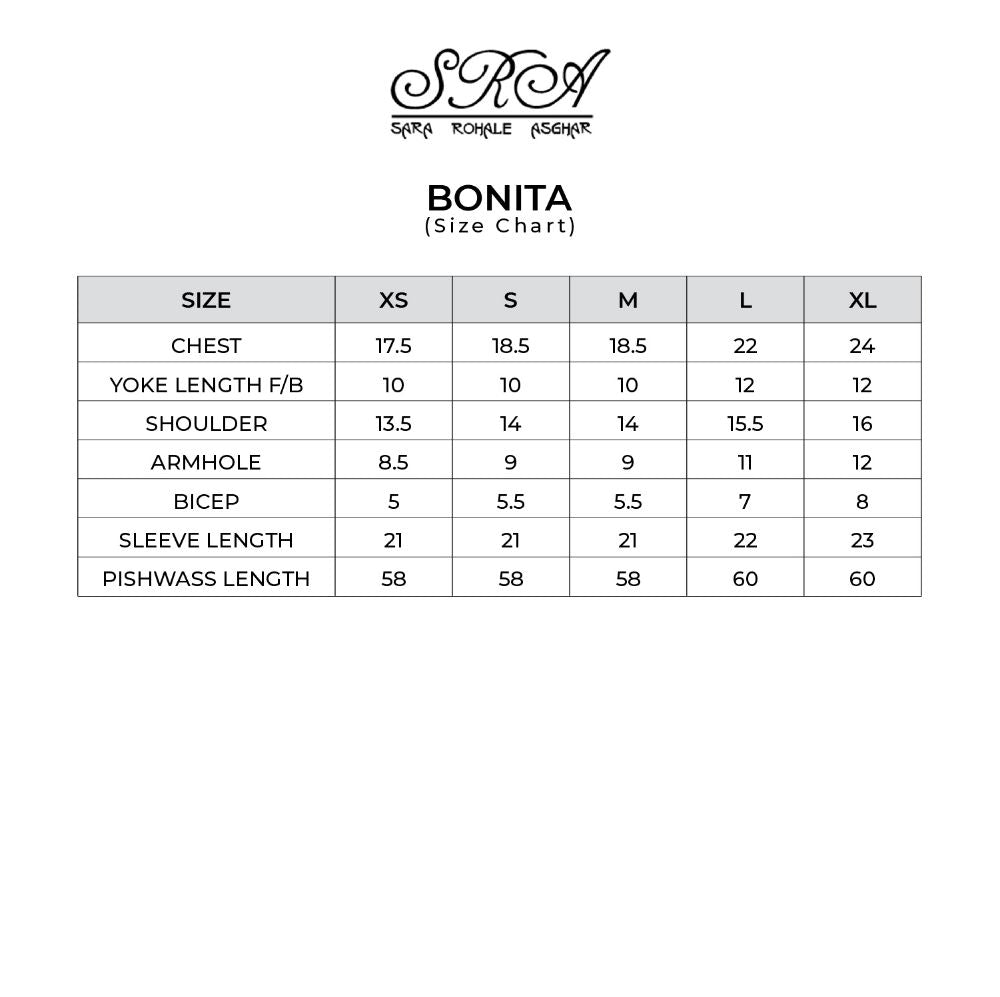 Bonita is an ethereal hued. Aline, stitched to perfection in a luxurious silk cotton creating a mesmerizing visual. The outfit is adorned with block printed motifs and sequence, adding shimmer and glamour. The noir fabric tassles add a feminine and playful bling to the look.
