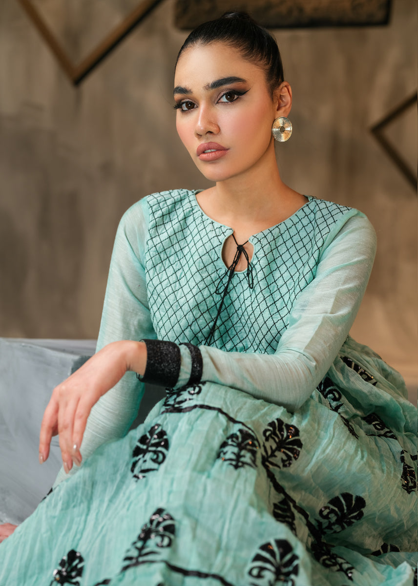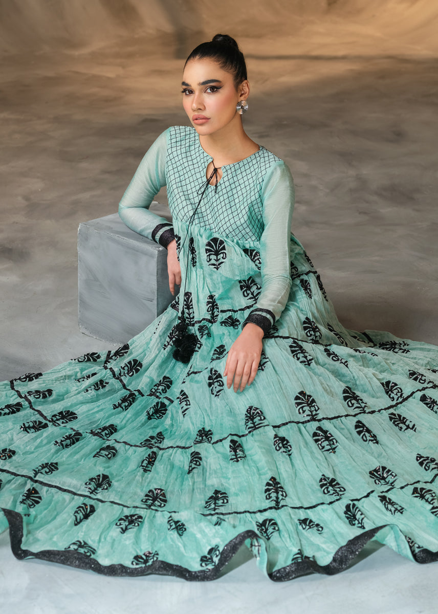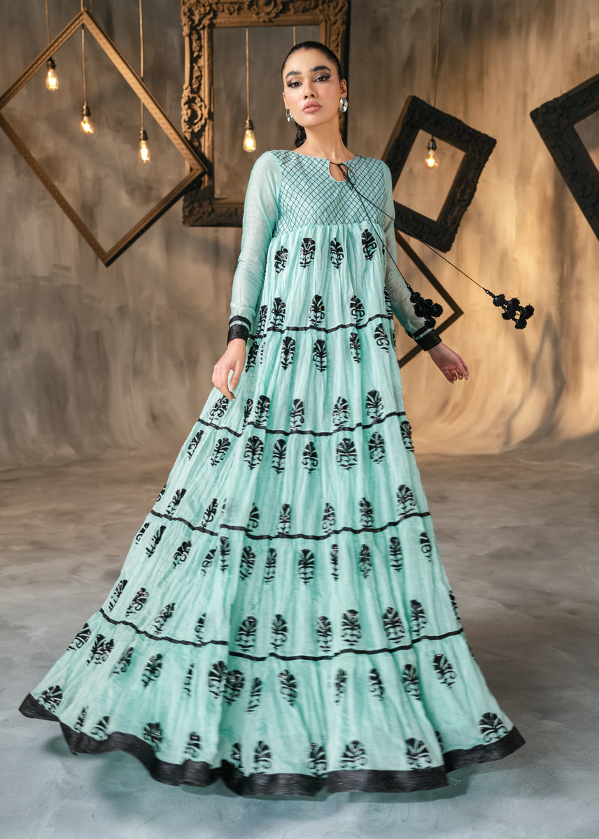 Bonita is an ethereal hued. Aline, stitched to perfection in a luxurious silk cotton creating a mesmerizing visual. The outfit is adorned with block printed motifs and sequence, adding shimmer and glamour. The noir fabric tassles add a feminine and playful bling to the look.