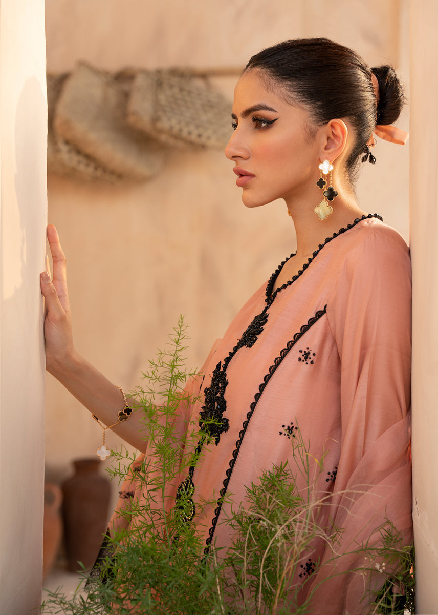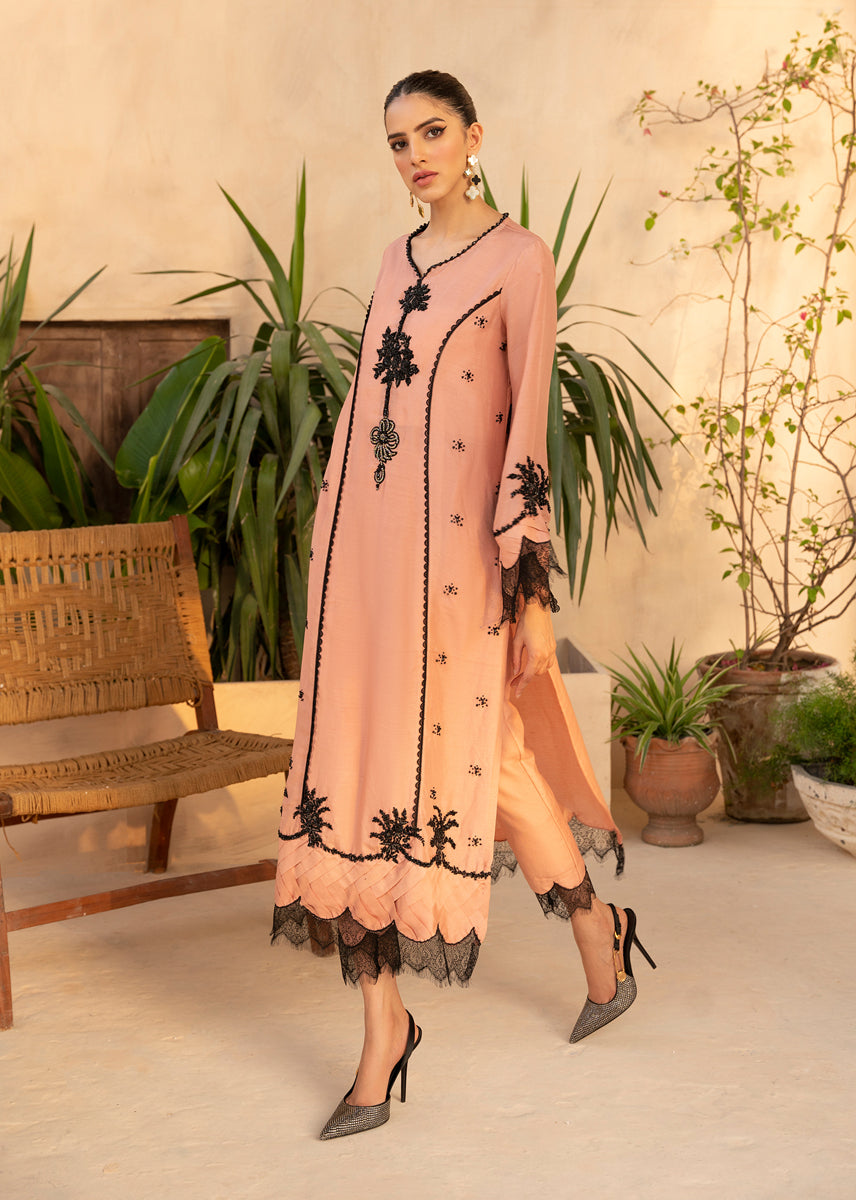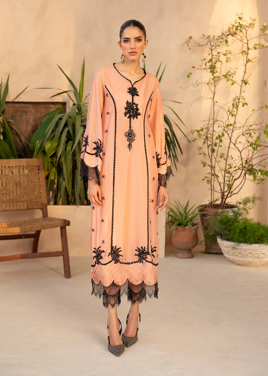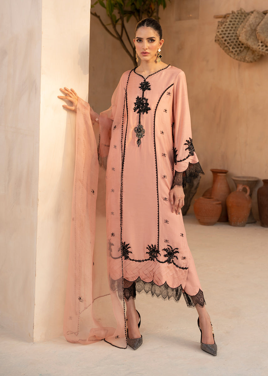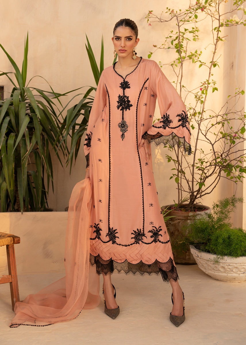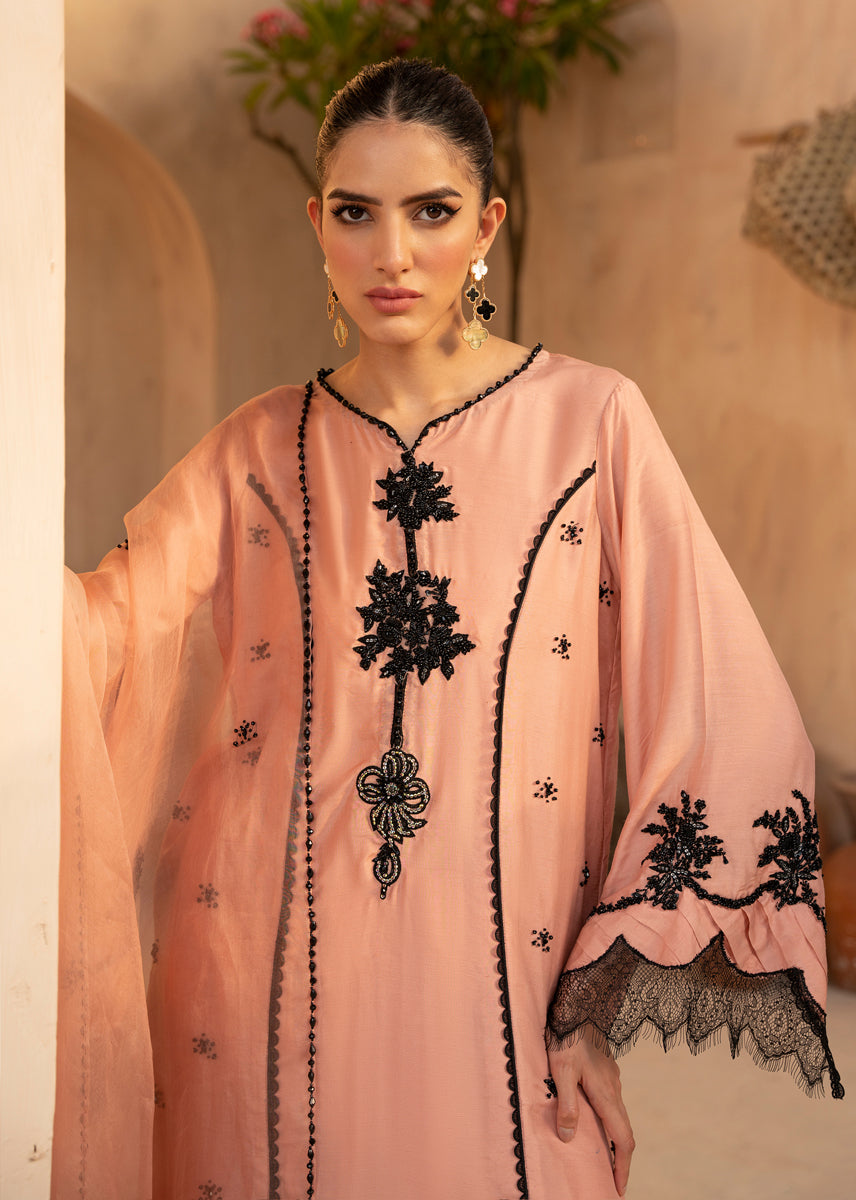 A soft salmon pink silk canvas embellished with black crystal bouquets on the neckline and hem accentuated with hand curated pleat work.