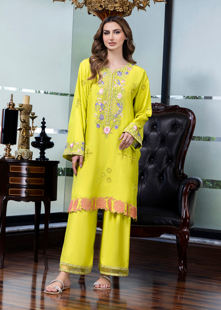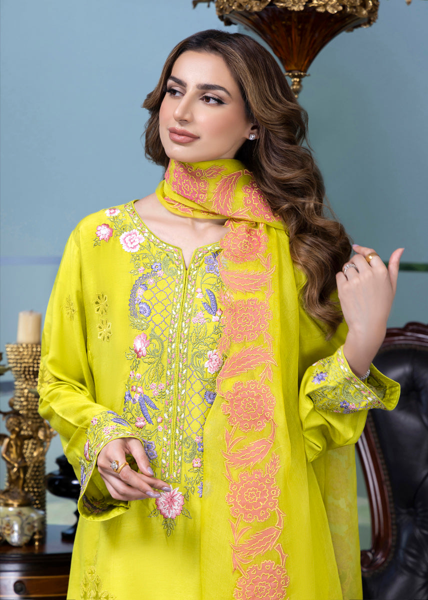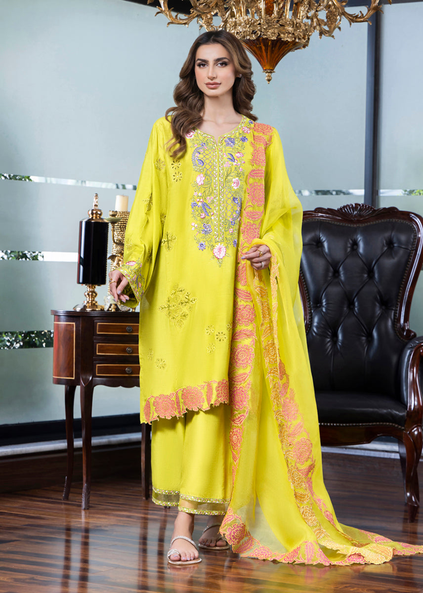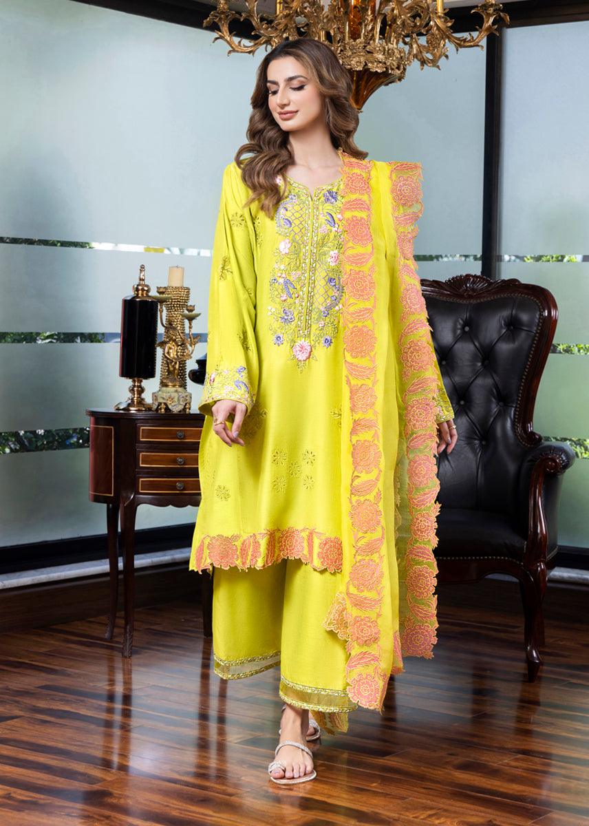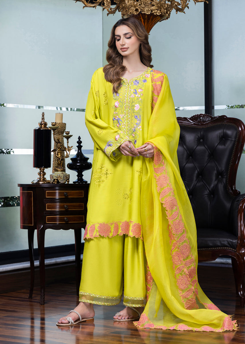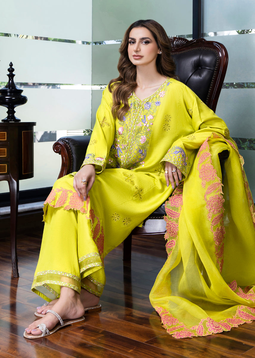 Dahlia is inspired by heritage elements and crafted with a modern palette, this three-piece ensemble features a pure silk kurta adorned with floral details through embroidery and appliqué work, capturing the essence of the summer-autumn transition. It is paired with azaar pants featuring elegant detailing and an organza dupatta, finished with appliqué floral borders, making it a refreshing and stylish choice for any occasion.