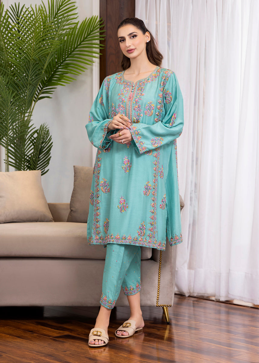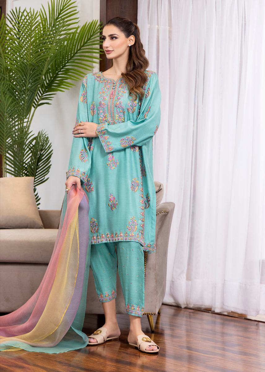 Faye exhibits an array of visual delight executed with a masterful pastel threadwork running elaborately over the silk kurta in kashmiri floral patterns. The shalwar with its minimal detailing and the dip dyed dupatta adds vibrancy and chicness to the overall look sealing it for all happy fests.