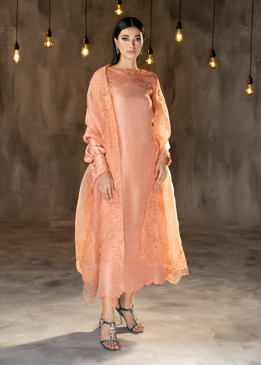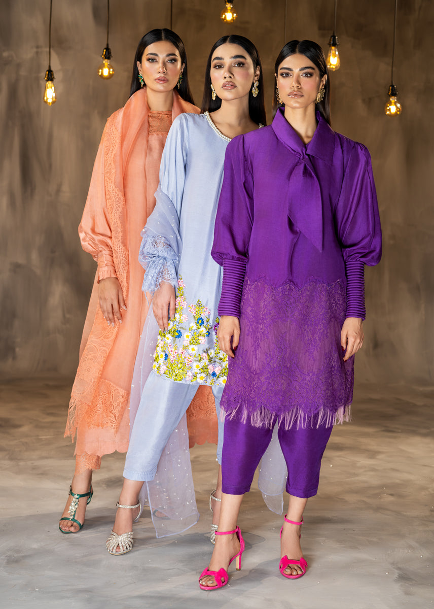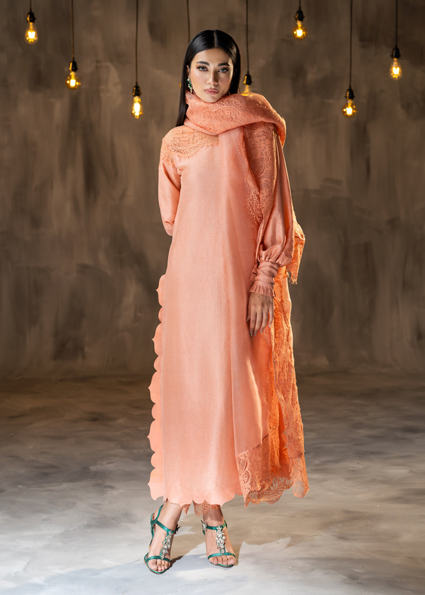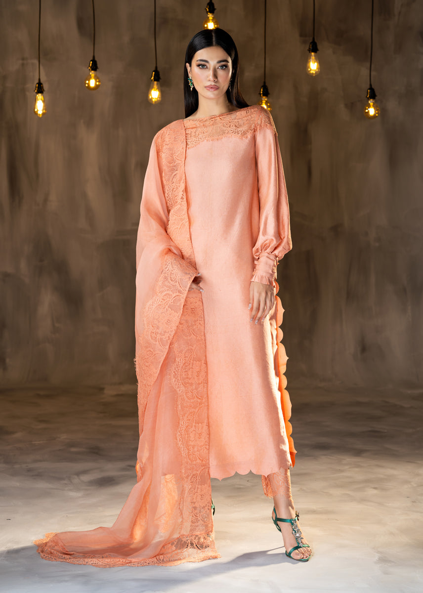 Glazed Nectar an awe chic ensemble made of pure raw silk, finished delicately with elements of French Chantilly lace sprawled on the neckline and generously running on the borders of the sheer organza dupatta. The look is completed with straight silk trousers. The outfit is a modern rendition of a classic silhouette with statement details of cuffed sleeves and scalloped edges.