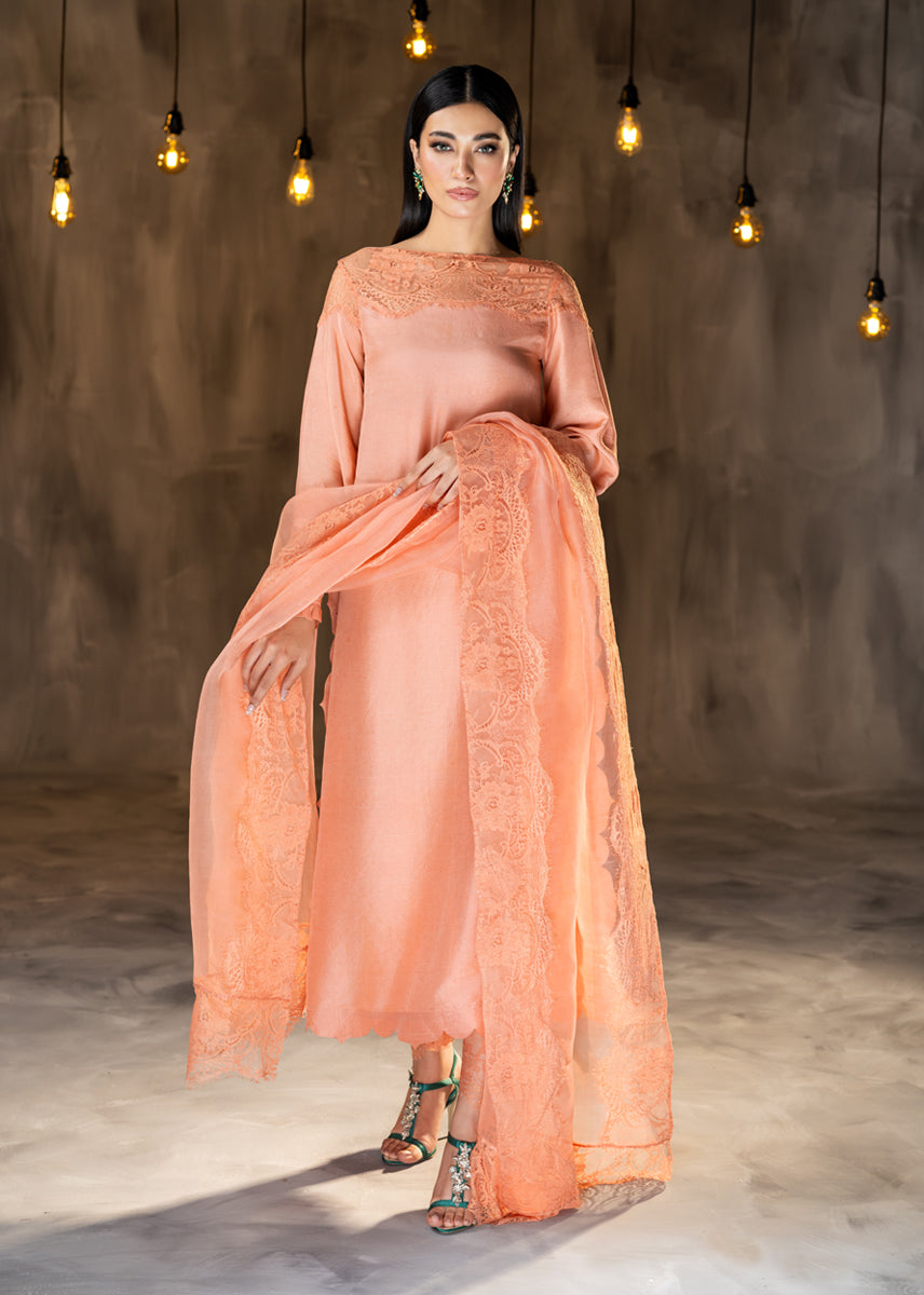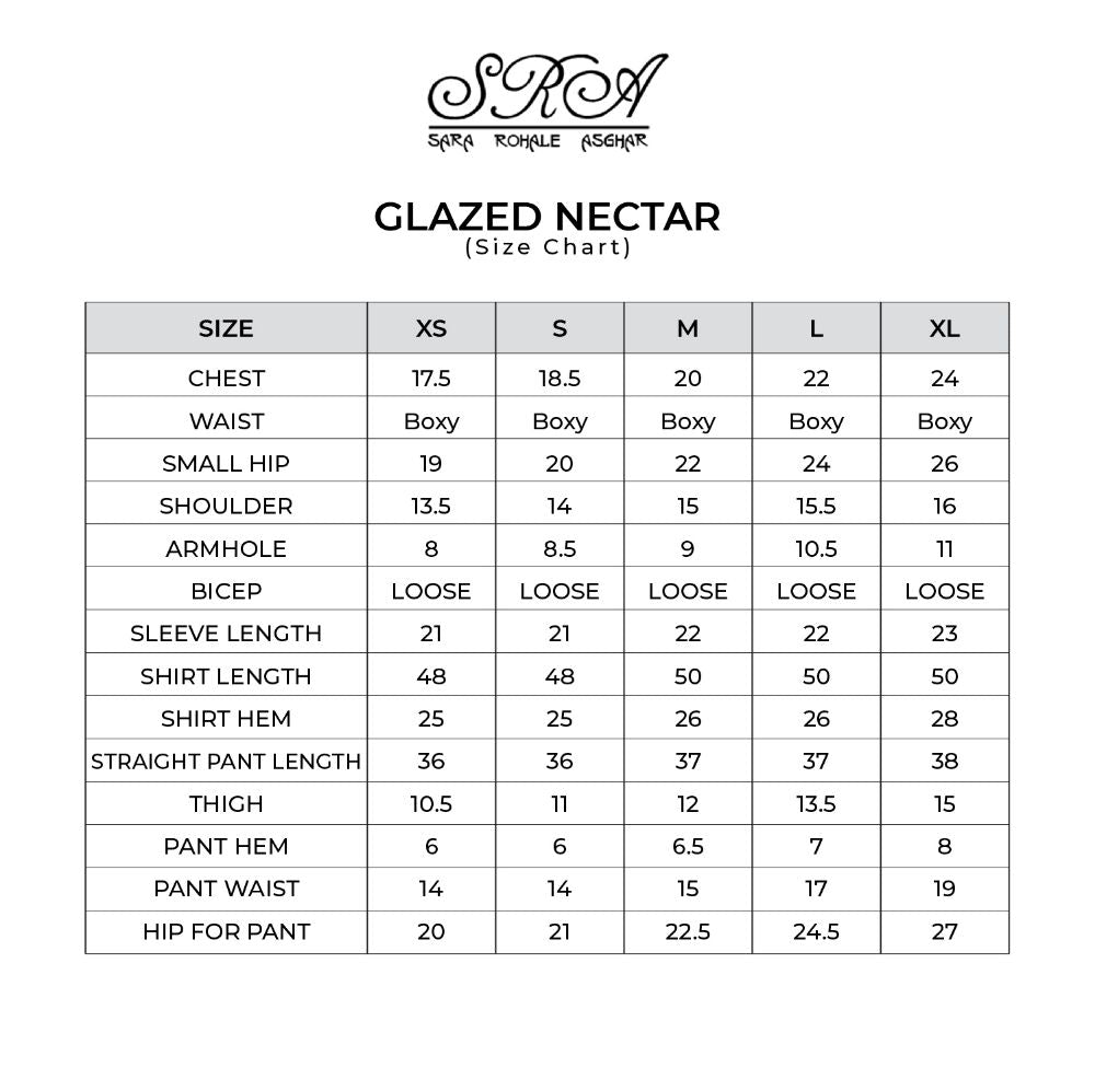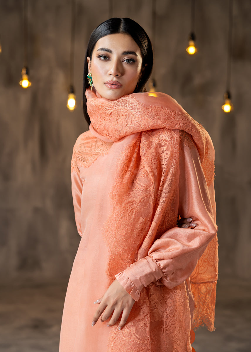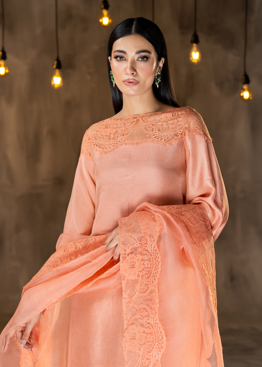 Glazed Nectar an awe chic ensemble made of pure raw silk, finished delicately with elements of French Chantilly lace sprawled on the neckline and generously running on the borders of the sheer organza dupatta. The look is completed with straight silk trousers. The outfit is a modern rendition of a classic silhouette with statement details of cuffed sleeves and scalloped edges.