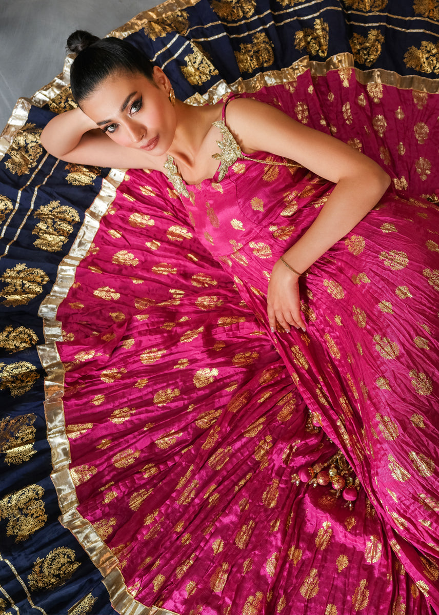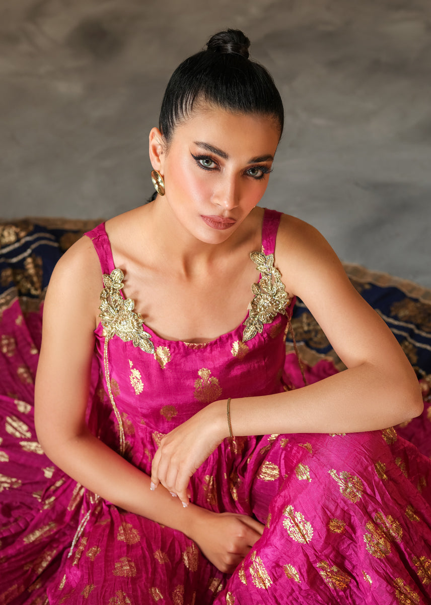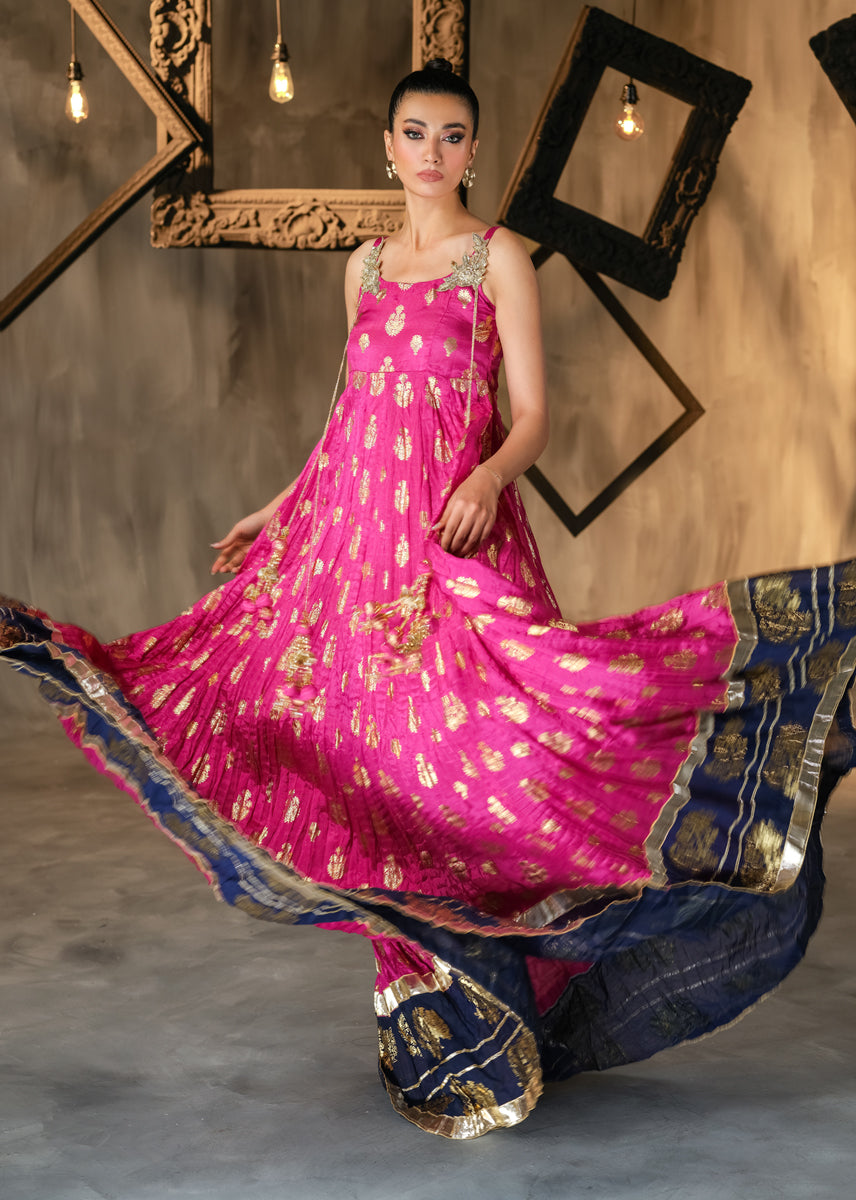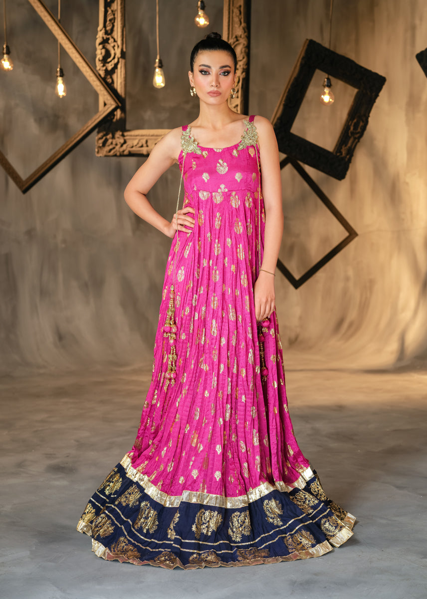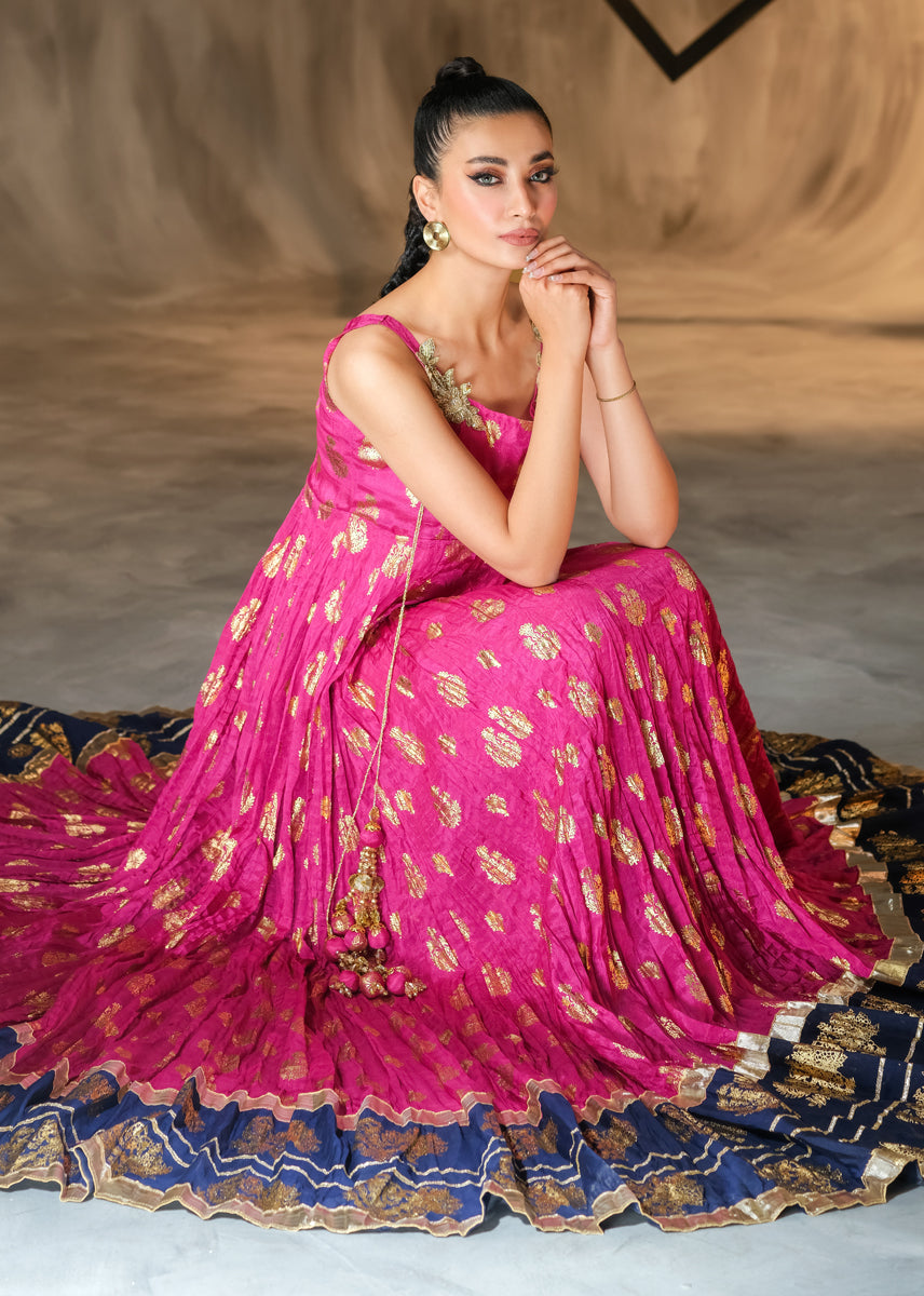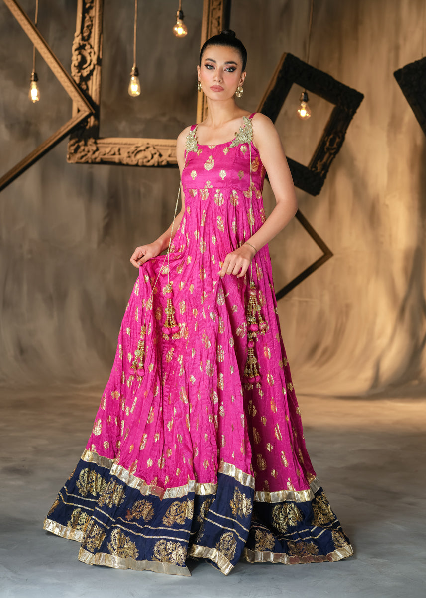 The Uber Flowy A-line is a perfect choice for all upcoming occasions. The elegant peshwas is heavily laden with block print technique all over the generous ghaira. Hand embellished motives sit on bodice with tassles dangling, delving into traditional flavour. The look can be completed with a festive twirl and radiant smile of a woman who knows her fashion.