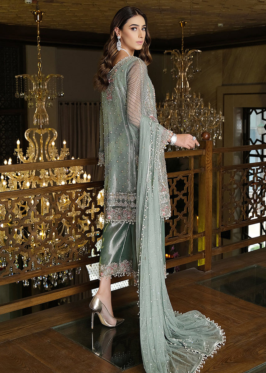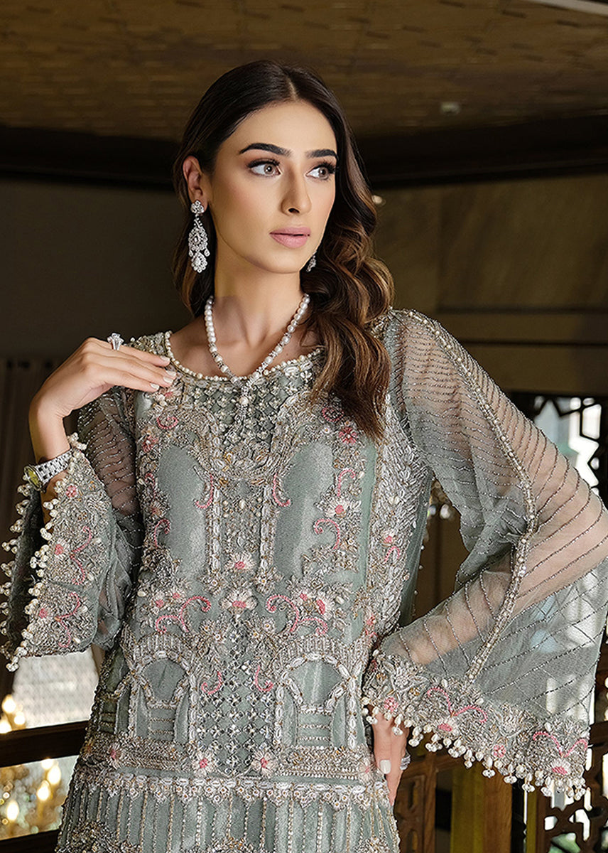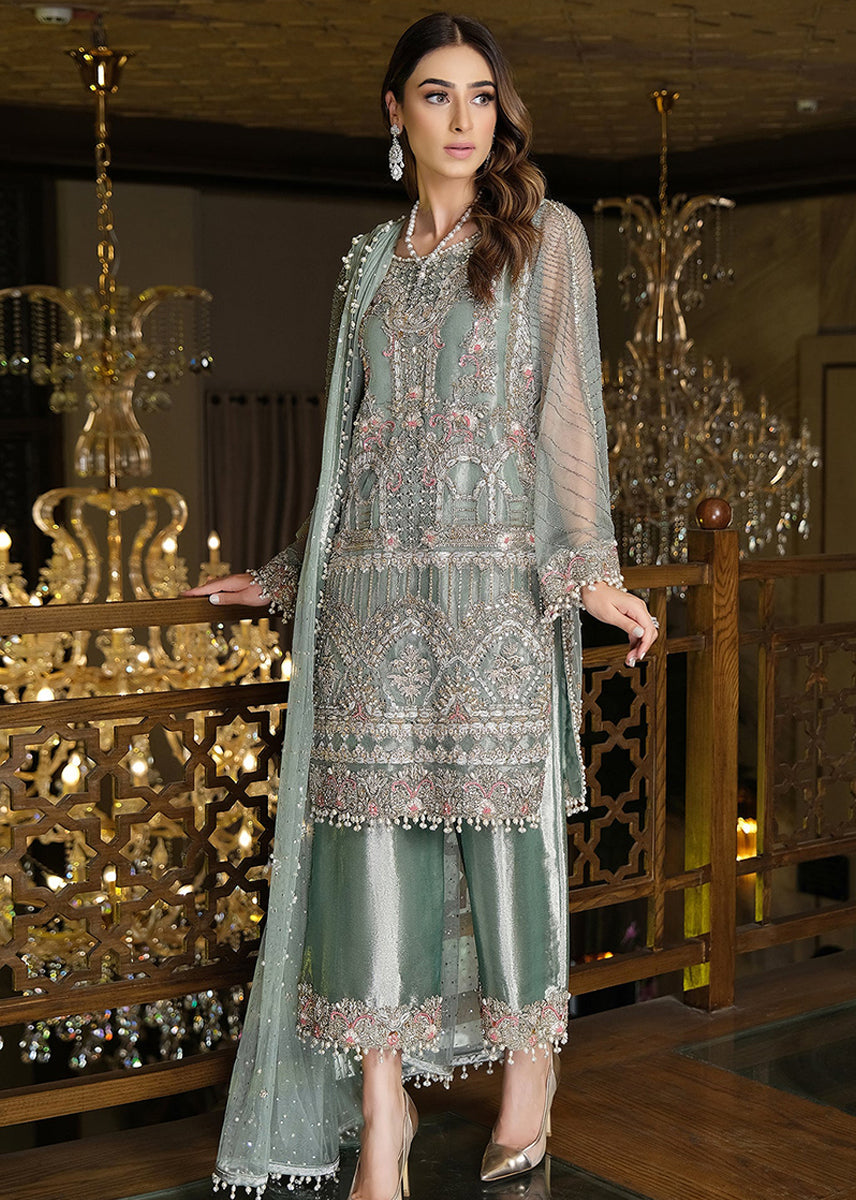Ice green attire embedded with intricate floral embellishments and alluring pearls on sleeves.