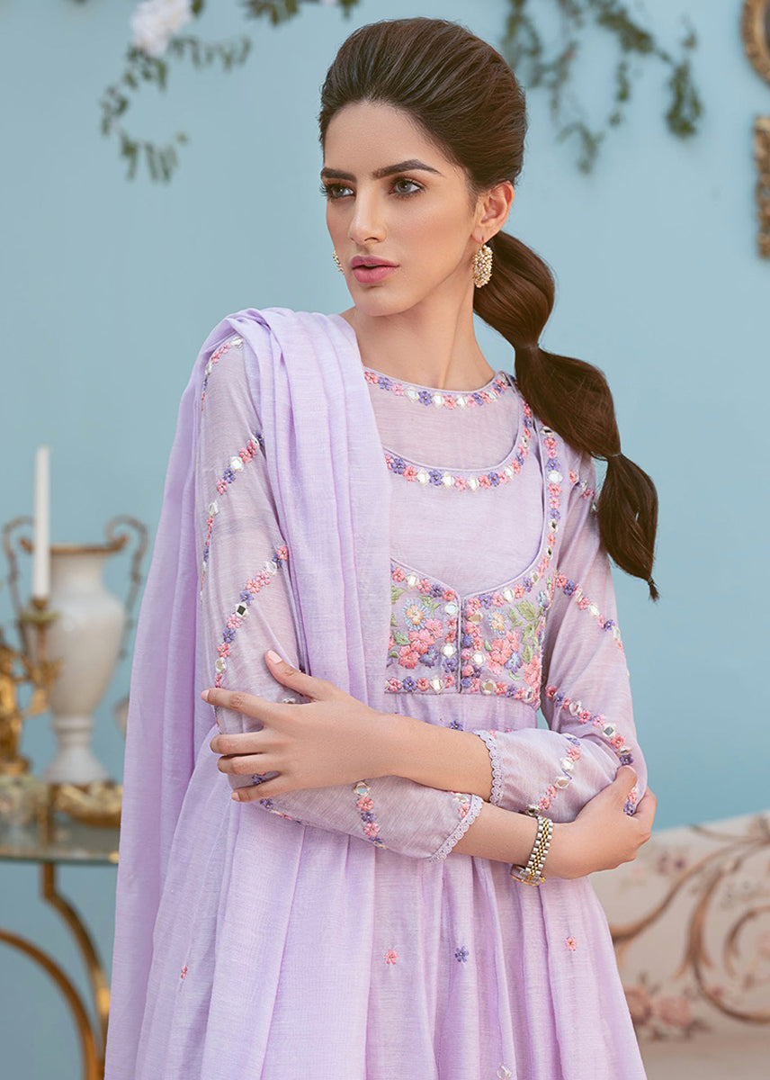 This beautiful watery shade of lilac is stitched into an elaborate yet simple kalidar in breathable paper cotton.