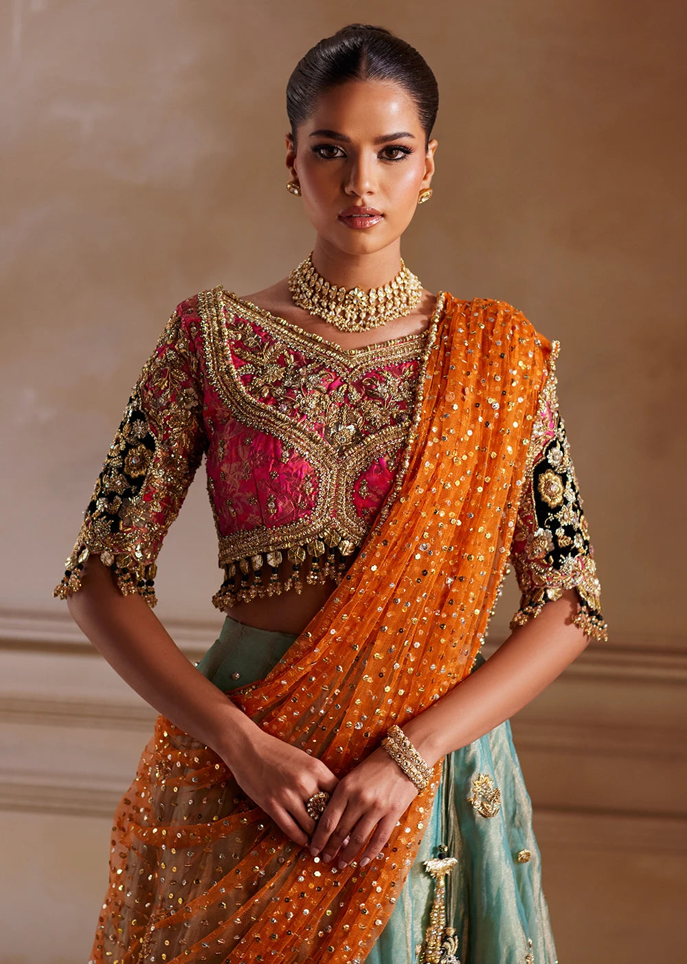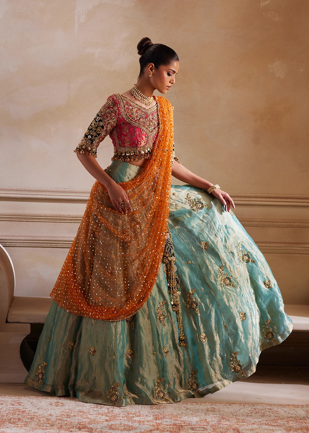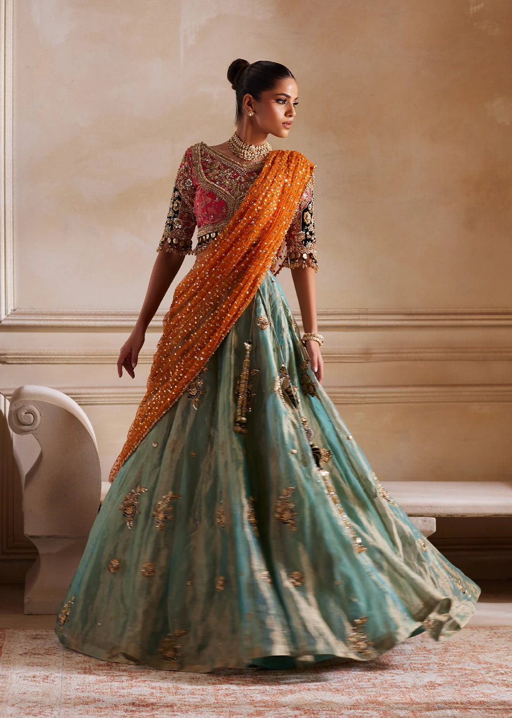 Draped effortlessly across the body is a tangerine net dupatta, its surface scattered with a constellation of sequins. Flowing outward in regal volume, the pure tissue aqua-green lehenga becomes the heart of the ensemble, luminous and richly adorned with bunches of zardozi embroidery intertwined with black resham bloom across the skirt, creating a dance of color and texture that celebrates both tradition and contemporary finesse.