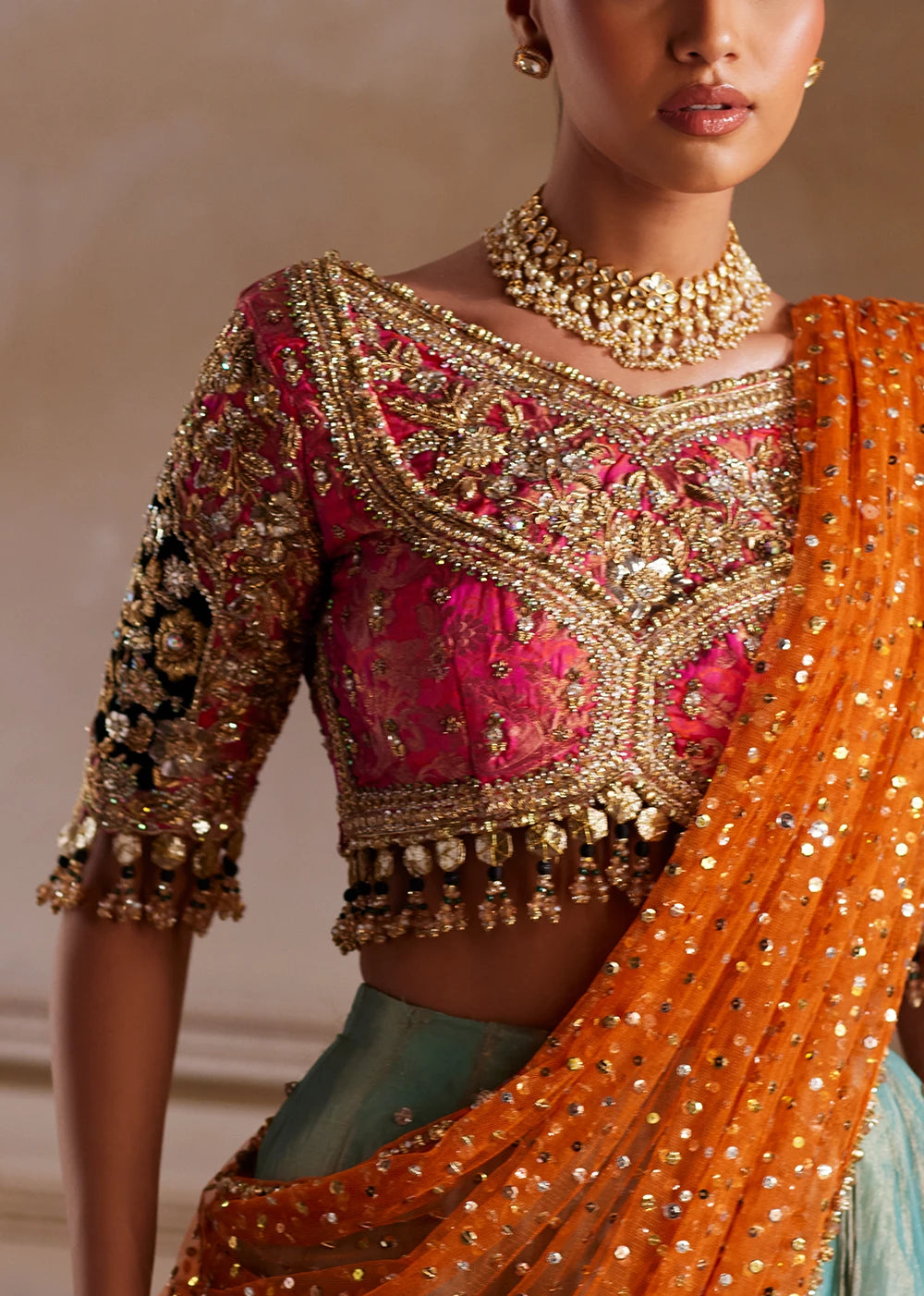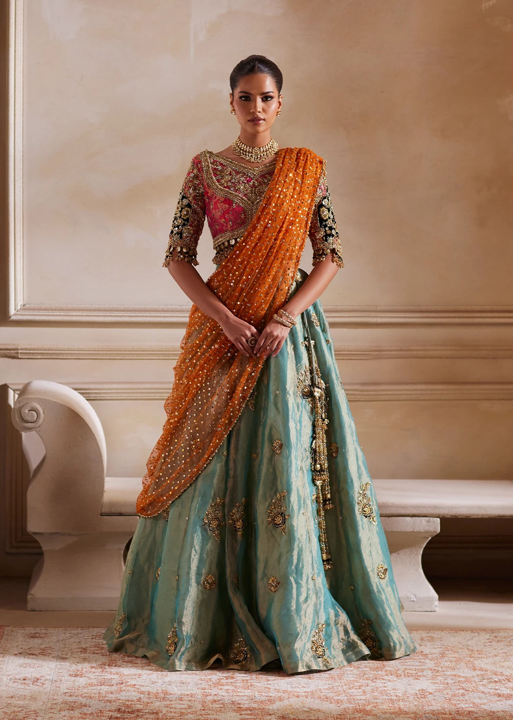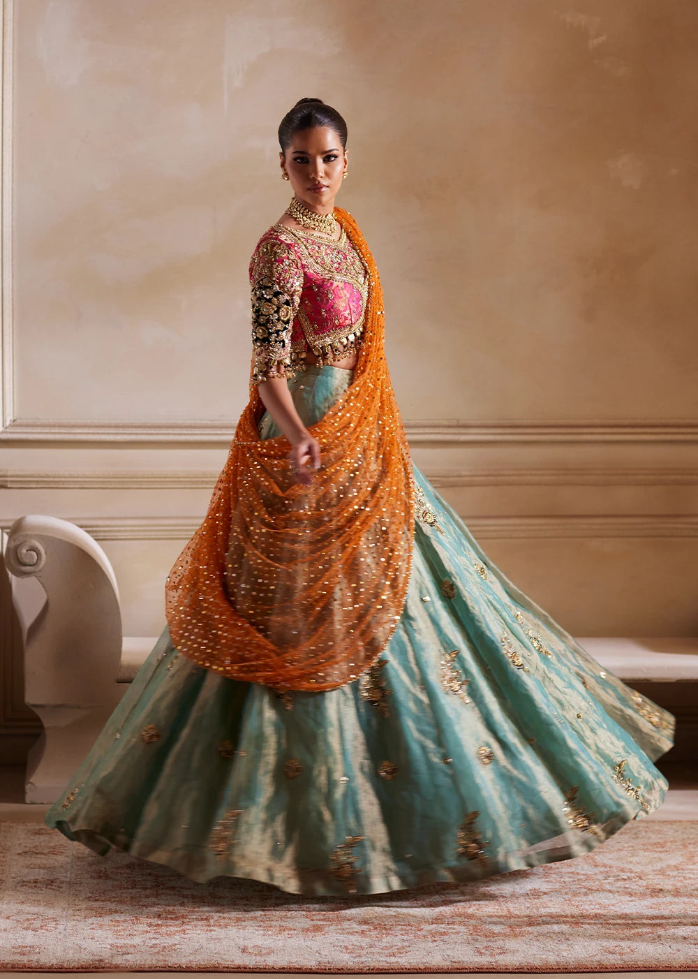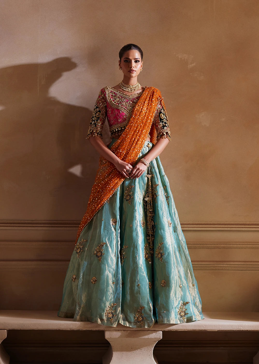 Draped effortlessly across the body is a tangerine net dupatta, its surface scattered with a constellation of sequins. Flowing outward in regal volume, the pure tissue aqua-green lehenga becomes the heart of the ensemble, luminous and richly adorned with bunches of zardozi embroidery intertwined with black resham bloom across the skirt, creating a dance of color and texture that celebrates both tradition and contemporary finesse.