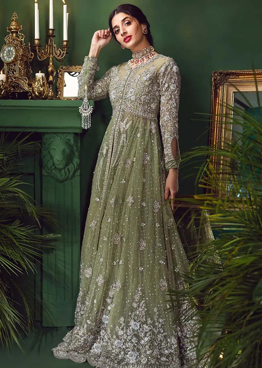 An elaborate three piece ensemble. The pishwas and dupatta are made of net sprawled with embellishment.