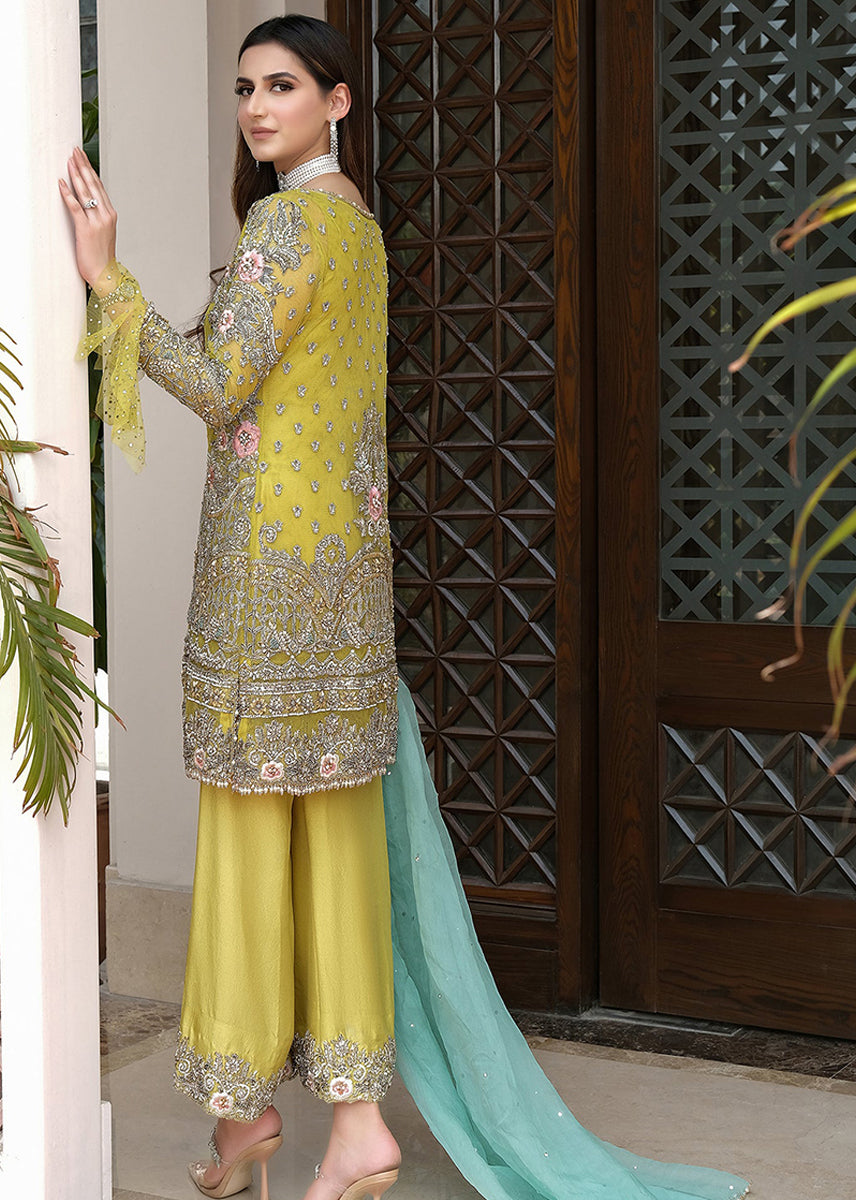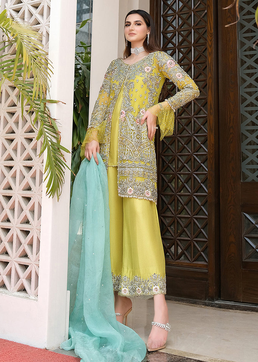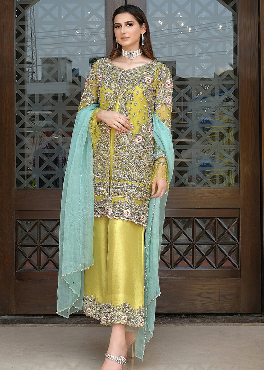 Lime yellow open shirt embellished with indicate sliver threadwork and floral embellishments.