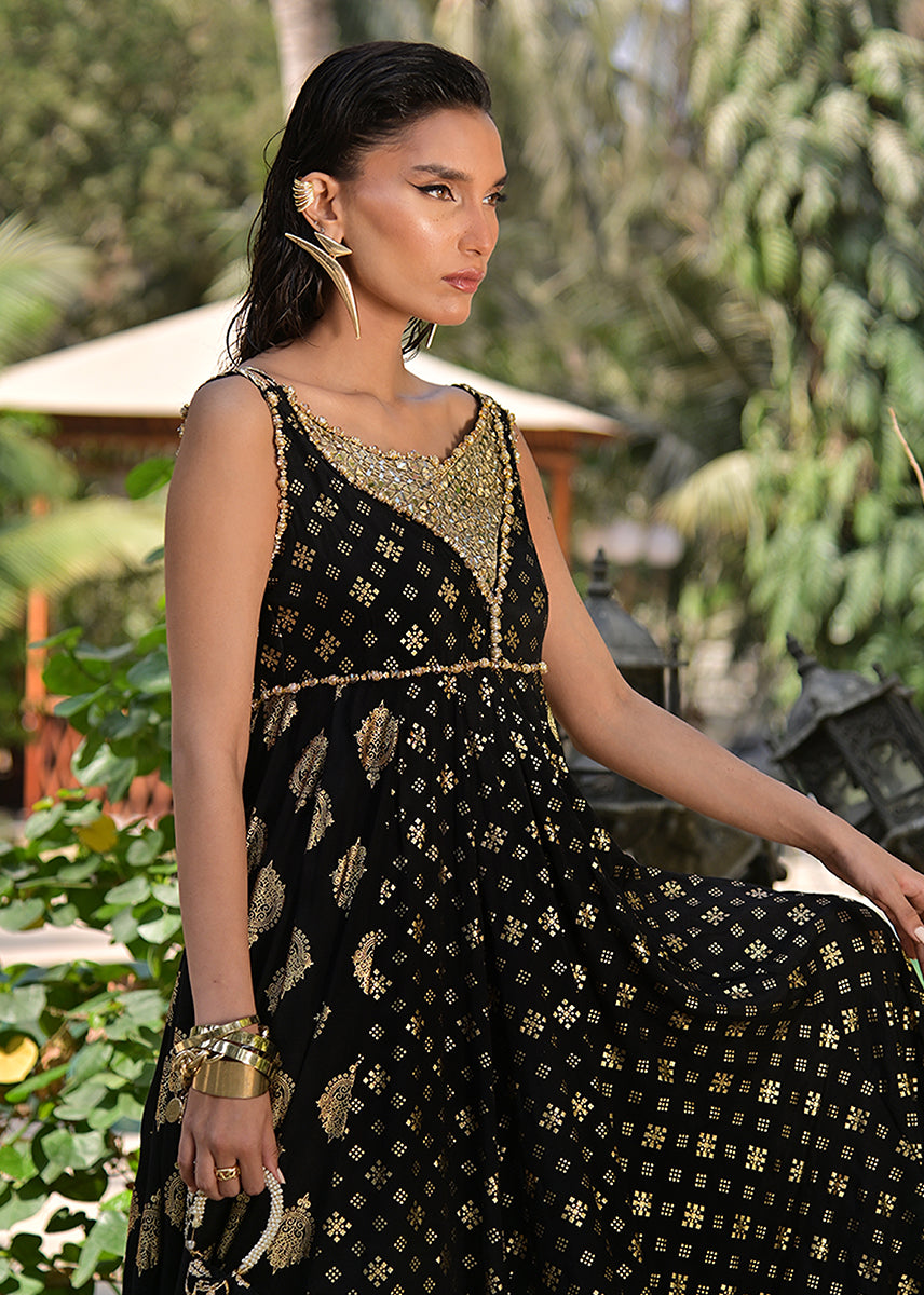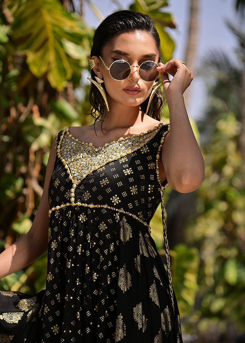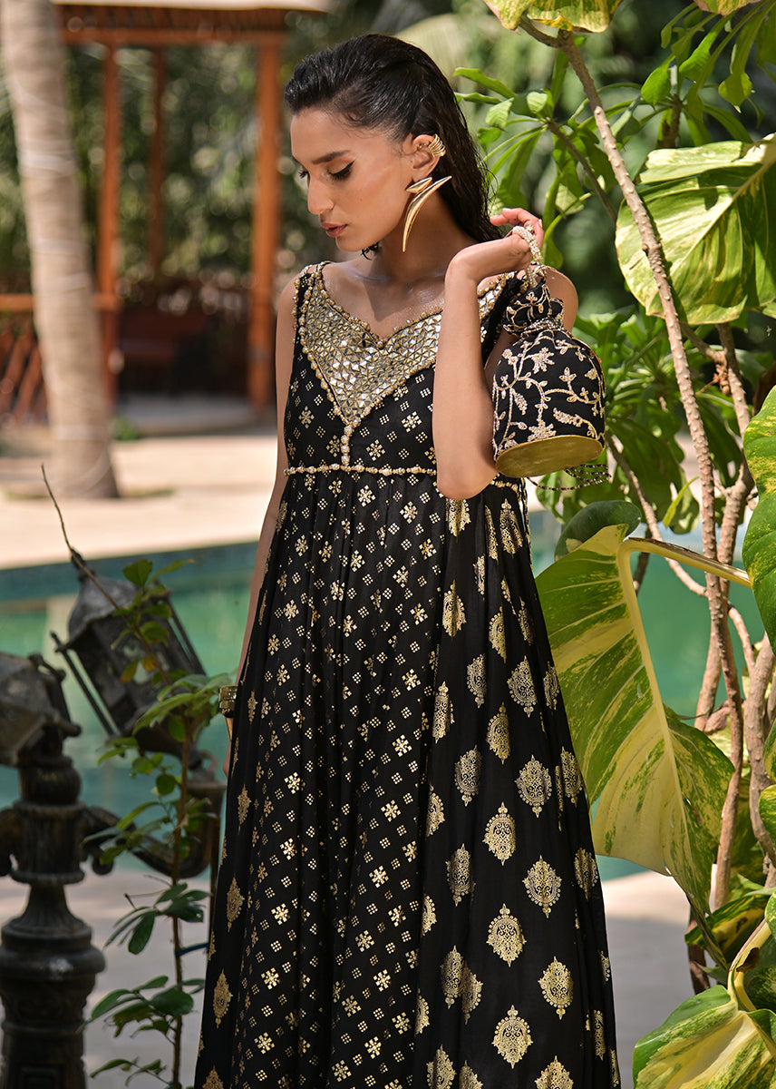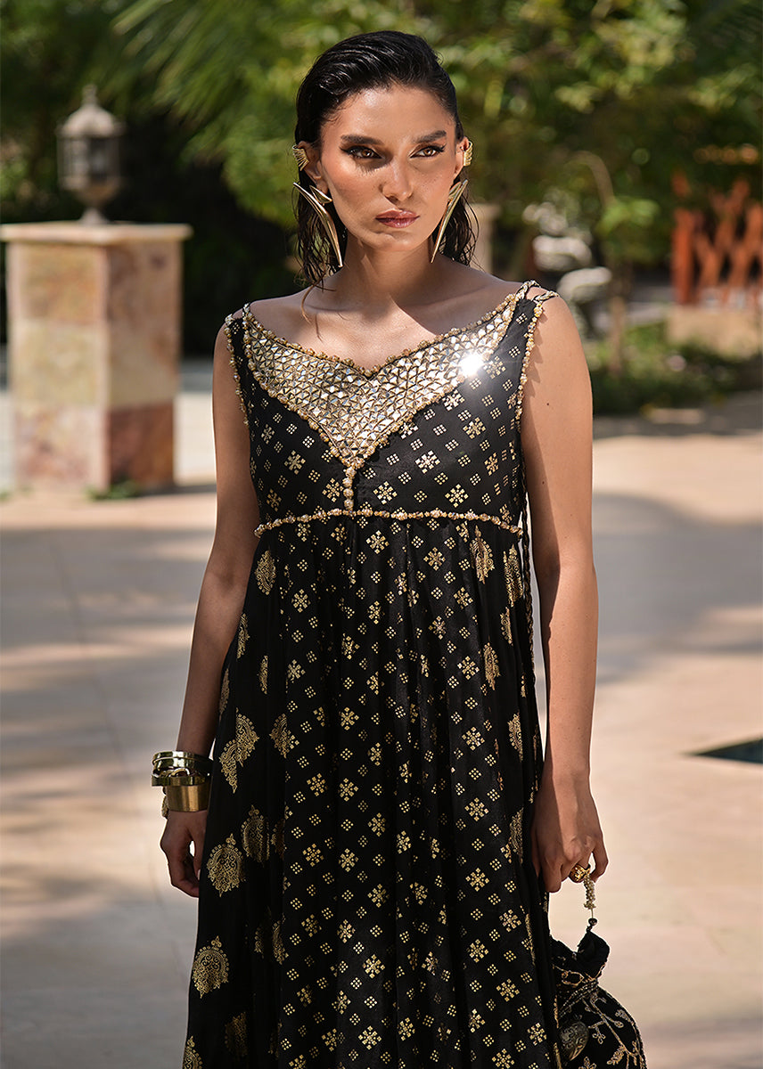 Ornox is masterfully crafted to evoke a sense of mystique and regality. Masked in ebony silk, this ethereal payshwaas is brought to life with intricate gold foil prints, shimmering like a constellation of fallen stars scattered across on an obsidian sky. The elongated panels, laden with opulent gold motifs, cascade down in an unbroken flow of luxury and precision, each print exuding an air of ornamental brilliance. The sheer mastery of the gold foil application allows the fabric to flicker and gleam with an almost supernatural luster, transforming movement into an artistic expression. The sheesha embellished yoke glistens like shattered stardust, with each reflective mirror meticulously placed to capture and refract light with delicate tassel crafted from a harmonious blend of silk threads, metallic accents, and intricate mirrorwork, ensuring that they catch the light with every graceful motion. The voluminous silhouette, infused with grandeur, makes each step a performance dramatic, effortless, and resplendent. Ornox is an affair with the night, a poetic dance between light and darkness.