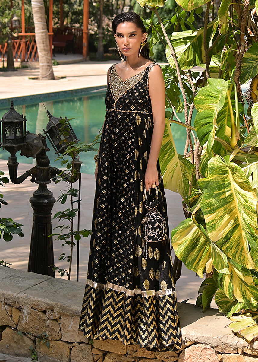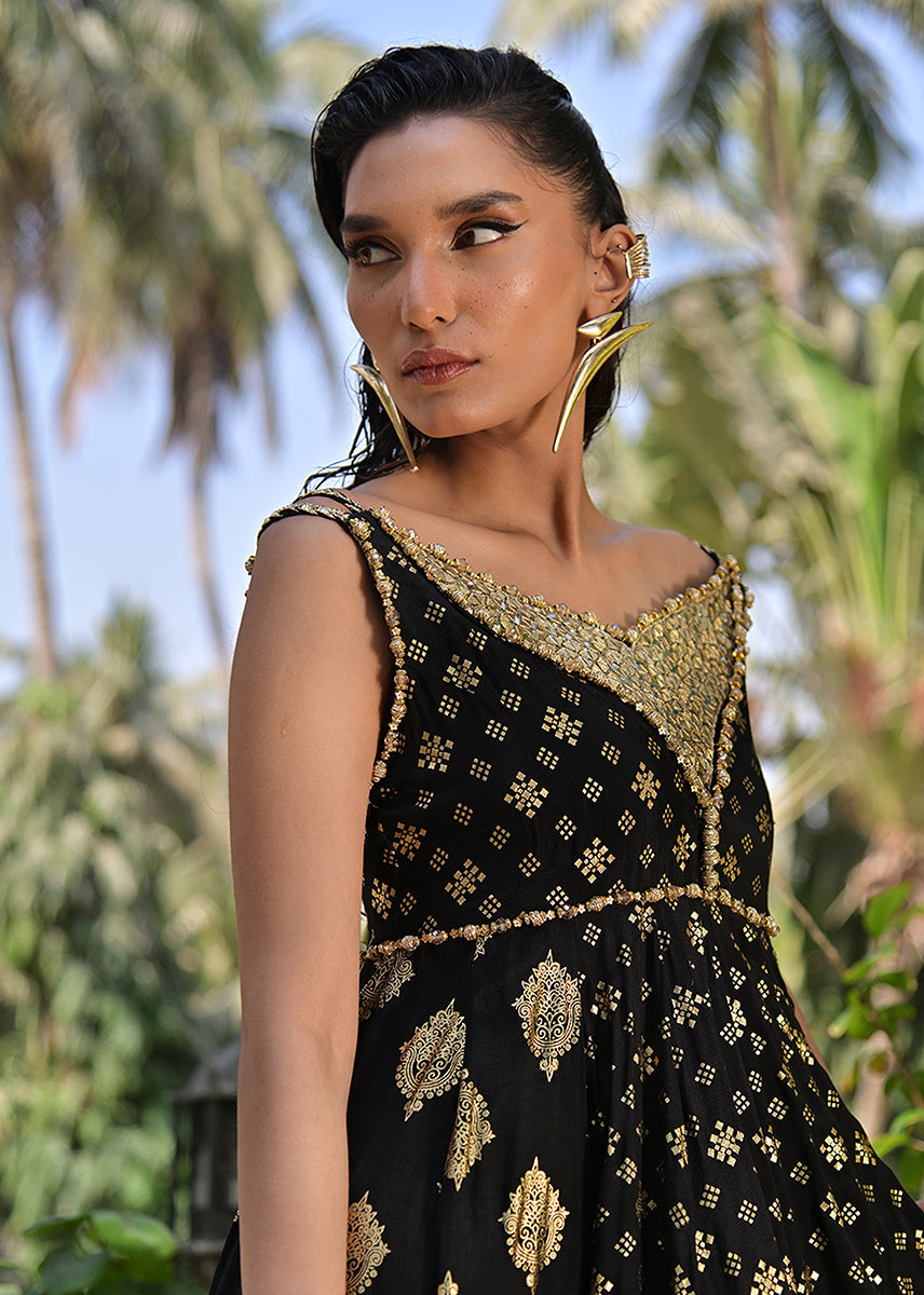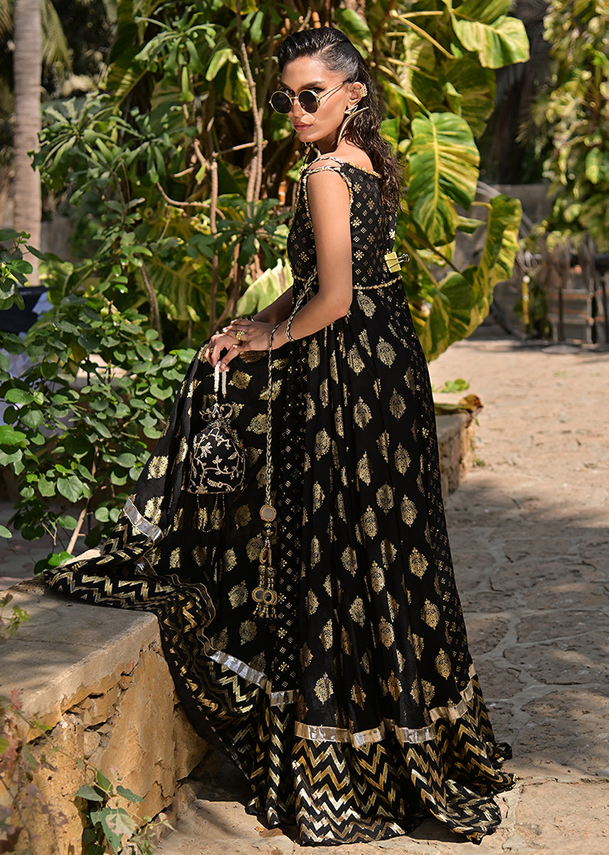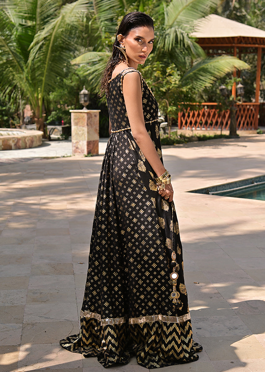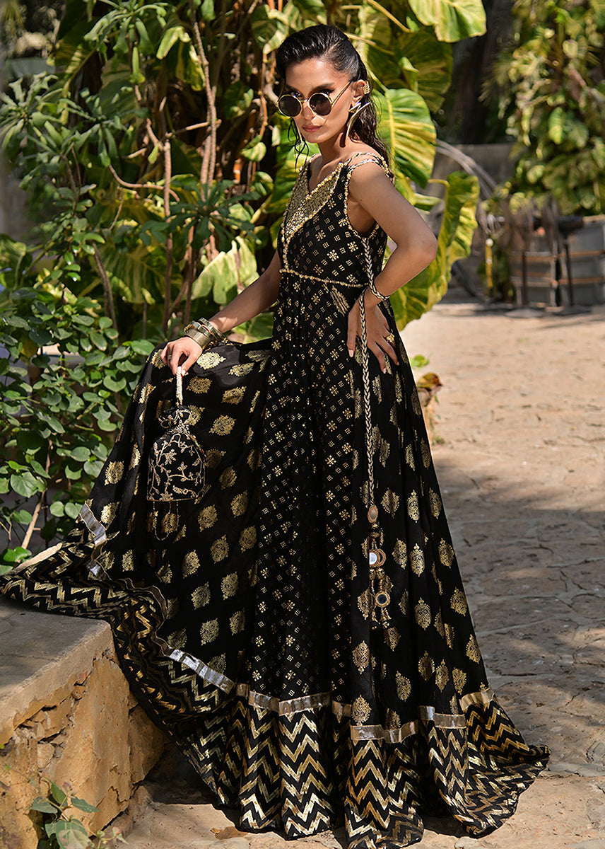 Ornox is masterfully crafted to evoke a sense of mystique and regality. Masked in ebony silk, this ethereal payshwaas is brought to life with intricate gold foil prints, shimmering like a constellation of fallen stars scattered across on an obsidian sky. The elongated panels, laden with opulent gold motifs, cascade down in an unbroken flow of luxury and precision, each print exuding an air of ornamental brilliance. The sheer mastery of the gold foil application allows the fabric to flicker and gleam with an almost supernatural luster, transforming movement into an artistic expression. The sheesha embellished yoke glistens like shattered stardust, with each reflective mirror meticulously placed to capture and refract light with delicate tassel crafted from a harmonious blend of silk threads, metallic accents, and intricate mirrorwork, ensuring that they catch the light with every graceful motion. The voluminous silhouette, infused with grandeur, makes each step a performance dramatic, effortless, and resplendent. Ornox is an affair with the night, a poetic dance between light and darkness.