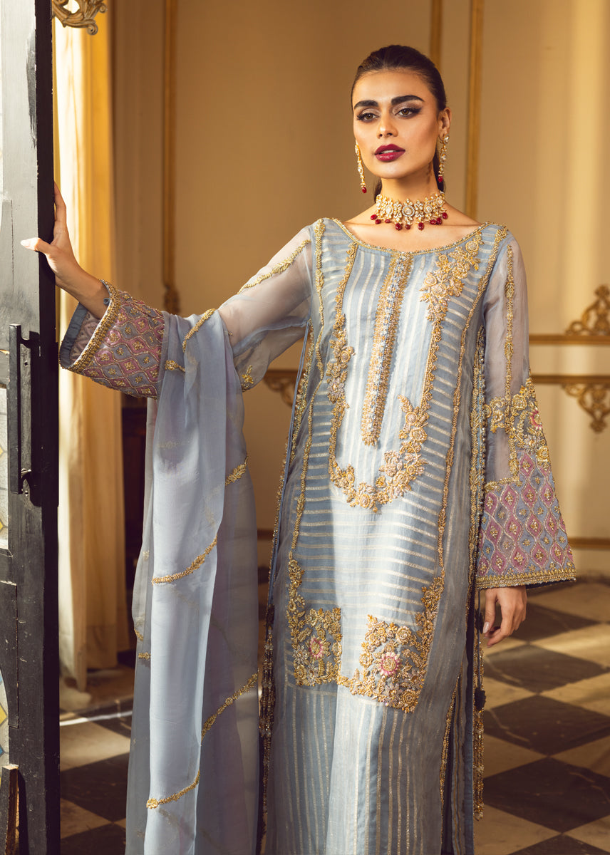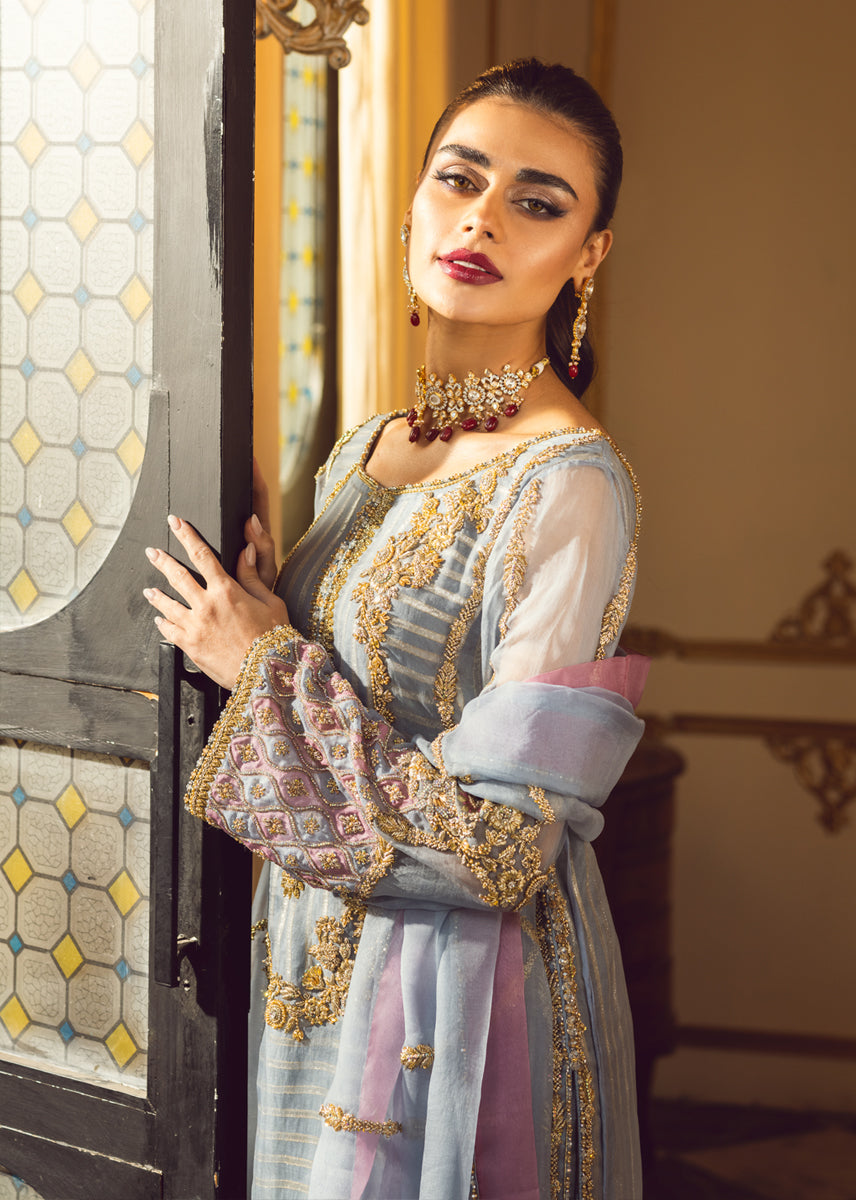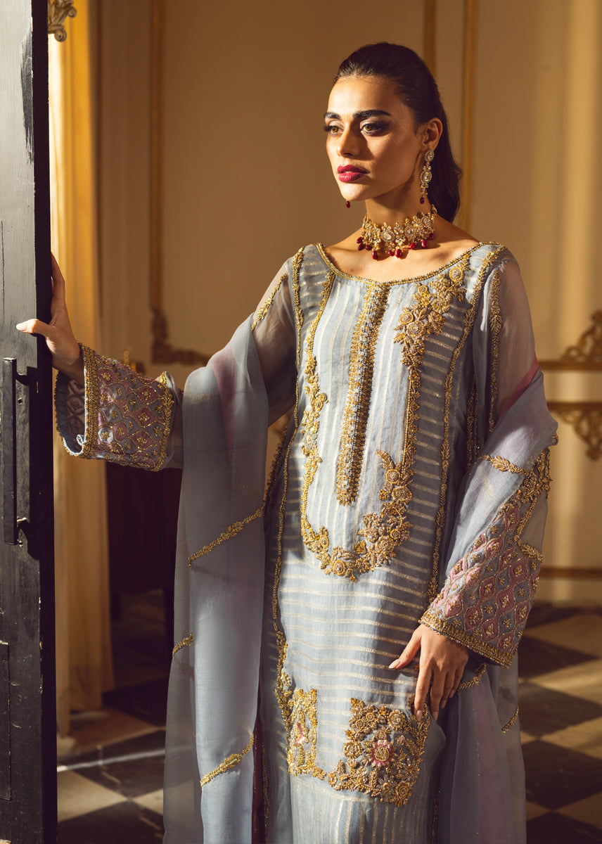 Redefining Elegance in PASTEL POETRY | an enchanting ensemble featuring an Ashy Blue shirt and dupatta crafted from ethereal organza.