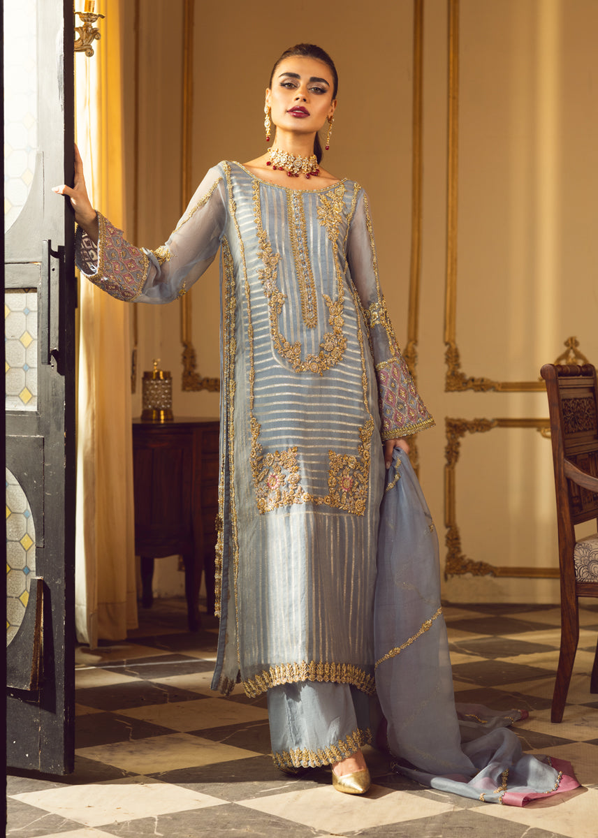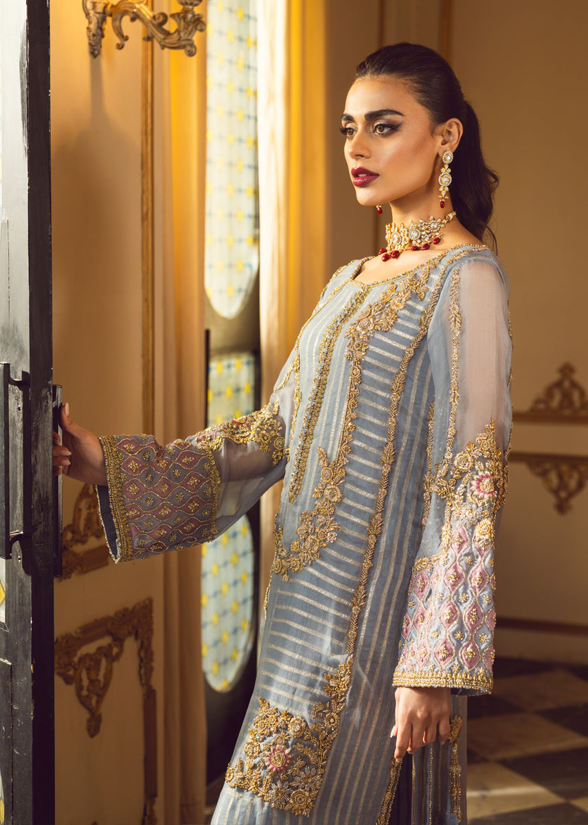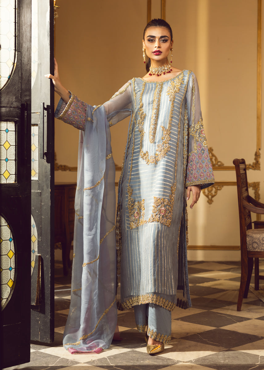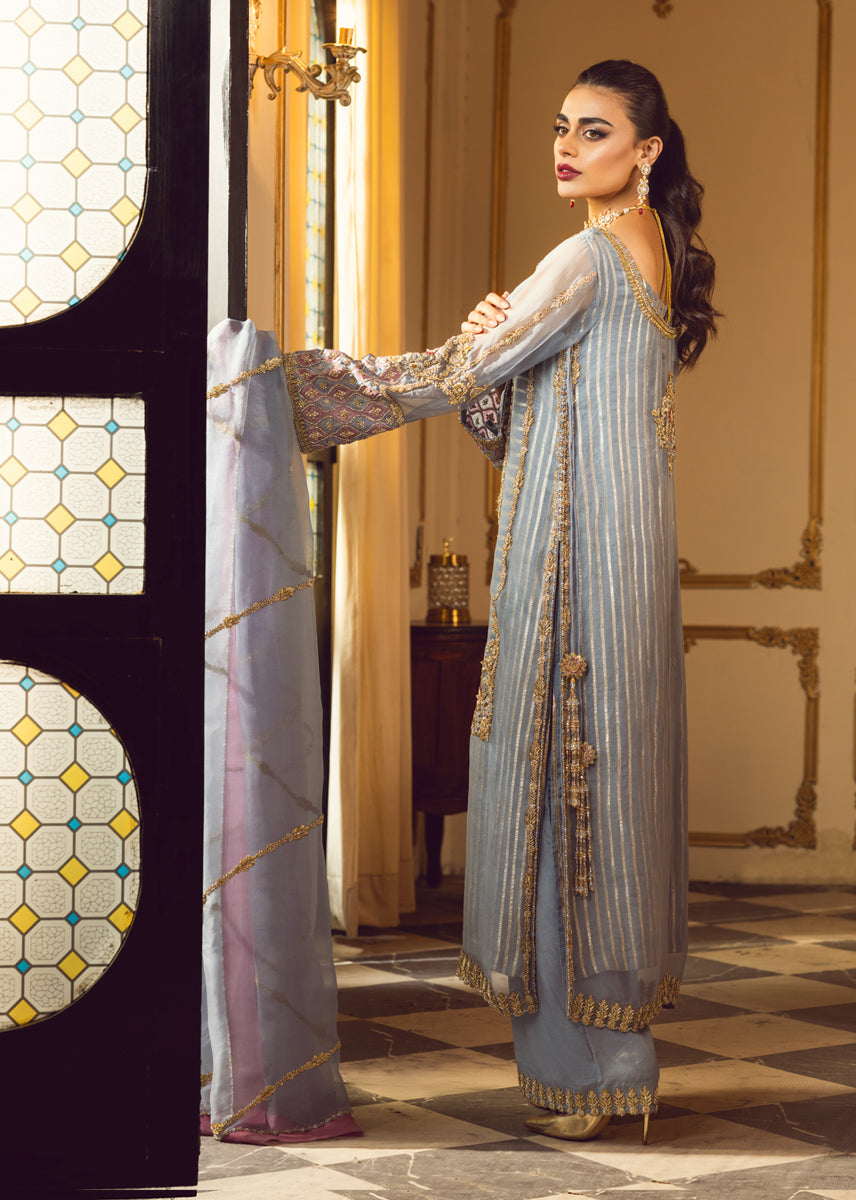 Redefining Elegance in PASTEL POETRY | an enchanting ensemble featuring an Ashy Blue shirt and dupatta crafted from ethereal organza.