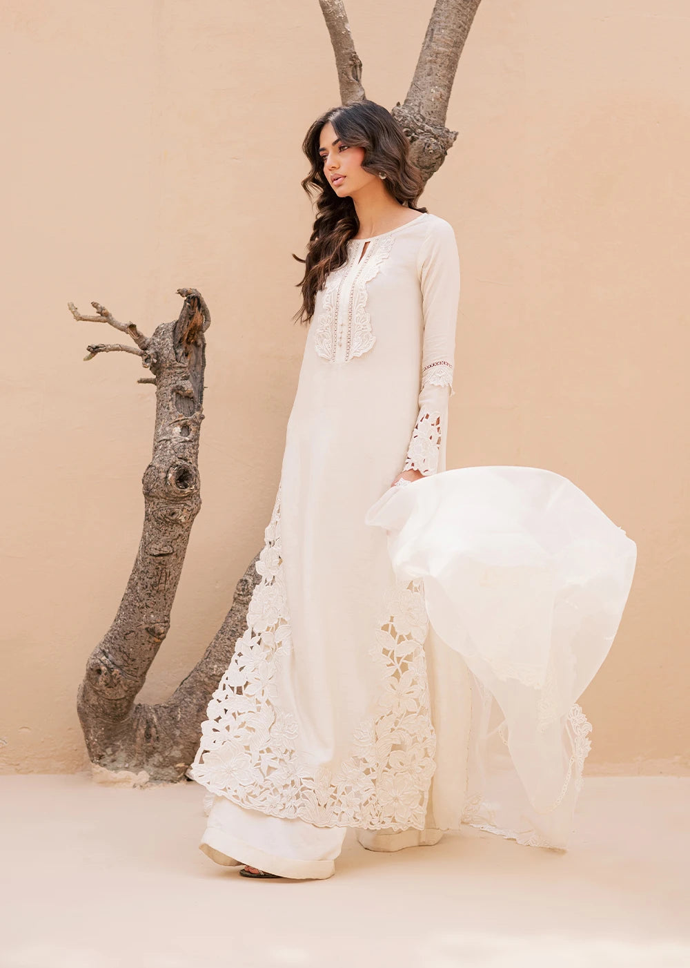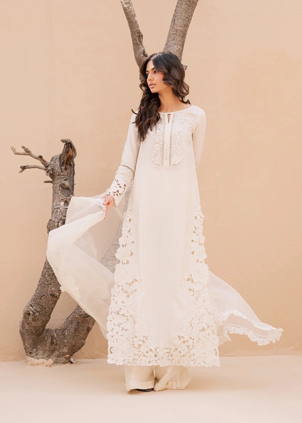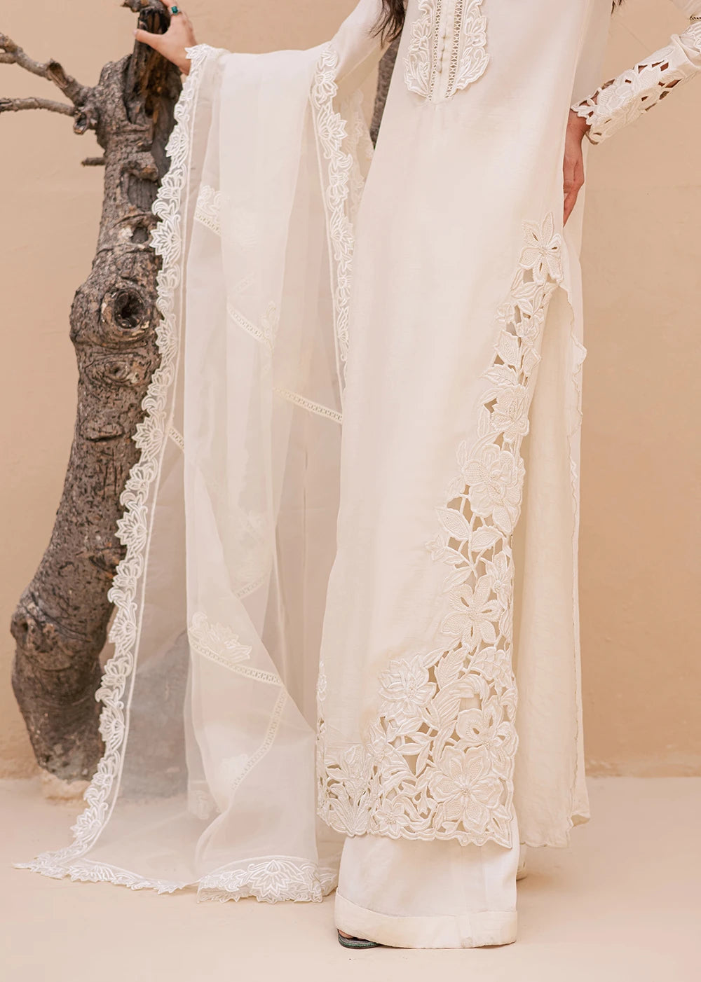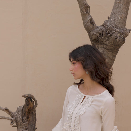 QAMAR reflects a softer kind of radiance, quiet, composed, and unmistakably refined. Cast in an ivory palette, the silhouette is shaped by intricate cutwork embroidery that traces the side and hem of the shirt, creating depth without excess. The neckline is detailed with delicate threadwork, anchoring the look with understated craftsmanship.