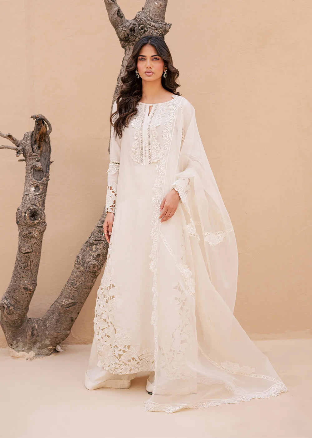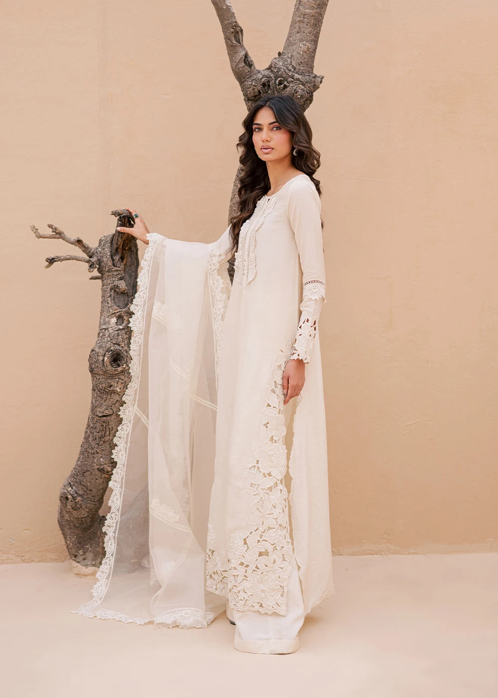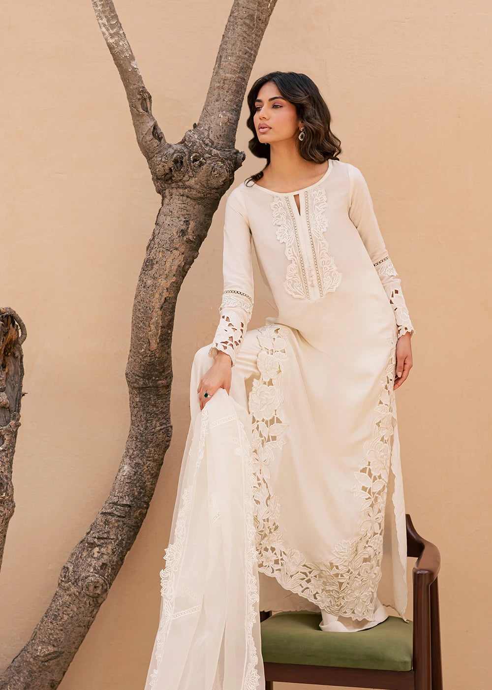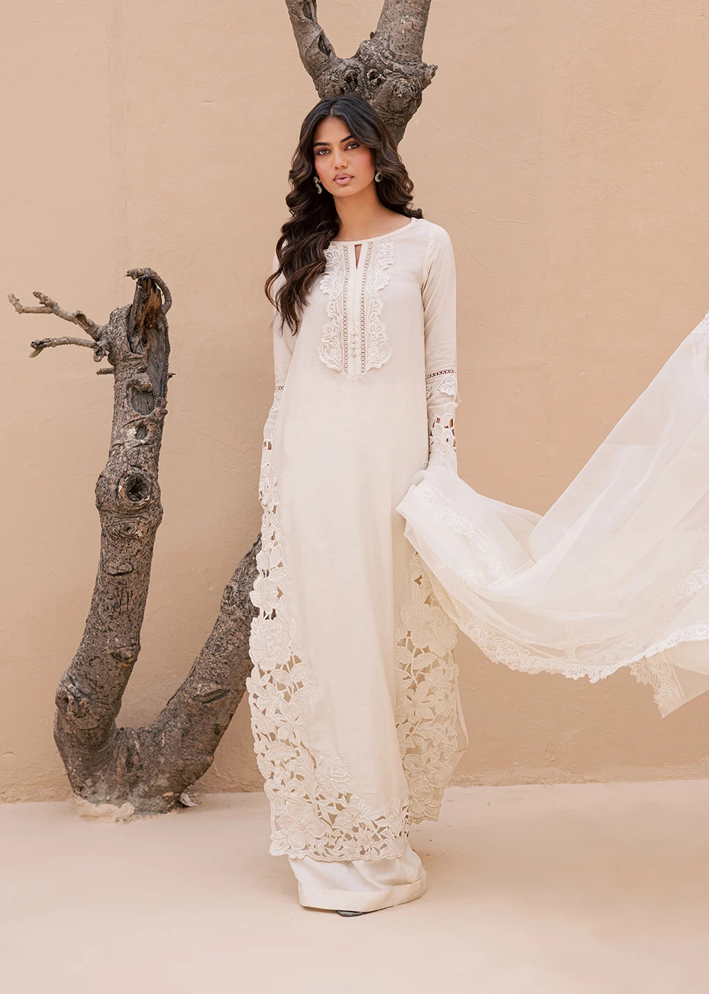 QAMAR reflects a softer kind of radiance, quiet, composed, and unmistakably refined. Cast in an ivory palette, the silhouette is shaped by intricate cutwork embroidery that traces the side and hem of the shirt, creating depth without excess. The neckline is detailed with delicate threadwork, anchoring the look with understated craftsmanship.