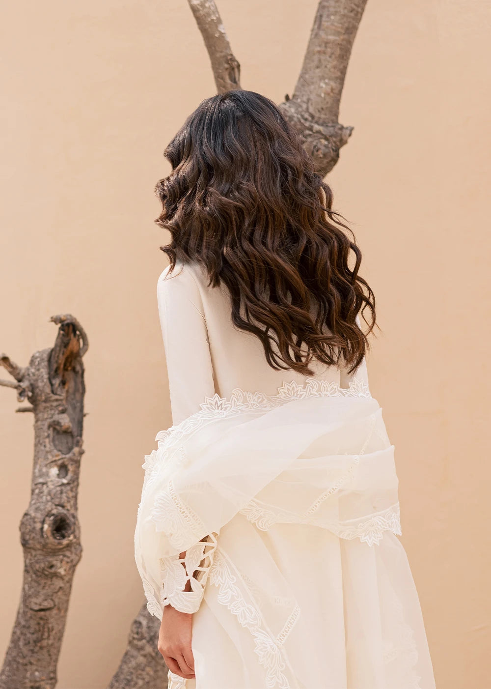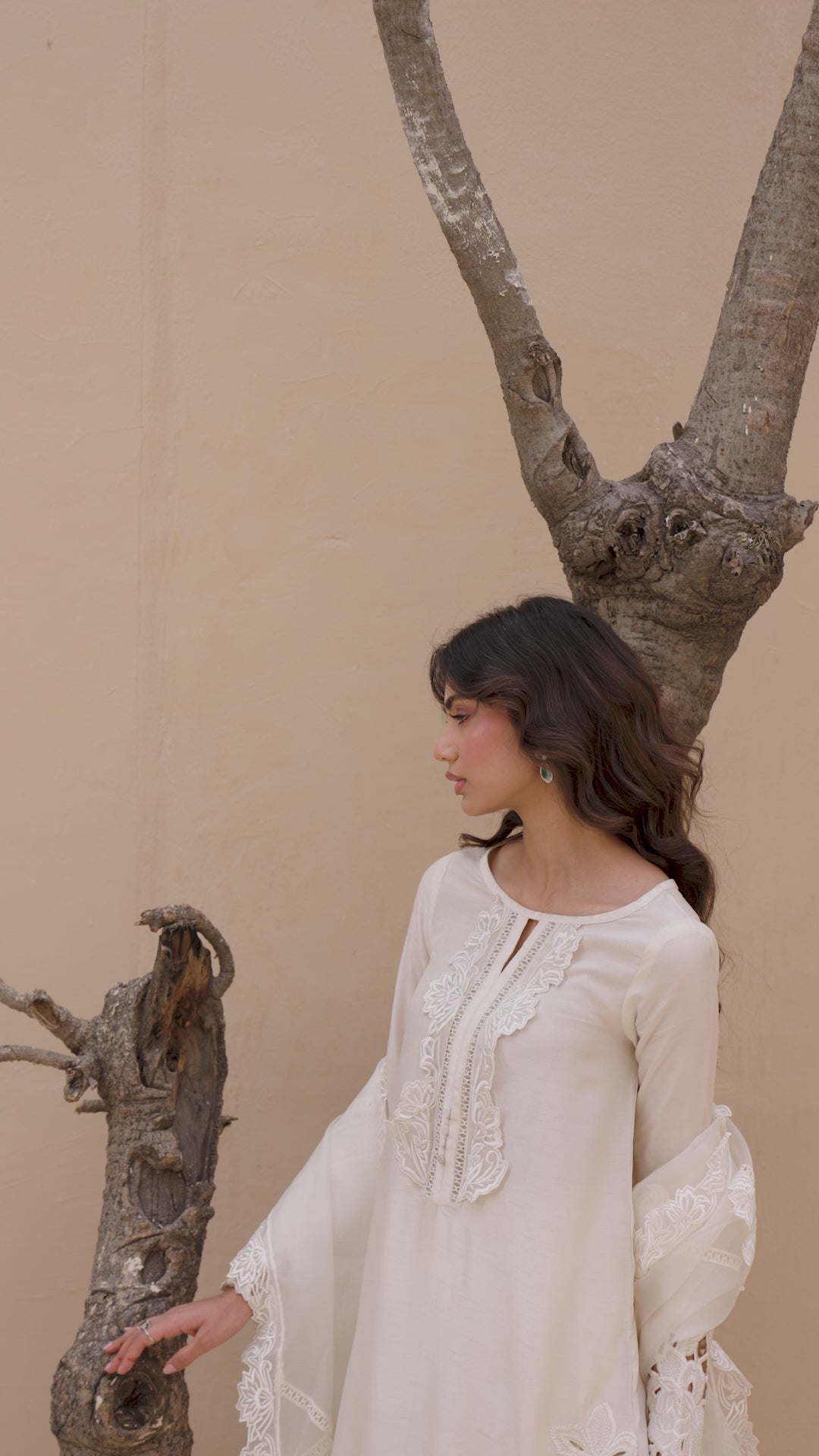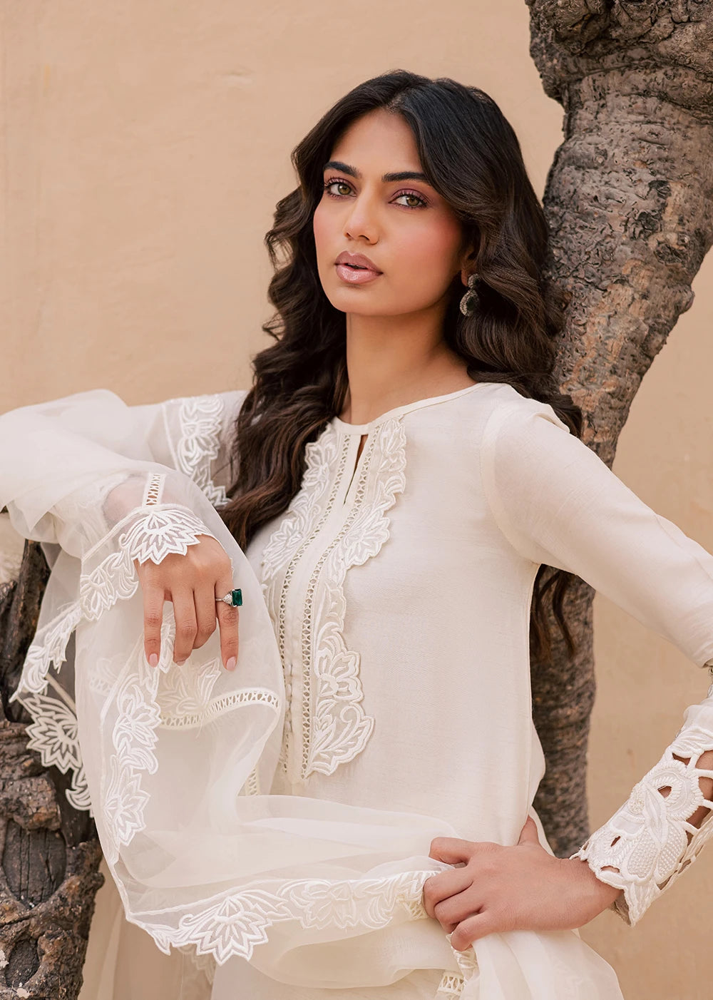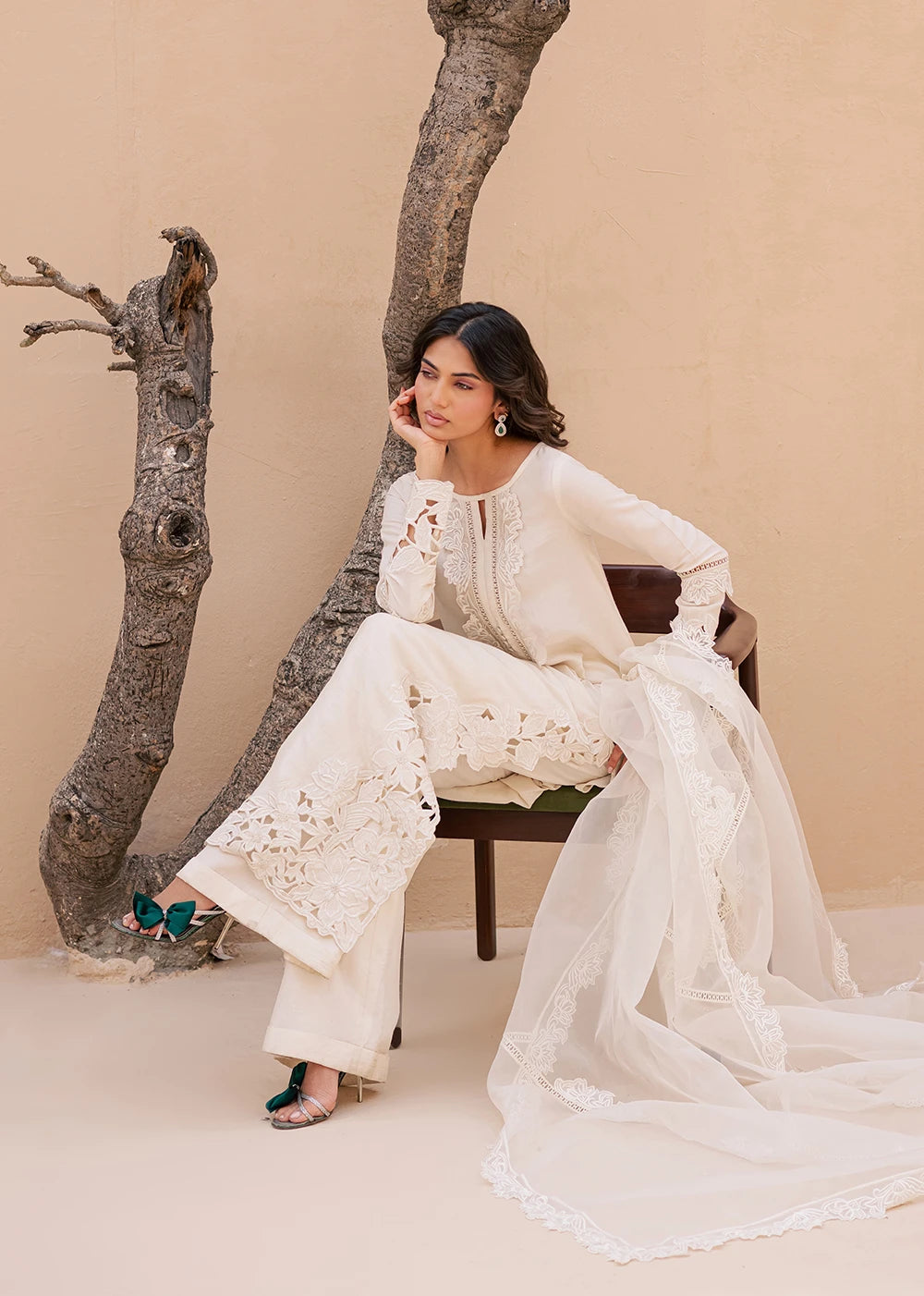 QAMAR reflects a softer kind of radiance, quiet, composed, and unmistakably refined. Cast in an ivory palette, the silhouette is shaped by intricate cutwork embroidery that traces the side and hem of the shirt, creating depth without excess. The neckline is detailed with delicate threadwork, anchoring the look with understated craftsmanship.