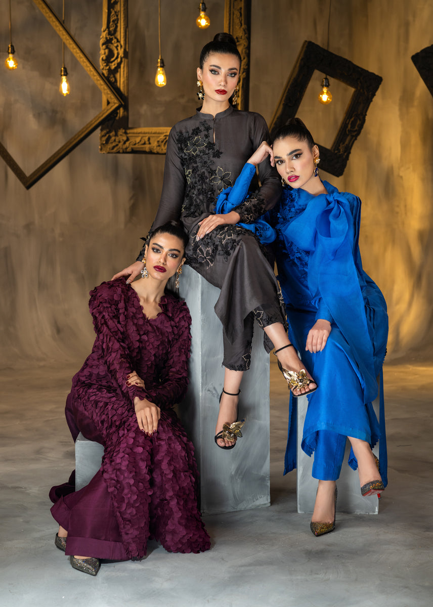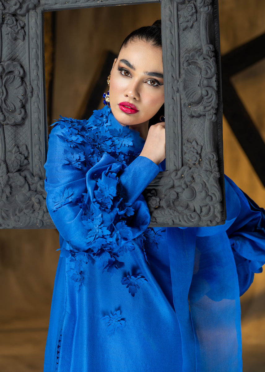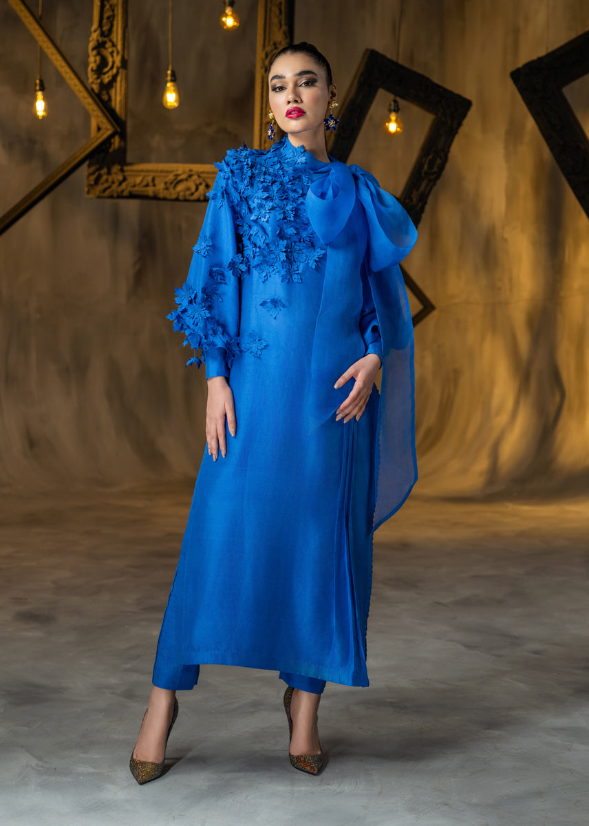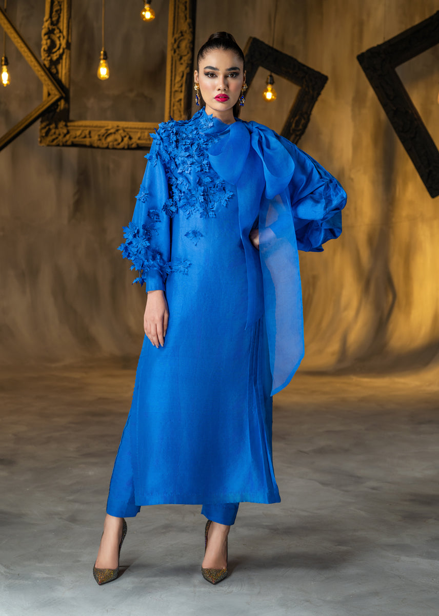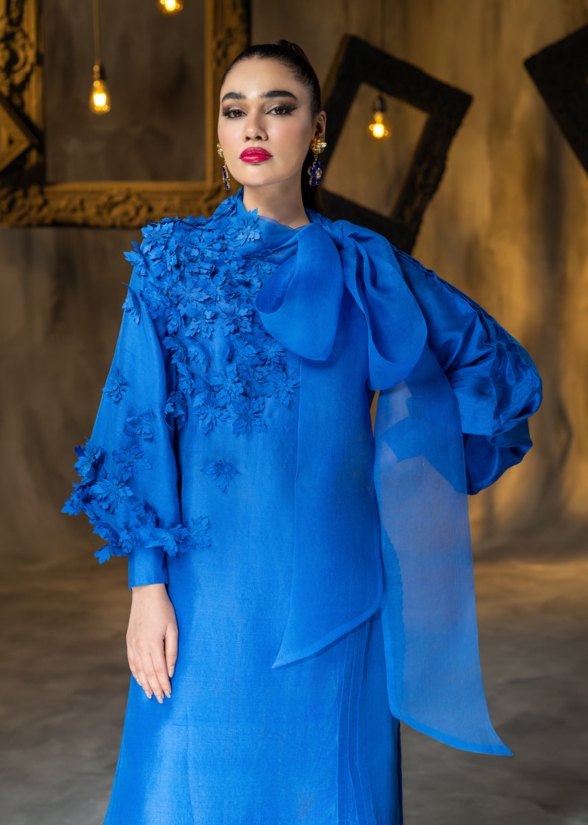Rosalia is an exotic Egyptian blue coloured outfit in pure silk that is adorned aesthetically with quintessential handcut flowers delicately placed in bunches on the neckline and sleeve elevating a sense of style in the shirt. The illustrious organza scarf bow sits comfortably on the nape making it a must-have ensemble for an array of festivities this summer season. The look is sealed with pure silk tapered pants.