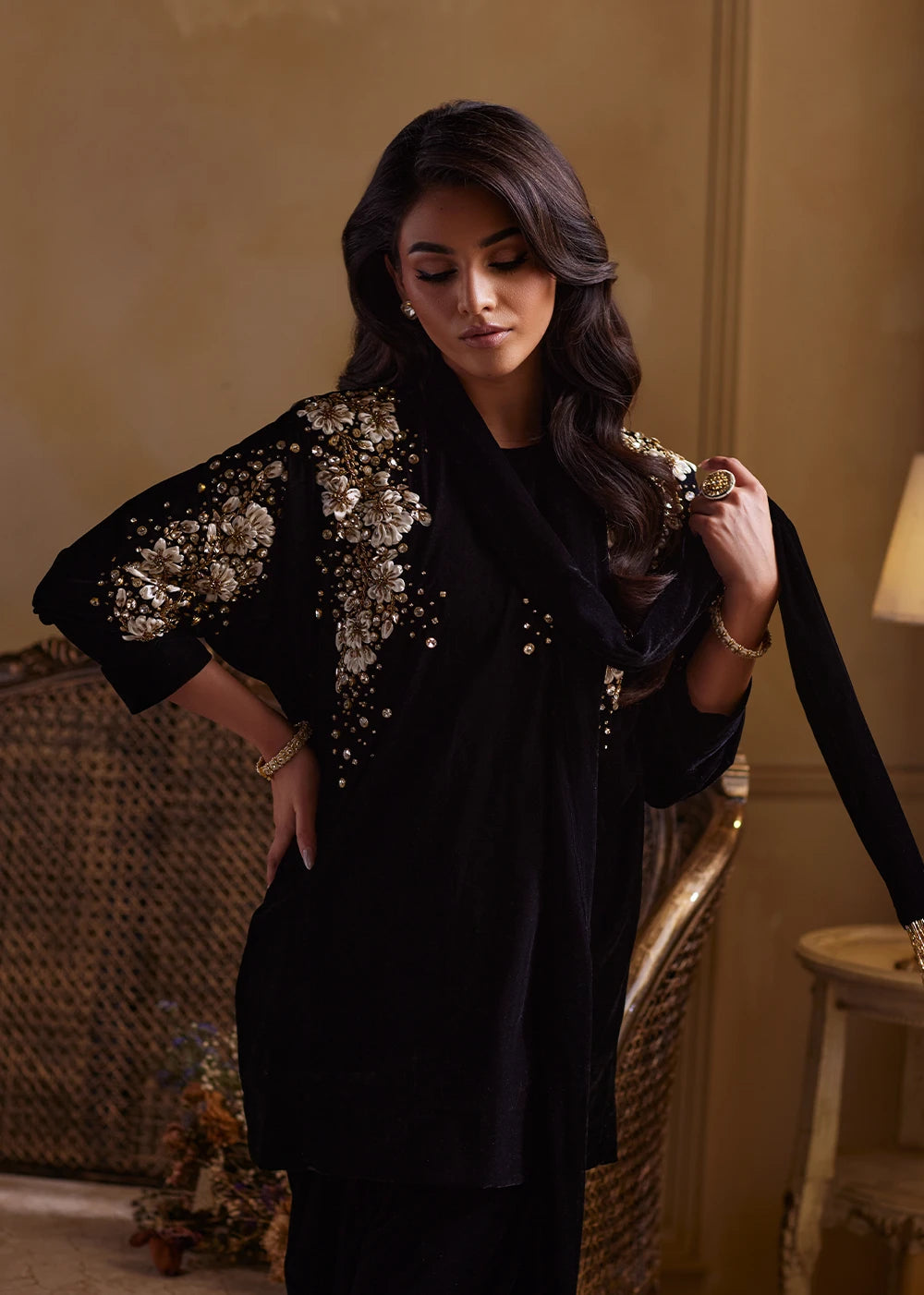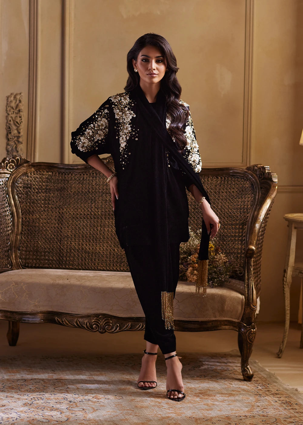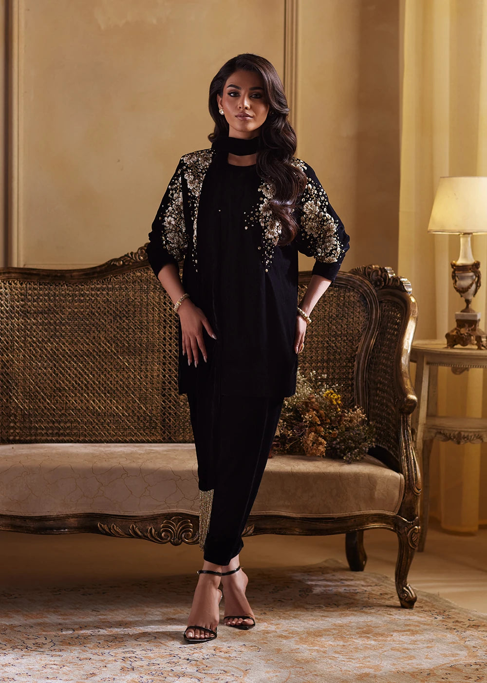 Shadowlark moves in the quiet poetry of black velvet, rich, dusky, and impossibly soft to the eye. The silhouette begins with a short velvet shirt, paired with a sleek tapered shalwar that lengthens and sharpens the form, giving the ensemble a contemporary, sculpted finish. The black velvet base holds its depth like shadow, while ribbon and gold embellishment sweeps across the front in sharp, glimmering formations, echoing the flight of a bird rising through moonlit air. Each reflective motif adds rhythm without noise, grace without softness..Shadow Lark’s stole dupatta completes the ensemble like the final stroke of a nocturnal painting. Its hanging tassels add dimension and cadence as you move. Nothing is excessive, everything is intentional.