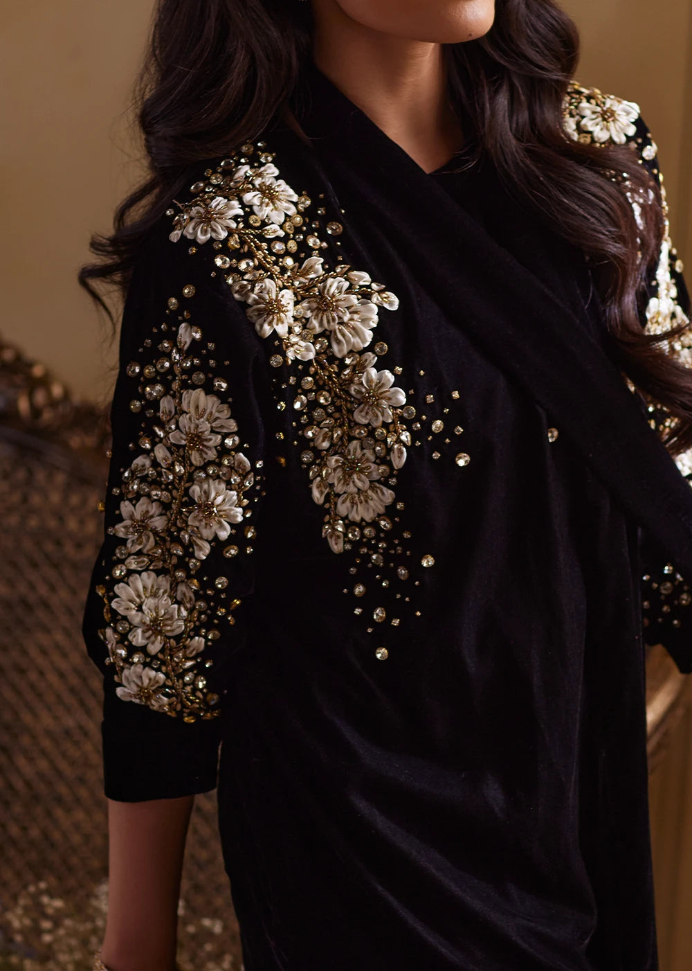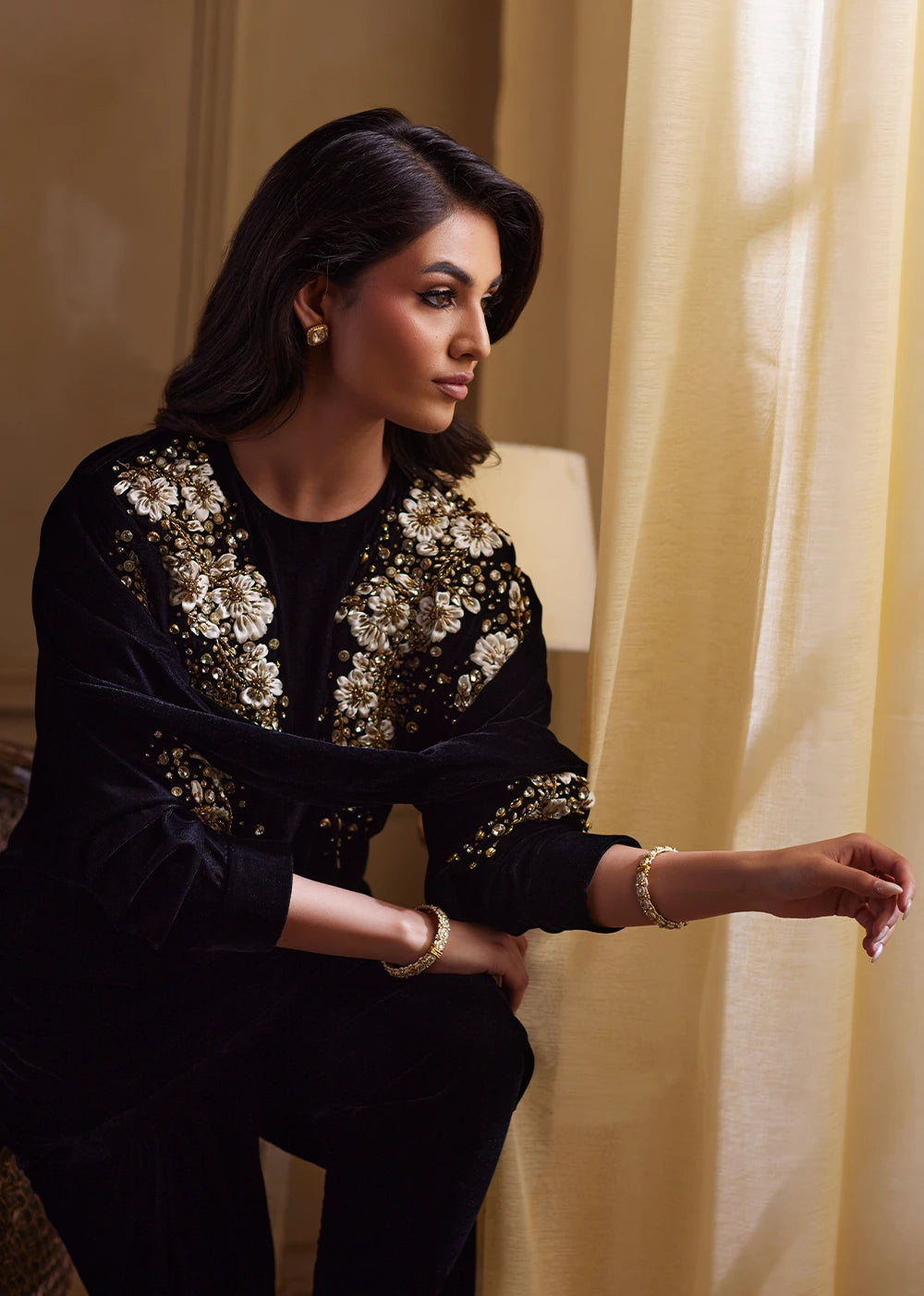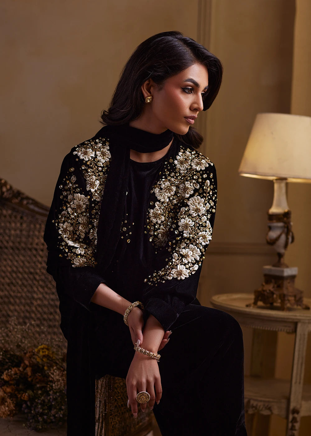 Shadowlark moves in the quiet poetry of black velvet, rich, dusky, and impossibly soft to the eye. The silhouette begins with a short velvet shirt, paired with a sleek tapered shalwar that lengthens and sharpens the form, giving the ensemble a contemporary, sculpted finish. The black velvet base holds its depth like shadow, while ribbon and gold embellishment sweeps across the front in sharp, glimmering formations, echoing the flight of a bird rising through moonlit air. Each reflective motif adds rhythm without noise, grace without softness..Shadow Lark’s stole dupatta completes the ensemble like the final stroke of a nocturnal painting. Its hanging tassels add dimension and cadence as you move. Nothing is excessive, everything is intentional.