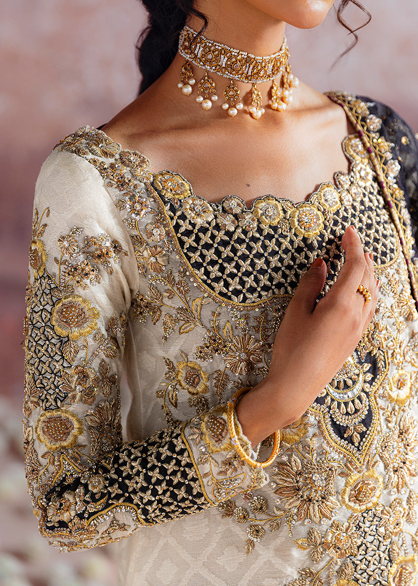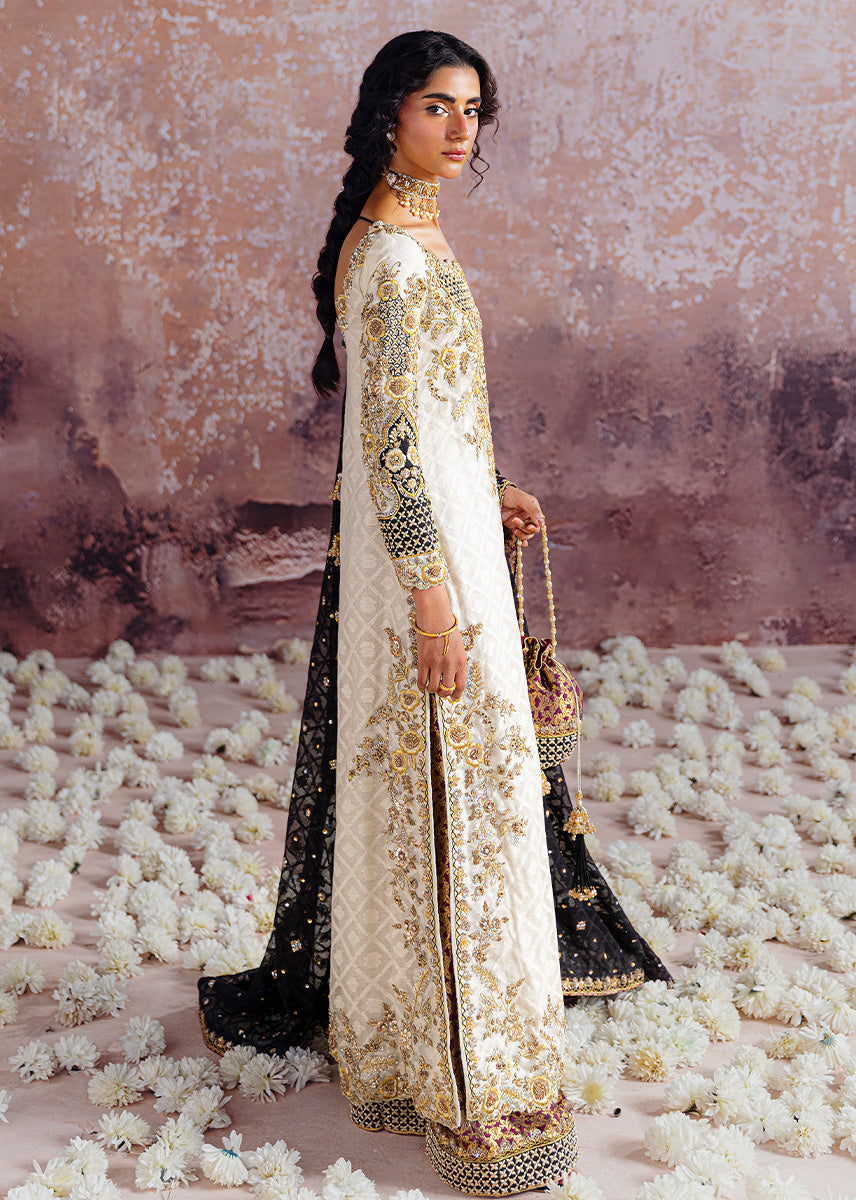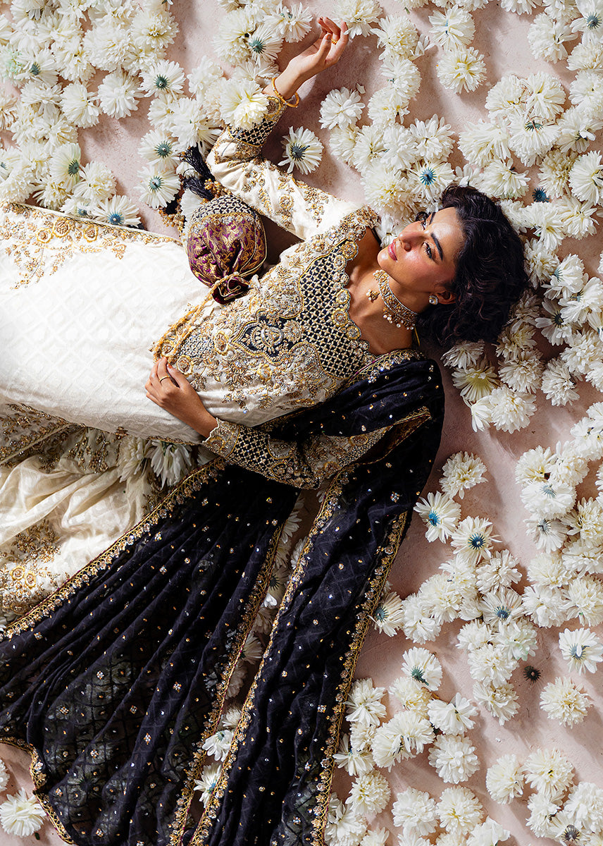 Siyah Ayin is a dialogue of opposites of light and shadow, purity and depth. The long ivory silhouette, patterned in subtle lattice textures, becomes a canvas for antique gold embellishment inscribed with the precision of sacred artistry.