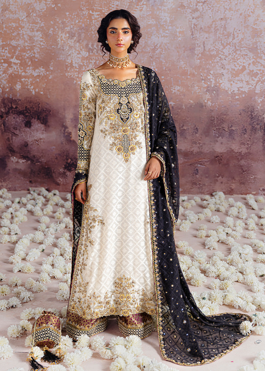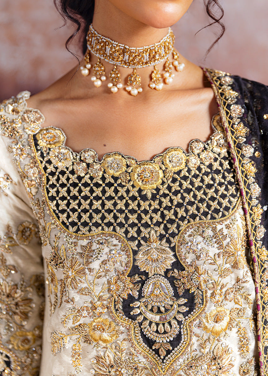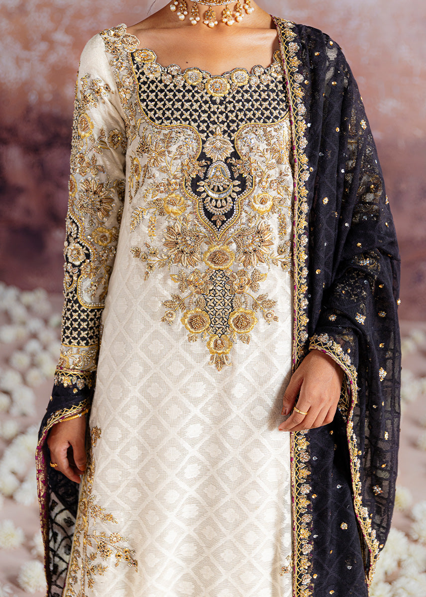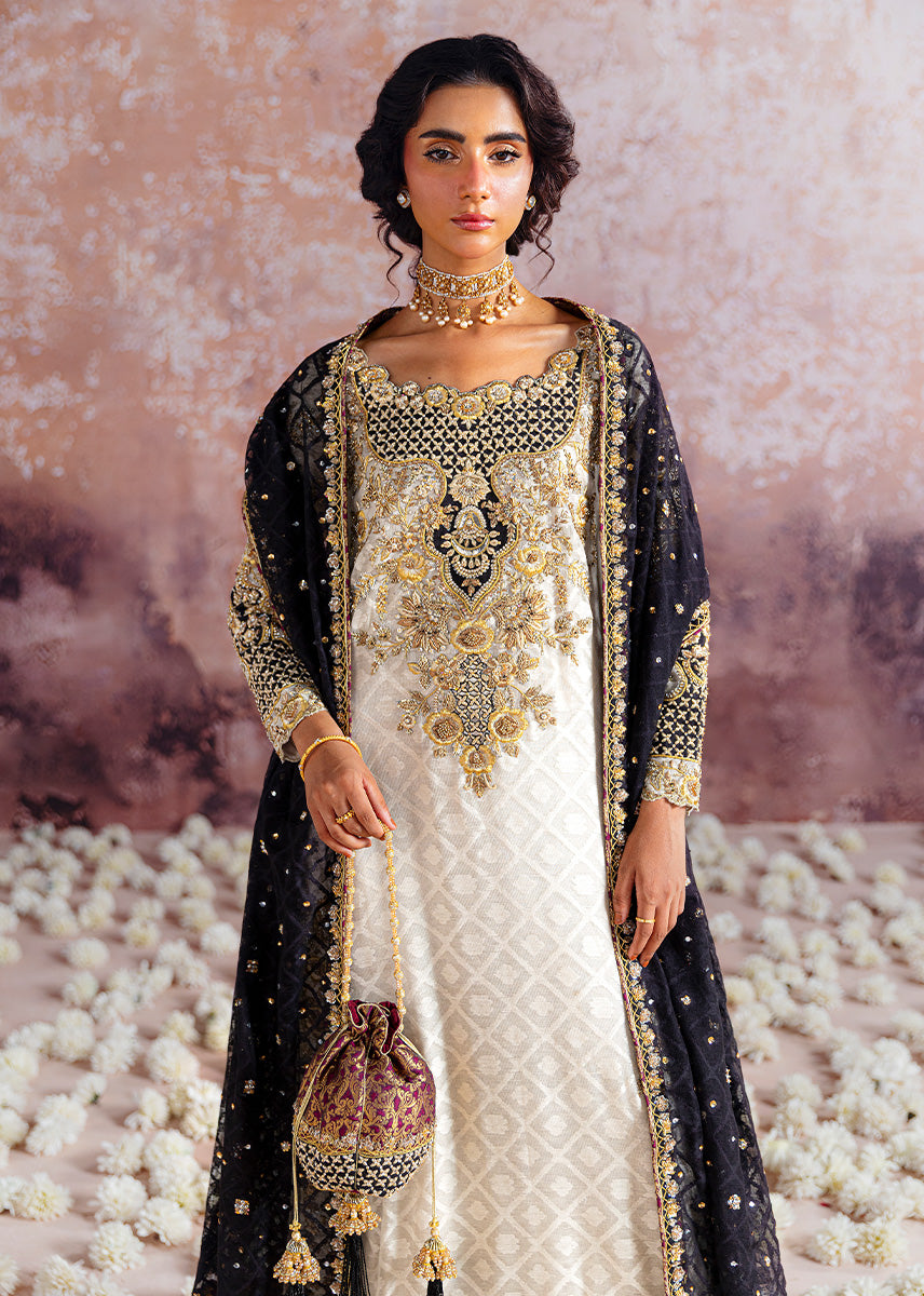 Siyah Ayin is a dialogue of opposites of light and shadow, purity and depth. The long ivory silhouette, patterned in subtle lattice textures, becomes a canvas for antique gold embellishment inscribed with the precision of sacred artistry.