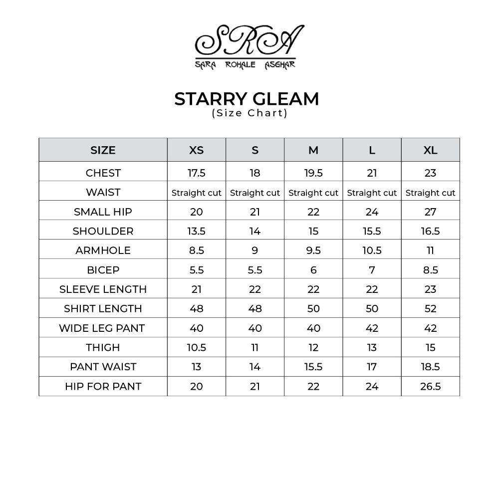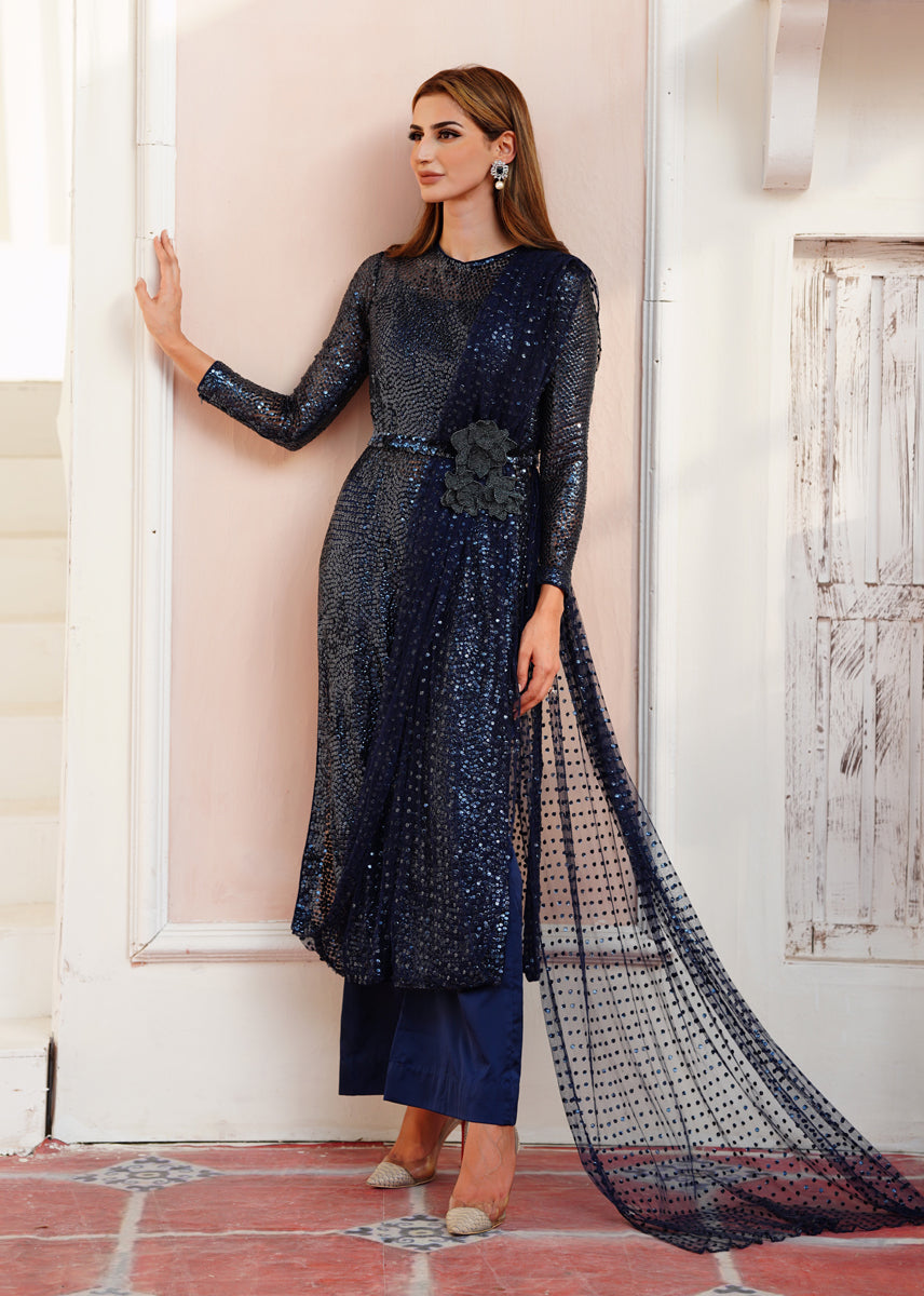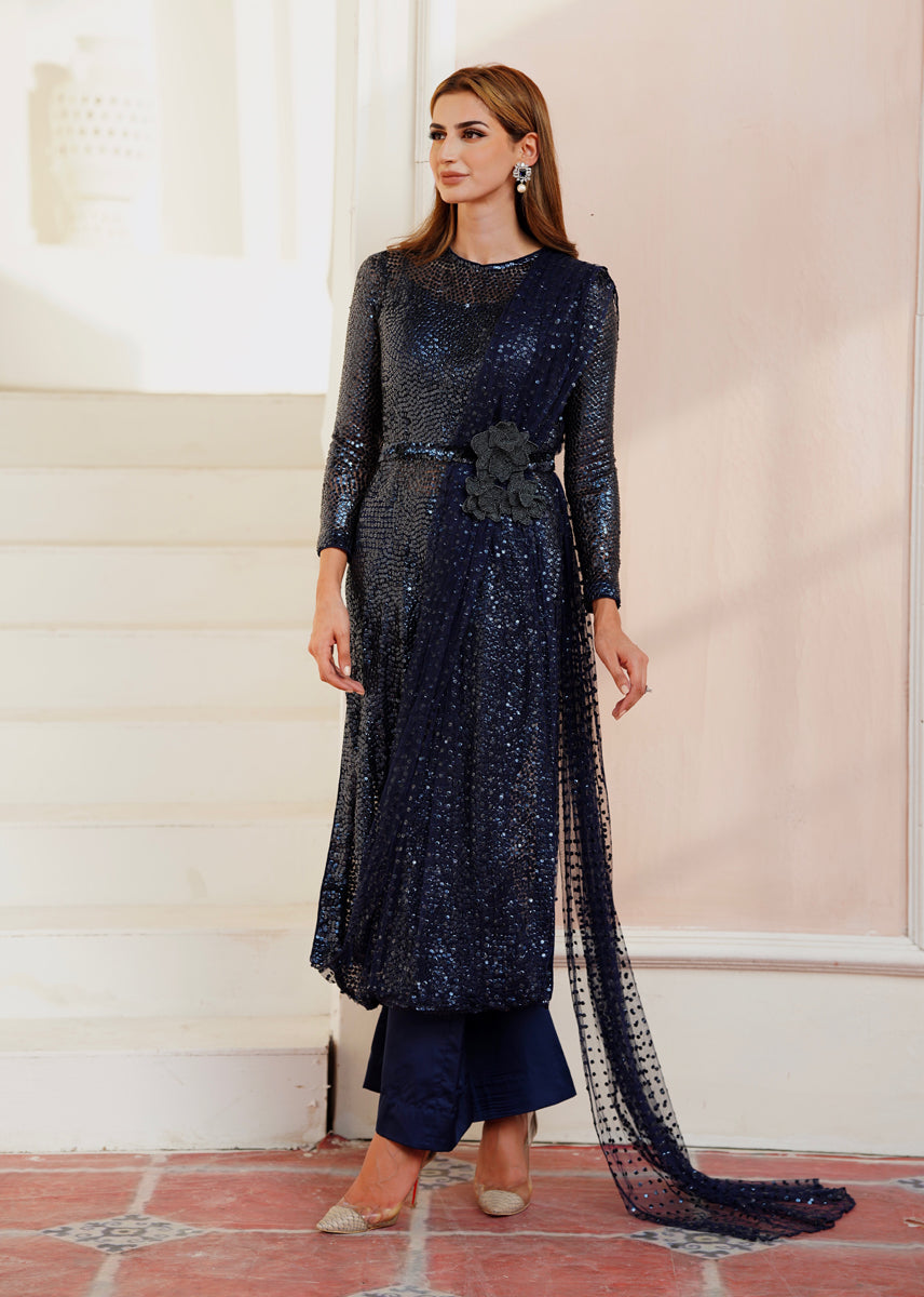 Net shirt sprawled with hand laiden sequins resemble the gleam of a starry night, an attached dupatta with the shirt draped over the shoulder gives it a sleek and alluring look and the hand curated flower motives sitting on the waist belt hold the ensemble together.