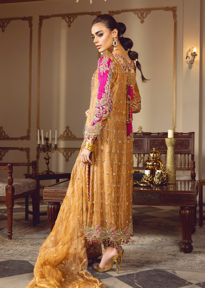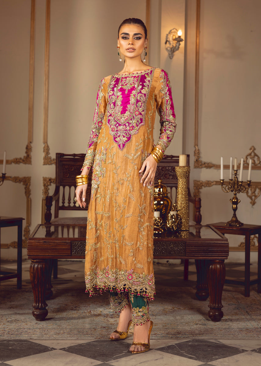 In the dimly lit room, SULTANIQUE emerges like a spectral bloom created with pure tissue in pale tangerine tone adorned with ethereal floral motifs paying homage to tales of ancient traditions.
