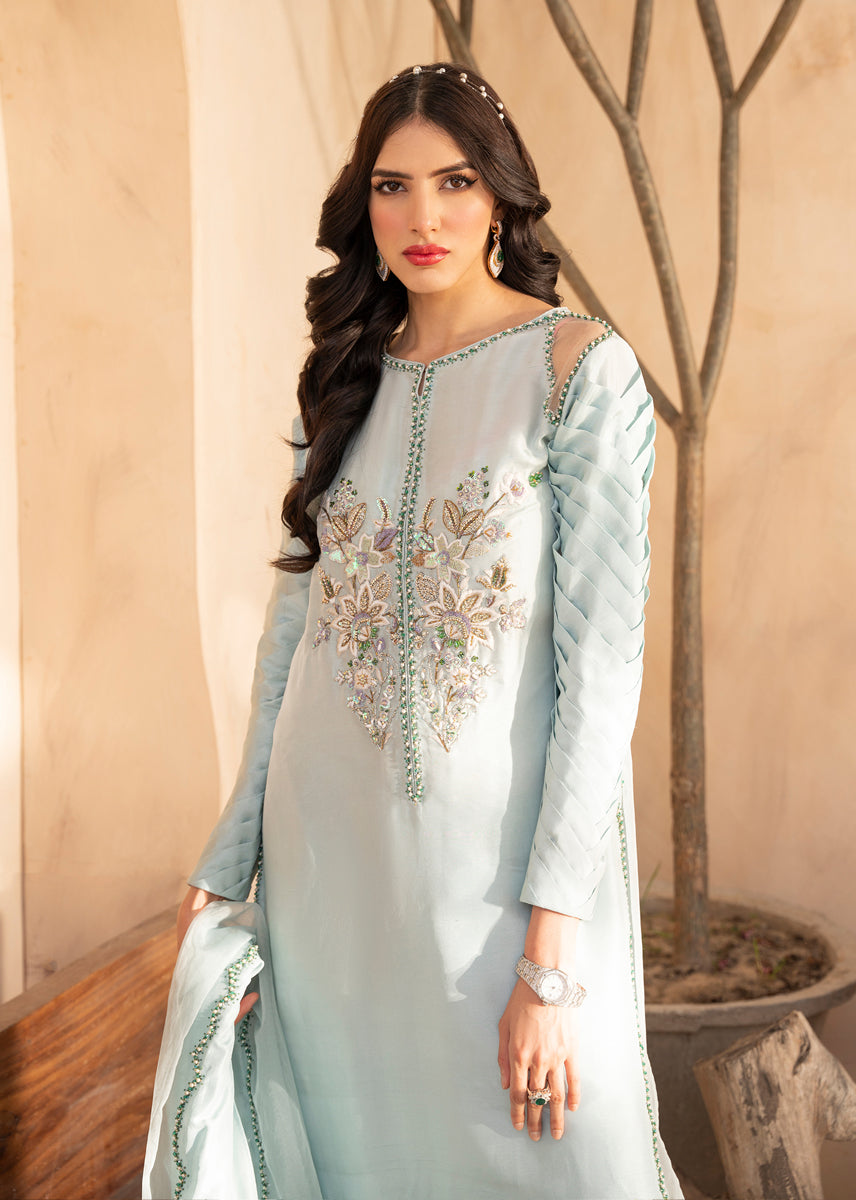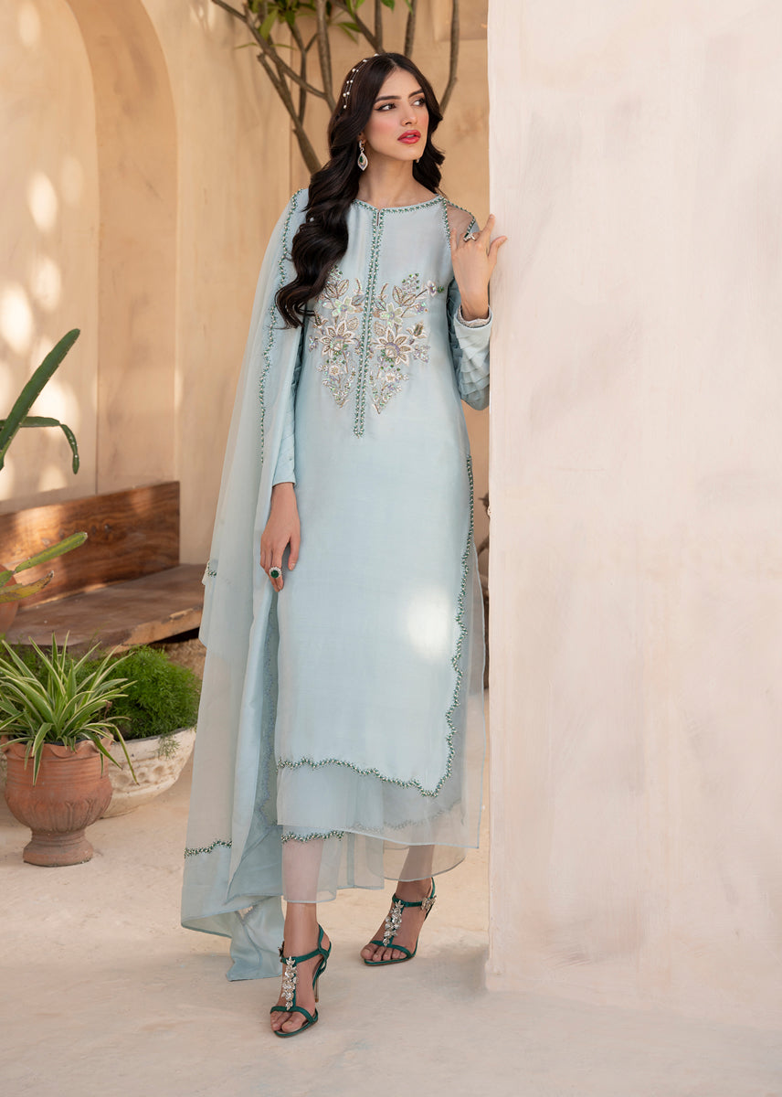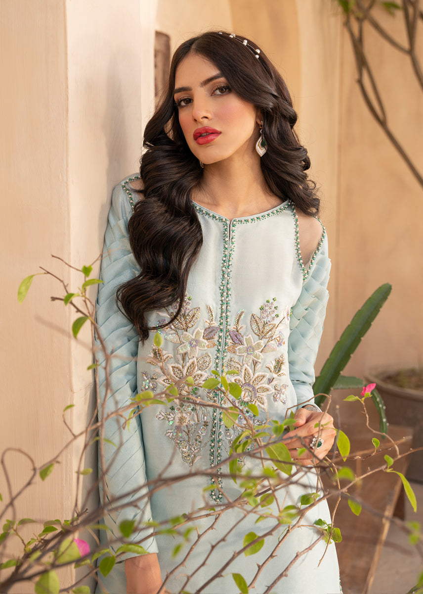 The beautiful ensemble is curated from pure silk. Floral hand embroidered motives sit aesthetically on the front neckline.
