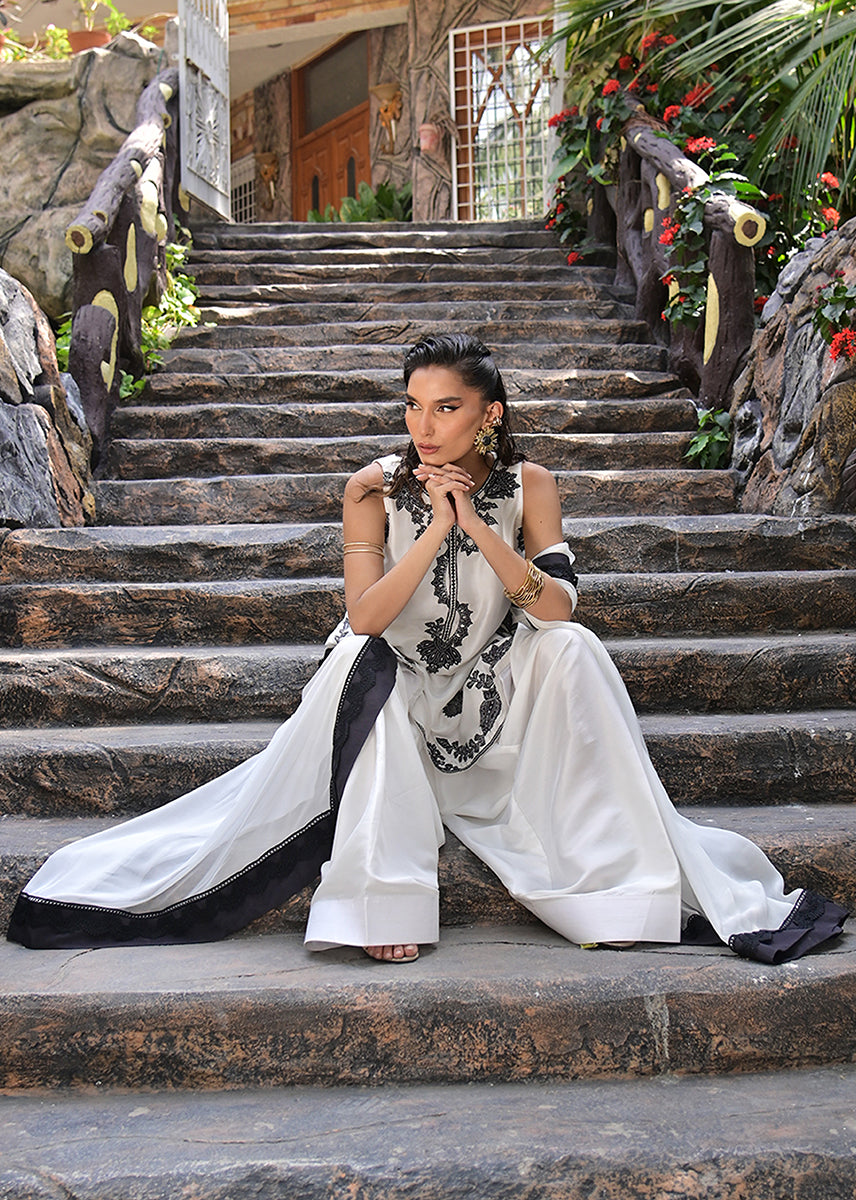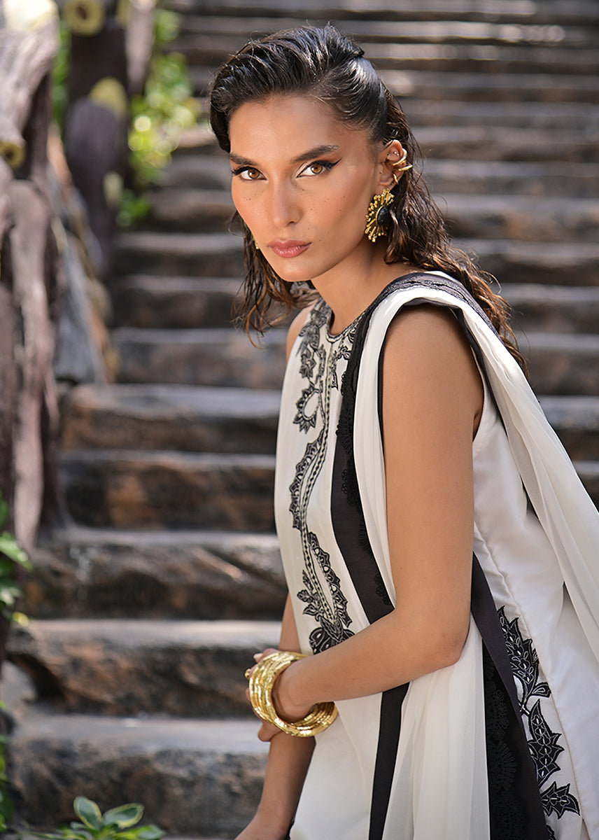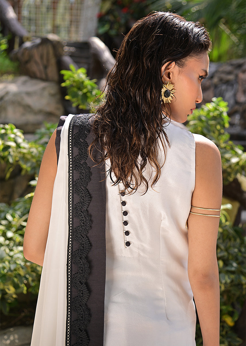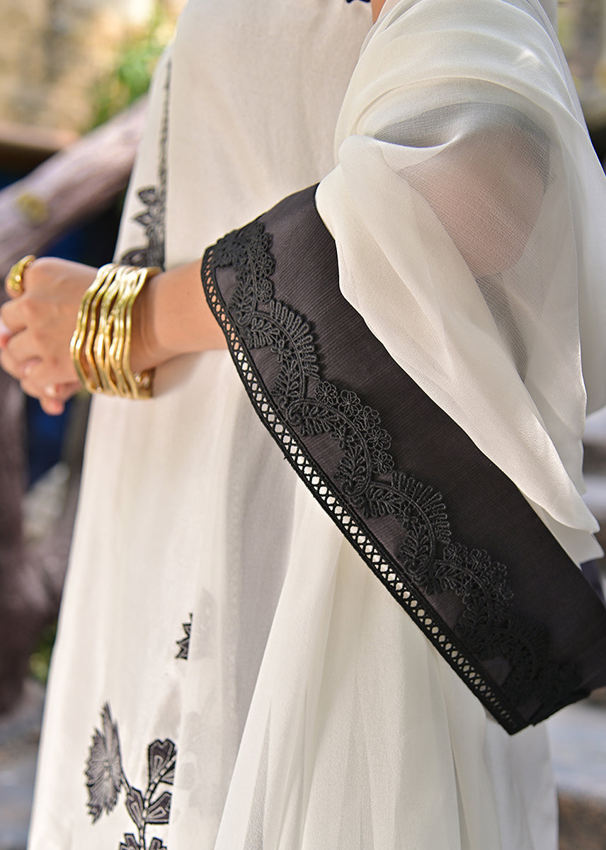 Billowing with an ethereal lightness, the pure chiffon dupatta is an exquisite murmur of fluidity. Its charcoal silk trim, layered with delicate lace, acts as a poetic punctuation to the ensemble, framing the look with a subdued grandeur. This diaphanous dupatta moves like a shadow, elusive yet impossible to ignore.