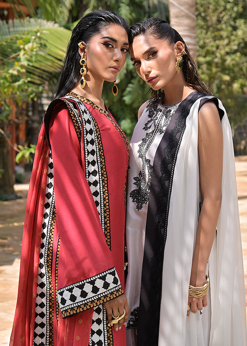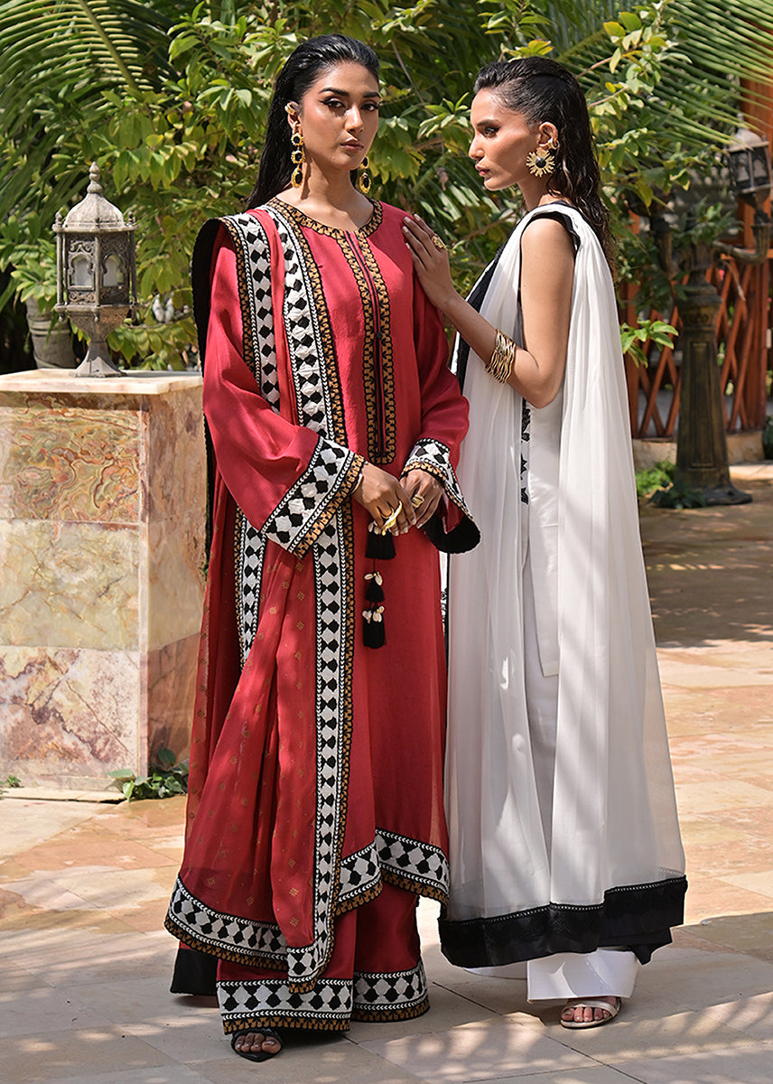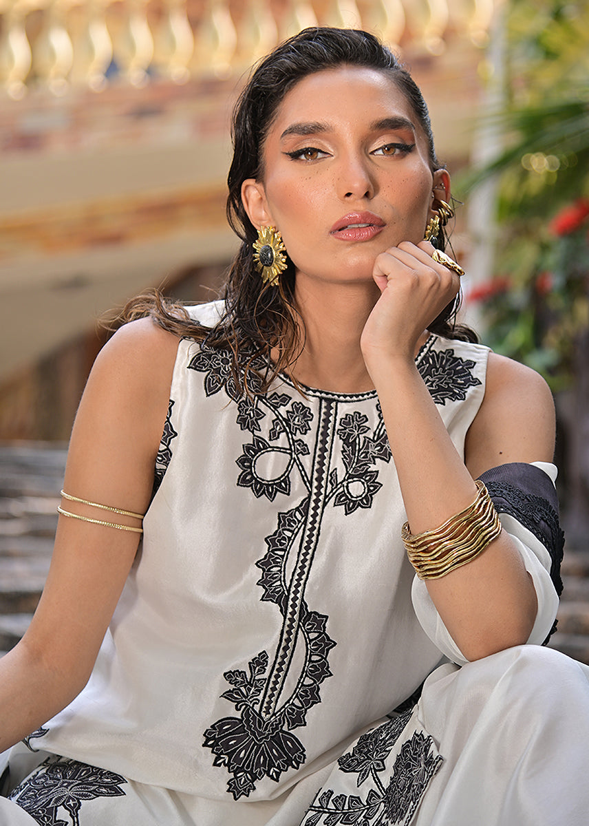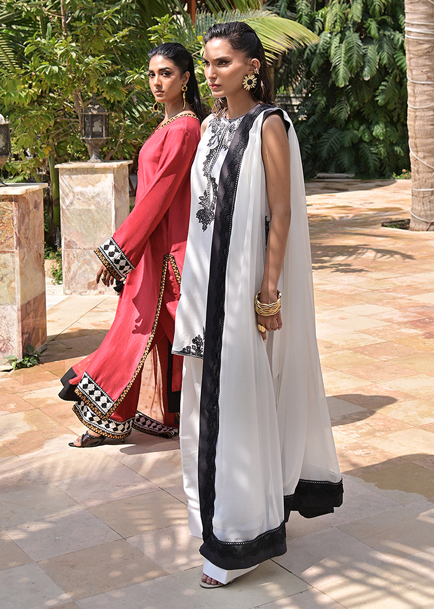 Billowing with an ethereal lightness, the pure chiffon dupatta is an exquisite murmur of fluidity. Its charcoal silk trim, layered with delicate lace, acts as a poetic punctuation to the ensemble, framing the look with a subdued grandeur. This diaphanous dupatta moves like a shadow, elusive yet impossible to ignore.