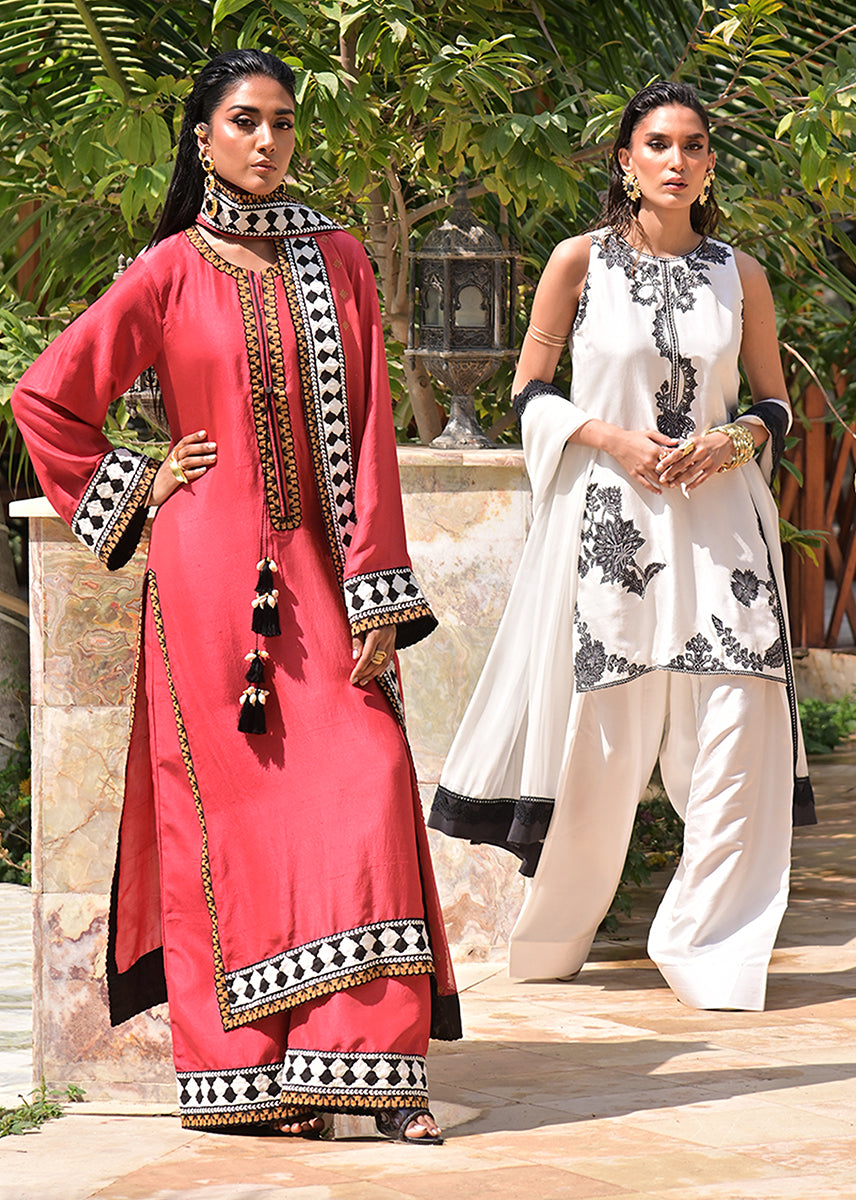 The farshi shalwar,a majestic cascade of fabric redefines volume and grace. This flowing outline brings an enthralling drama with every stride. Its exaggerated hem creates an almost cinematic movement.