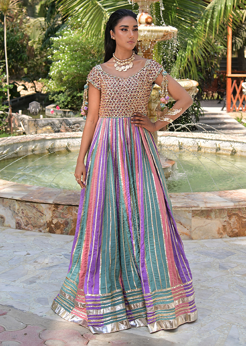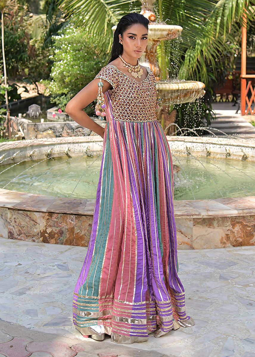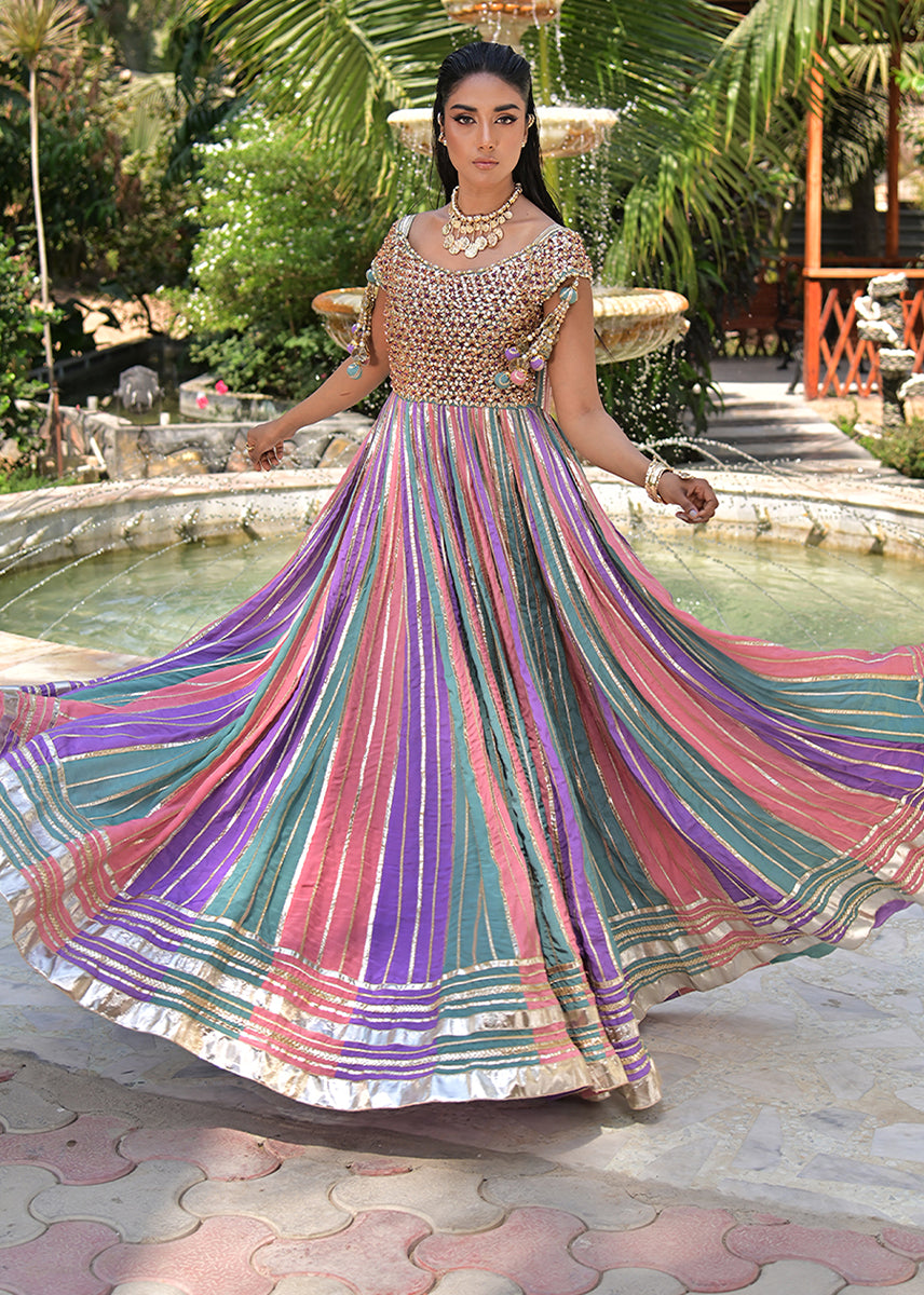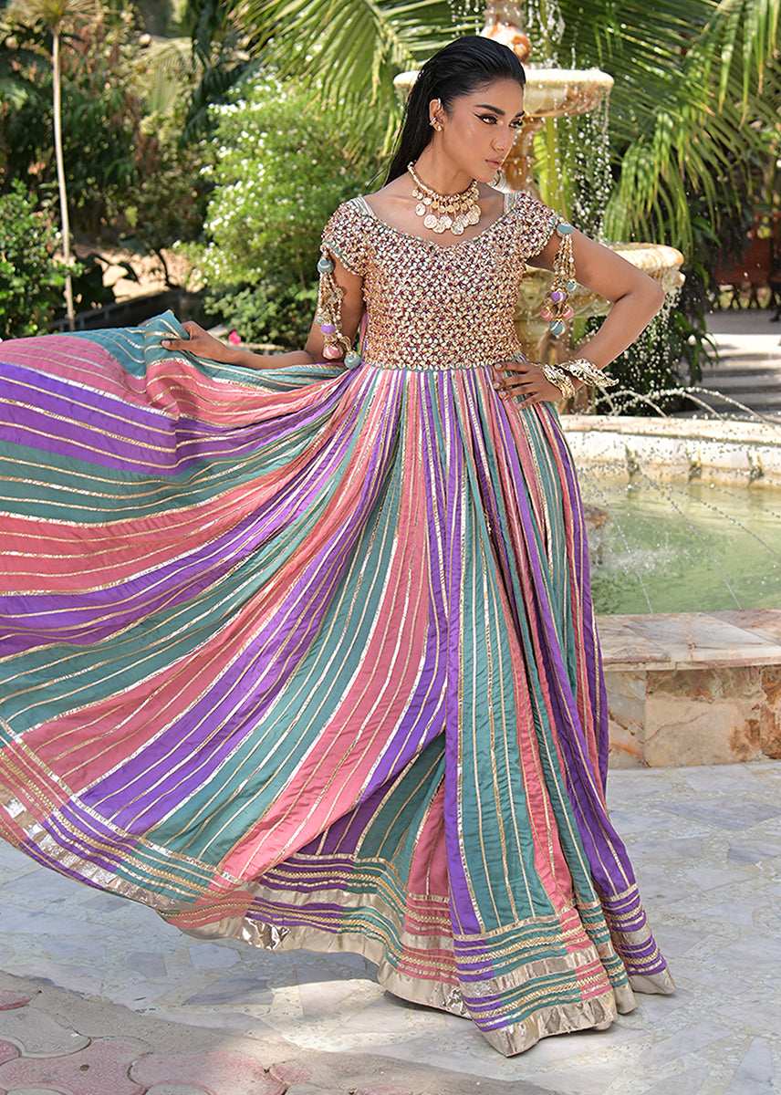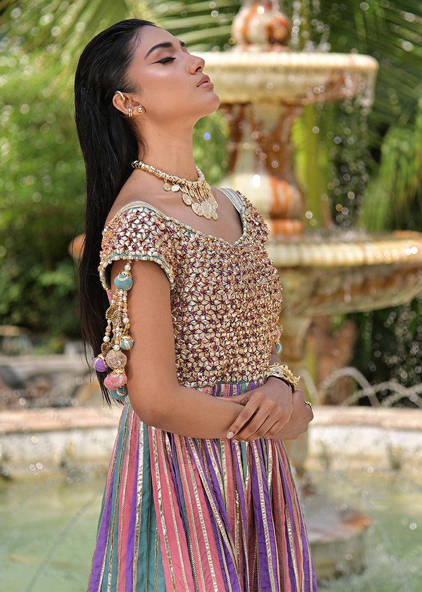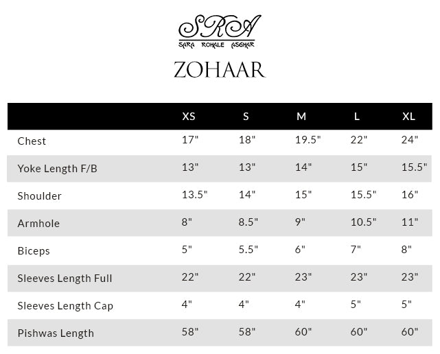 Zohaar is more than an ensemble, it is a dream spun into reality. The gota embellished yoke, glistens like molten gold, sculpting an air of imperial grace. Delicately suspended tassels adorn the sleeves, swaying with a rhythm of their own.With every step, the gota laden panels flutter like poetry in motion, their gilded accents catching the light like a painter’s brushstrokes across the sky, creating an illusion of heavenly radiance. The luxurious border in intricate gota work, anchors the ensemble in theatrical finery that ensures the wearer is nothing short of a vision,a waltz of tradition designed for the woman who doesn’t merely walk but glides through history, draped in the golden aura of legend.